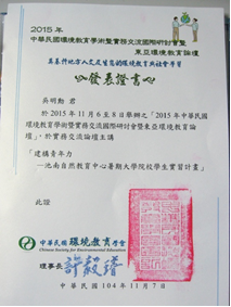 於研討會中發表環境教育研究結果並作實務經驗分享,篇題如下: 林務局自然教育中心環境教育教師軟性職能成長困境與突破 林務局自然教育中心環境教育教師硬性職能發展歷程探索 花蓮民眾對林務局山林管理議題之態度調查 池南自然教育中心暑期大學院校學生實習計畫