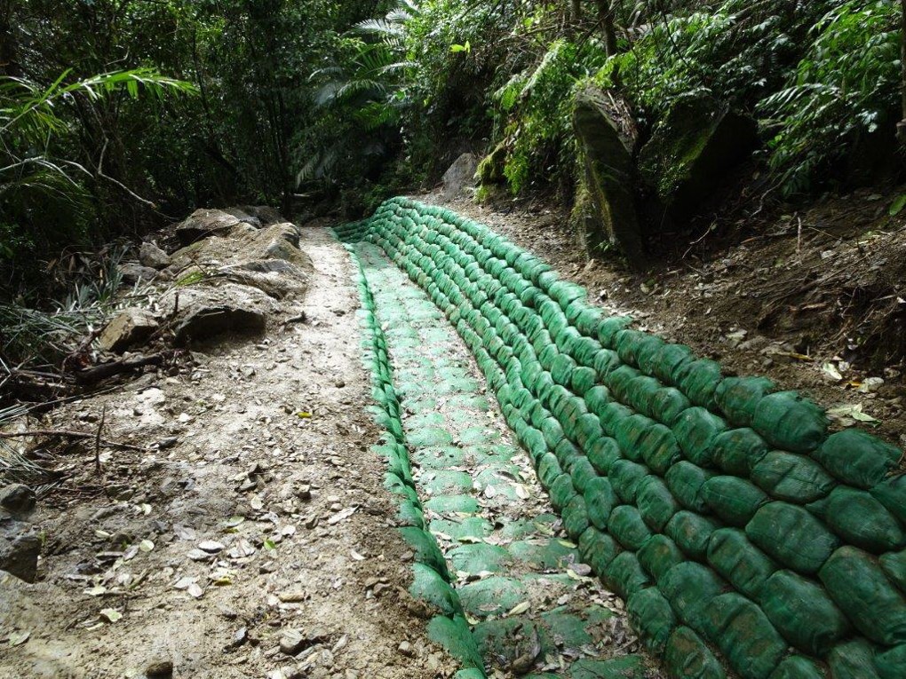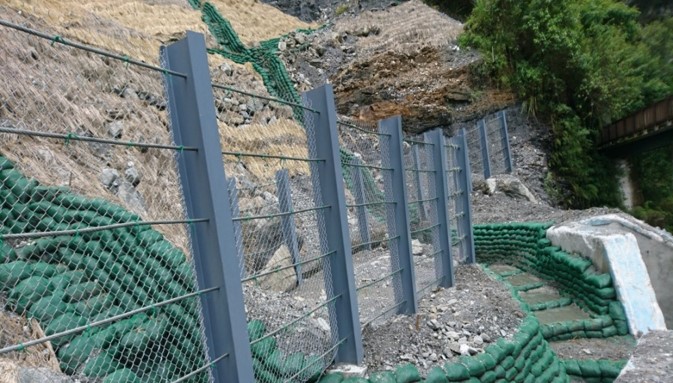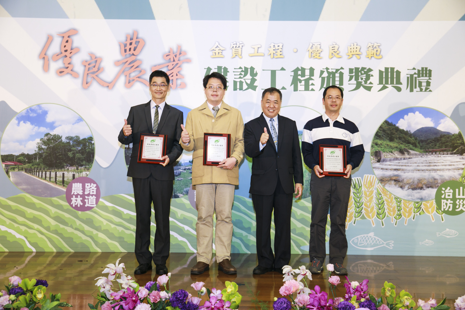 治山防災類-富源溪崩塌地處理工程榮獲107年度優良農建評選為「優等工程」。因該崩塌地尚未穩定又天候異常且常有強降雨情形發生,造成地表逕流匯集產生多條蝕溝,致使坡面表層土石崩塌等災情出現。本工程設計理念為以小規模整坡取代之字形開階、柔性土包袋溝取代噴漿溝、防落石柵與植栽取代橋墩保護工等措施,其中土包袋溝是考量坡面不穩定地質特性及過去災害歷史與工程經濟等因素,以柔性排水系統,克服軟弱地層,排除逕流水並將致災土砂轉變成治理材料來源,達節能減碳之效,另整坡開階、坡面植栽、雙重防護網,達成治理目標。預期效益為植生復育坡面2公頃、防制土砂3萬立方、下方步道300公尺及65,000人/年遊客。