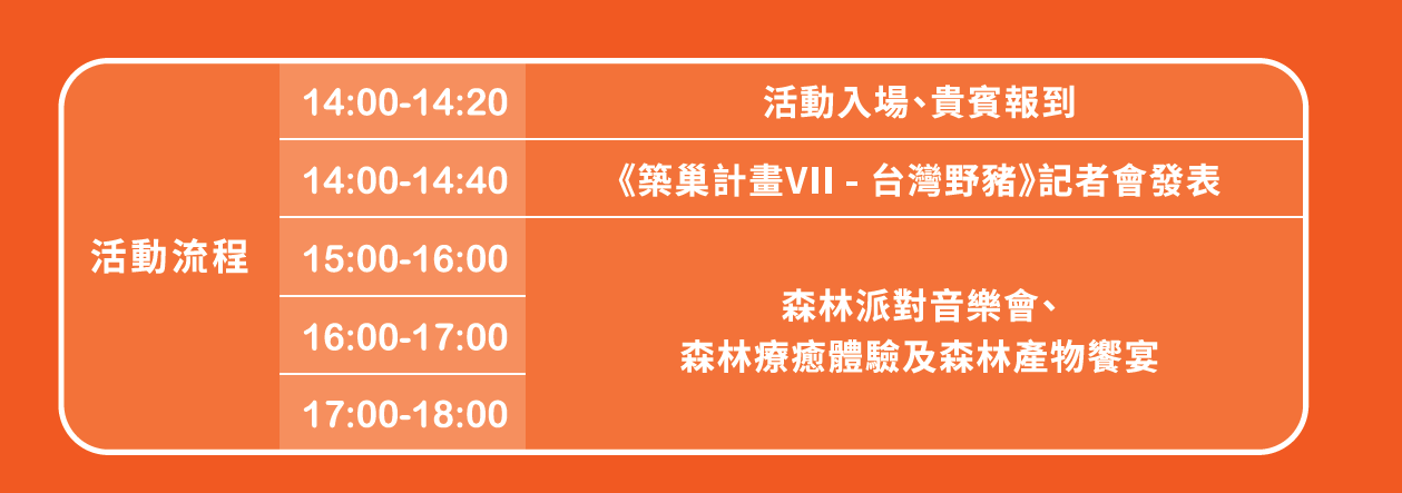 花蓮首度國產竹木大型裝置藝術啟用 林業及自然保育署花蓮分署採用國產木竹材料,由藝術家范承宗設計打造,以向自然界動物建築師學習築巢為精神,架接人們與生物之共生關係與地方特有文化視角,製作大農大富平地森林園區《築巢VII-台灣野豬》將於9月14日(星期六)正式啟用,主要為推廣竹、木材建構具美觀且可展現園區野生動物特性之裝置藝術作品,增添園區特色據點及作為森林療癒基地,並彰顥人與自然和諧共處的智慧與理念。 大農大富平地森林園區是台灣首座平地森林園區,串聯國土綠網的重要生態廊道。此園區與周邊部落及社區共同生活,共享生態惠益。花蓮分署長黃群策指出,台灣野豬裝置藝術的啟用儀式以「打包森林:築巢派對」為主題,旨在串聯馬遠布農族群生態旅遊與太巴塱部落美食,整合各單位及部落力量,辦理大型活動,未來也將成為林業保育署花蓮分署與周邊社區、地方及部落的連結點。 結合馬遠部落與太巴塱部落,森林限定派對 「打包森林:築巢派對」活動包括「森林派對音樂會」、「森林療癒體驗」及「森林產物饗宴」三大部分: 第一部分:「森林派對音樂會」-邀請了馬遠部落的醇厚男聲歌手馬詠恩與布農族人結合當代、古調與部落記憶的歌謠;三人編制樂團—牛角坑,帶來結合身體感覺的打擊,吹管,撥弦樂器的合奏;DJ Tam將運用森林中的聲響,融合在DJ曲目的編排中。三組全然不同型態的音樂,與森林環境之中聲響的交織,絕對迷人。 第二部分:「森林療癒體驗」-則由森林療癒師及外部專家帶來三場療癒課程:首先是「頌缽及嬋柔」,引導民眾在練習中延展與探索身體空間;其次是「我生命中的一棵樹:腎蕨花環製作」,從認識腎蕨到製作花環,增進對自身的覺察與照顧;最後是「哈腓拉傳承工作坊」,分享月桃在原民生活中的多樣用途,包括手環製作。 三場多元型態的森林療癒體驗將在9月3日上午10時開放民眾免費報名,每場次20名( https://forms.gle/Psv8fYTfYiNCuQYo6 ) 第三部分:「森林產物饗宴」-邀請光復的原民法式料理—阿樂樂代設計客製菜單,運用太巴塱紅糯米、刺蔥、蝸牛、月桃、馬告、土肉桂、富興鳳梨、荖葉與洗酪等等當地特色食材,結合西式烹調手法,打造多種風味的菜單,彰顯地方特色,提供給來到森林裡的民眾。 林業及自然保育署花蓮分署長期提倡環保,推廣國產木材與竹材。本次活動呼應其對永續、環保及森林綠網的關注,融合森林產物與多元族群文化,將森林的魅力與永續理念傳遞給大眾,期望民眾能以自身行為重視並體驗這些價值。 活動相關信息可參見「大農大富平地森林園區」臉書粉絲專頁,體驗活動報名及諮詢請聯絡林小姐,電話0963017515。