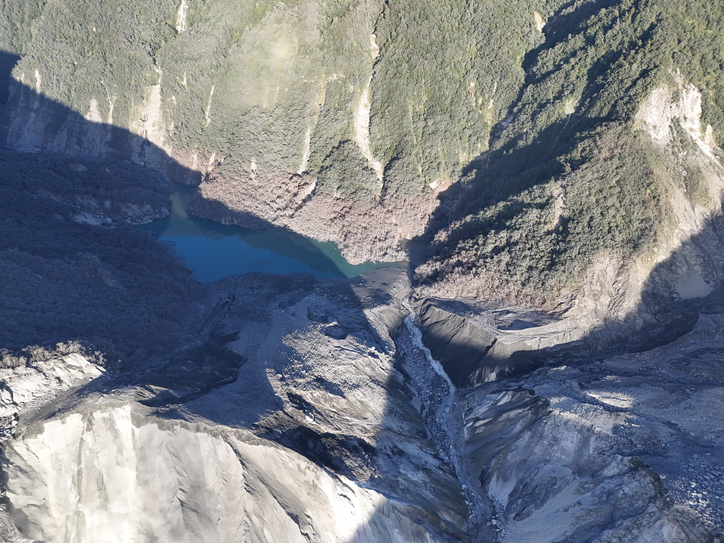 一、今(10/1)上午7時由無人機航拍顯示,馬太鞍溪堰塞湖水位1020.3公尺,湖區面積12.6公頃,蓄水量585萬噸,潰決後至今水位高程已下降118.7公尺,蓄水量持續減少,約為原來量體之6.4%。 二、天然壩體及水流無異狀,湖水持續從溢流口穩定流出;考量仍有水量持續匯入湖區,「下游土砂狀況尚未穩定,」目前仍維持紅色警戒。 [照片說明] 114年10月1日上午空拍堰塞湖區,初判無異常變化。