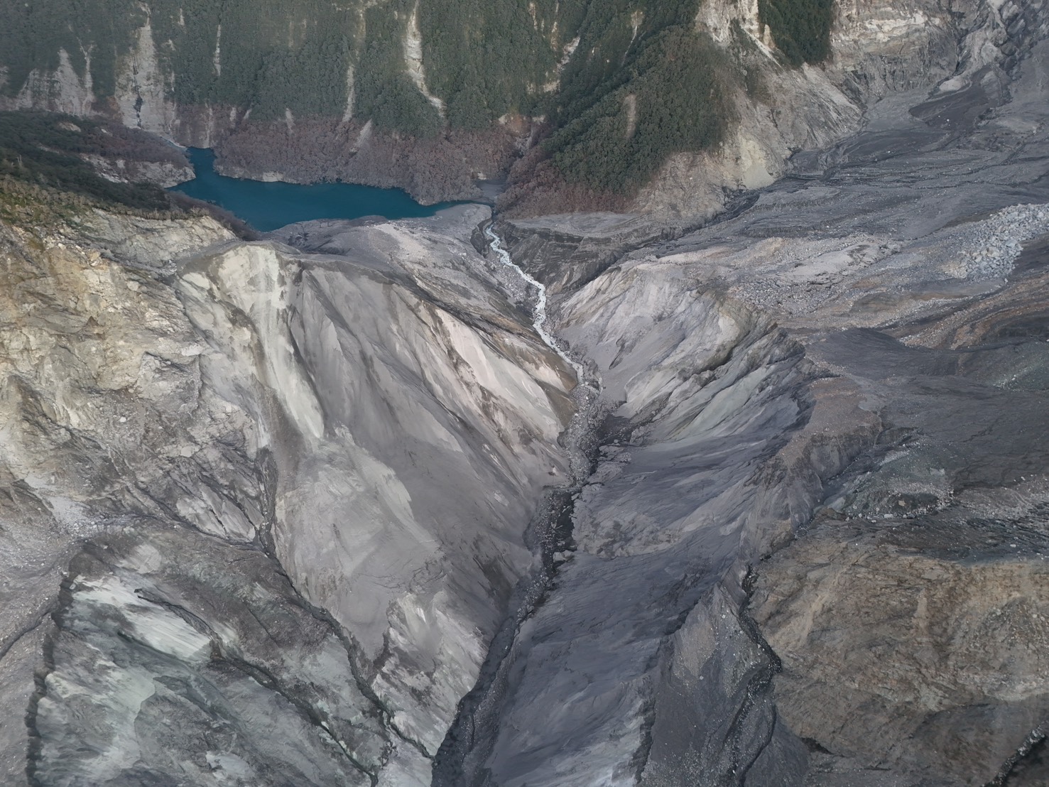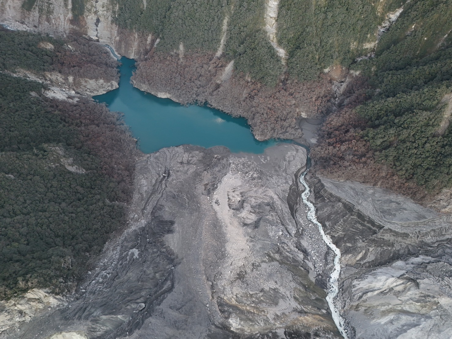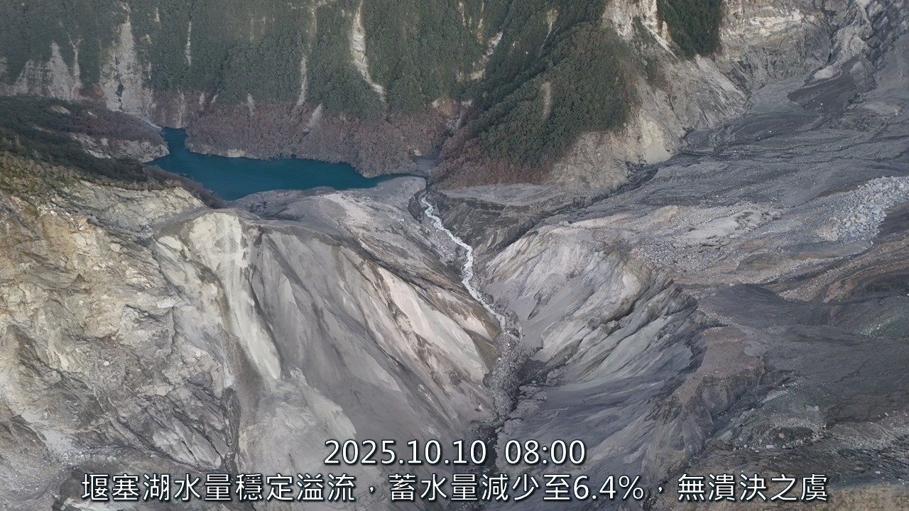 《林業保育署花蓮分署發布資訊》 一、今(10/10)日馬太鞍溪堰塞湖水位高程1019.8公尺,湖區面積12.6公頃,蓄水量580萬噸。;溢流破壞後至今水位高程已下降119.2公尺,目前蓄水量約為溢流前原來量體之6.4%。 二、林業保育署每日以無人機空拍,影像判釋評估堰塞湖水位並計算蓄水量,10月上旬期間,溢流口下刷速率趨緩,湖區水位無明顯變化。 三、天然壩體及水流無異狀,持續從溢流口穩定流出;壩體邊坡仍可能崩塌,下游河道土砂淤積嚴重,仍需清疏、導流及防堵,因此維持紅色警戒。 [照片說明] 114年10月10日空拍堰塞湖區,初判無異常變化。