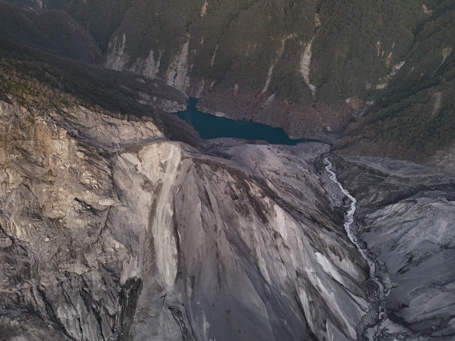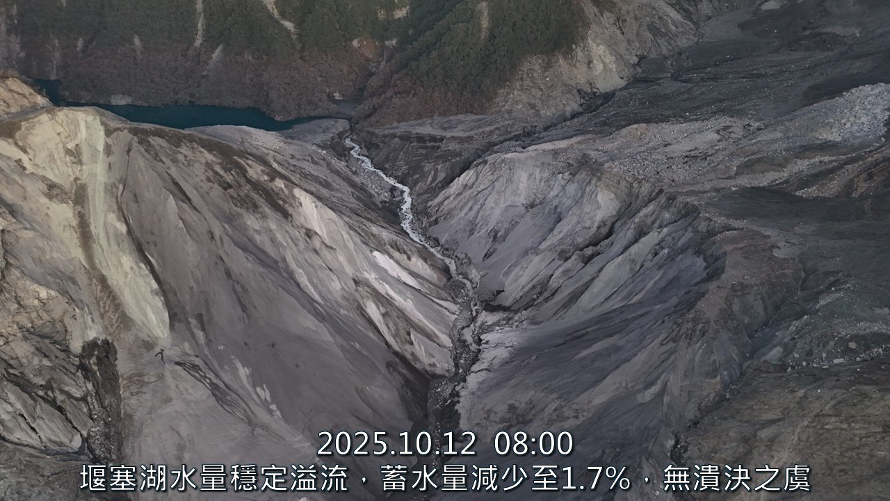 《林業保育署花蓮分署發布資訊》 一、今(10/12)日由無人機觀測顯示,馬太鞍溪堰塞湖水位高程1019.7公尺,湖區面積12.6公頃,溢流破壞後至今水位高程已下降119.3公尺,10/1~10/12水位無明顯變化。經10/9重新安裝水位計湖底地形量測,蓄水量修正為155萬噸,約為溢流前之1.7%。 二、天然壩體及水流無異狀,持續從溢流口穩定流出;壩體邊坡仍可能崩塌,下游河道土砂淤積嚴重,仍需清疏、導流及防堵,因此維持紅色警戒。 [照片說明] 114年10月12日空拍堰塞湖區,水位無明顯變化。