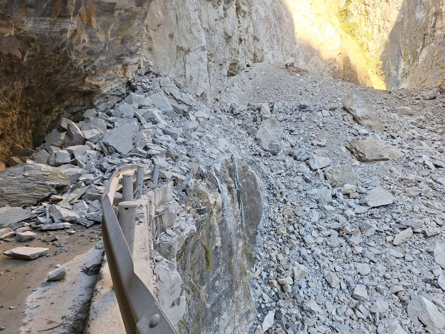 林業及自然保育署花蓮分署今(18)日表示,太魯閣國家公園燕子口一帶因大規模崩塌形成的堰塞湖,經持續監測,目前湖水已從台8線靳珩隧道東口溢流,並穩定回流至立霧溪主河道,雖水量略增,但整體流勢平穩,堰塞湖對於下游風險已降低。 根據公路局東區養護工程分局CCTV影像顯示,今日凌晨02時30分左右,堰塞湖水開始漫淹至台8線靳珩隧道西口路面,隨後湖水經西口沿隧道向東漫流,溢流水出了隧道出口後立即從到道路兩側流回立霧溪河道。現場觀察顯示,水流穩定,未對下游造成重大威脅。 為即時掌握現場情勢與堰塞湖變化,今日上午7時,已由林業保育署會同廠商進入現場勘查,隨即展開便道開設作業,預計從新台8線開設約30公尺便道銜接舊台8線,以抵達壩體邊進行後續降挖及安全評估。 此外,昨日請陽明交大初步評估,假設堰塞湖1小時內潰決,潰決後約50分鐘水流抵達下游錦文橋(河寬約100公尺),河床水位抬升5公尺,過錦文橋後因河道擴寬,水位上升量約2公尺。因下游右岸富世村民樂部落高於河床10公尺,左岸的台灣電力公司東部發電廠立霧機組高於河床5公尺,應不會發生影響,但為慎重,仍請該兩區域居民預防性撤離。今日成功大學堰塞湖防災團隊亦於上午抵達,將展開精密測量與資料蒐集,並重新評估對沿線道路設施及聚落的影響範圍,以提供即時,且更精細的的防災決策依據。 今早行政院李顧問孟諺再次前往現場勘查,並與公路局、太魯閣國家公園管理處及地方政府持續密切協調,監測水位變化及壩體穩定度,同步研議後續降挖與排水作業可行性,以確保下游居民及設施安全。 花蓮分署再次呼籲,台8線靳珩隧道至燕子口路段目前仍屬警戒區域,公路局已實施交通管制,請民眾切勿擅入或靠近溪谷觀察,以免發生意外。
