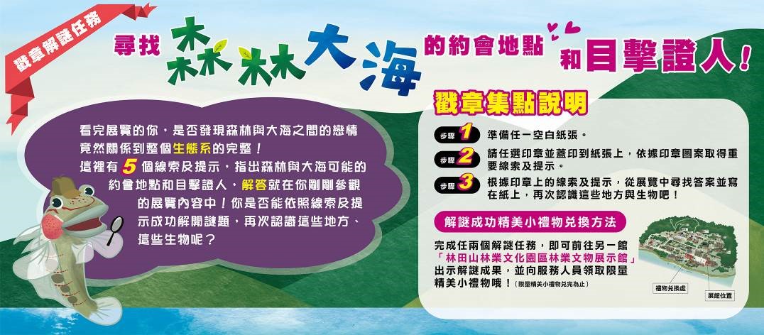 今年的西洋情人節剛好碰上小年夜,不少戀人規劃在除夕夜前和戀人一起過個簡單又浪漫的情人節。林務局花蓮林區管理處在林田山林業文化園區辦理的「森林是大海的戀人特展」自即日起以大吻鰕虎作為主角推出應景戳章解謎活動。大吻蝦虎僅分布於臺灣東部溪流,是洄游性魚類,卵在河川中孵化後,幼魚順流而下至海洋生活,體長約2公分左右時再回溯至上游棲息。就讓一生悠游在森林與大海間印證雙方濃蜜戀情的大吻鰕虎帶領大家一起尋找神秘的約會地點吧! 只要在現場參觀特展後到印章區索取活動卡片,蓋上印章取得提示,根據提示在展區中成功破解約會地點,就可以把精緻的大吻鰕虎紙模型帶回家唷(數量有限一天60份兌完為止)! 提醒大家,林田山林業文化園區除夕當日(2/15)休館,其餘時間則將照常開放,歡迎民眾多多前往參觀。另外,森林是大海的戀人特展將於年後與瑞穗生態教育館合作推出臉書贈獎活動,詳細活動辦法將於3月1日公告,有興趣的民眾可持續追蹤林務局花蓮林區管理處官方網站(http://hualien.forest.gov.tw/)、瑞穗生態教育館臉書粉絲專頁(https://www.facebook.com/rsecology/)。