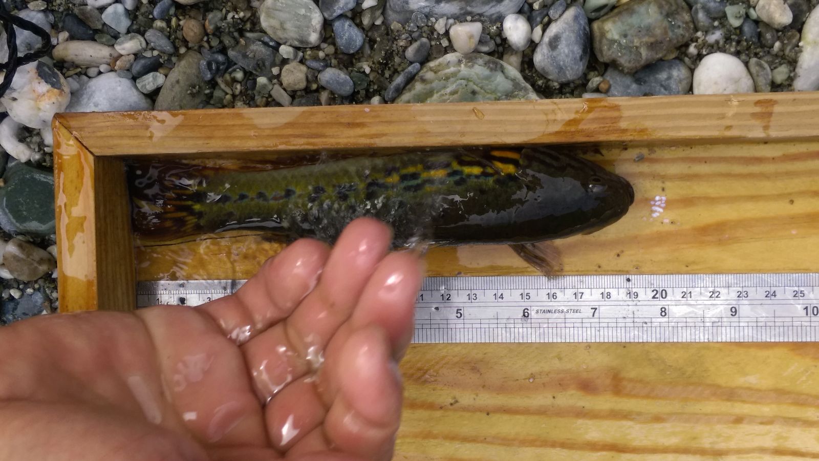 繼105年台東因風災、水患不斷,有台東民眾發現,有著艷麗鱗片的稀有魚類「無孔塘鱧」,重新出現在市區溪澗中,花蓮林管處於106年11月,於三棧溪進行溪流魚類調查時,也意外發現從未紀錄魚種「無孔塘鱧」的蹤跡,無孔塘鱧,又稱無孔蛇塘鱧,是蛇塘鱧屬的一種;體中軸線具有一列黑色的斑點,背側有不規則的黑褐色斑點。頰部於眼後下方有放射狀的黑褐色線紋。幼魚體側有淡青色的光澤,成魚則有暗紫紅色的斑塊,且鰭膜具有黃色的線紋及斑點。 無孔塘鱧在溪流中下游的淡水域裡,河口區的半淡鹹水中甚至剛退潮的海邊水坑都可以發現它的蹤跡。泳力佳,警覺性很高。本次調查發現該魚體長已達19公分,依據文獻屬於該魚種的重量級大哥了,成魚體色是黃綠為主,身上佈有紅色、藍色和黃色斑點,看起來色彩相當豔麗繽紛,彷彿有如在溪裡的琉璃,見一眼就讓人深深著迷。 三棧溪是以三棧南溪為主流,而後在三棧村附近和北溪會合後才東流注入太平洋。本區域動、植物生態多樣豐富;結合位於三棧階地的布拉旦社區人文特色,很適合從事觀察地形、地質、動植物生態、攝影、寫生等自然觀察與生態旅遊活動,喜歡親近大自然的朋友們,不妨來趟生態之旅,幸運的話還可以遇見這稀有的水中琉璃-無孔塘鱧。