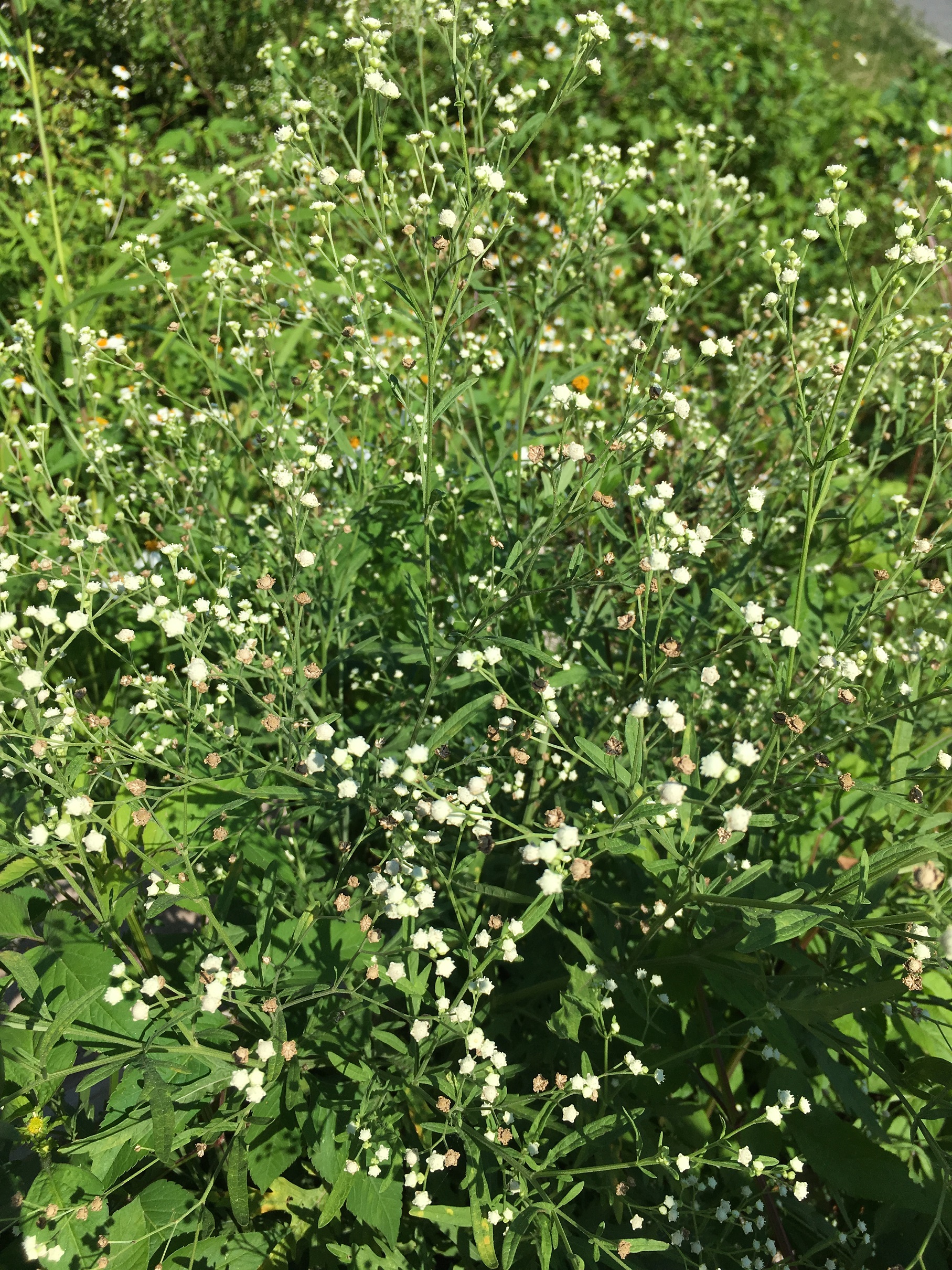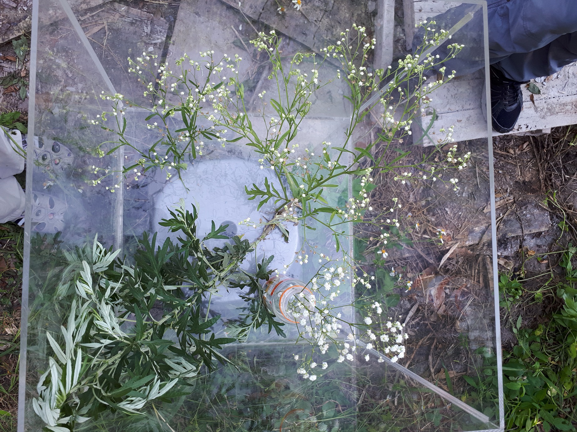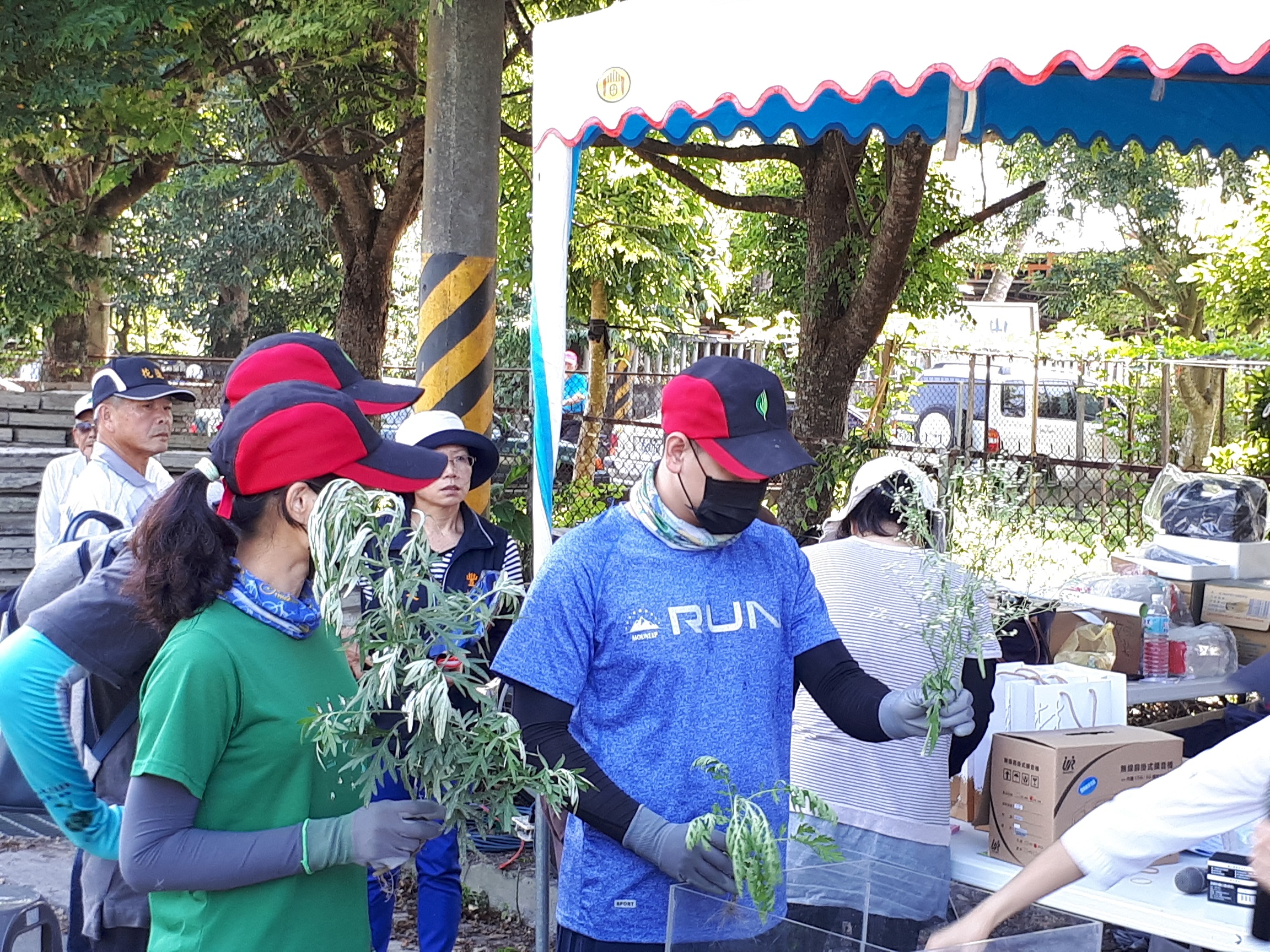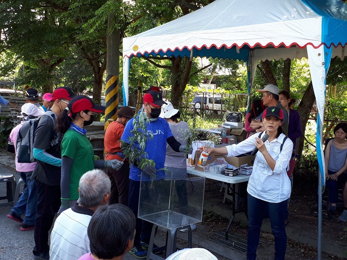 銀膠菊幼苗外觀似民俗植物「艾草」,開花時則似觀賞花卉「滿天星」,繁殖力強,釋出的花粉會引起人體過敏、皮膚炎、鼻炎等,有「國際毒草」之稱。活動開始前,社區媽媽熱烈發表「銀膠菊小苗很像艾草,但葉子刻痕較深(葉緣深裂)」、「曾誤採銀膠菊做成草仔粿,因沒艾草香味,才發現採錯植物」,相關經驗分享讓其他社區居民頻頻點頭並爆出笑聲。林區管理處同仁特別將銀膠菊、艾草及滿天星三種植物放置玻璃箱中,從外觀、葉形、顏色「銀膠菊正面綠色,背面銀灰色」等,簡單易懂的方式教導民眾進行辨識,另特別呼籲移除前應穿著長袖衣物,戴上手套及口罩等,做好自身防護措施,而連根拔除之銀膠菊應放入塑膠袋密封,避免因誤觸、誤拔引發身體過敏不適。民眾完成移除後,林管處設計了銀膠菊相關的小常識以有獎問答方式,加深民眾的認識及正確移除觀念。