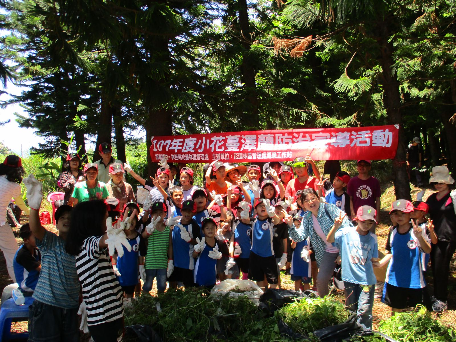 花蓮林區管理處推動豐濱鄉新社村森-川-里-海跨域平台,特於25日在豐濱鄉與新社部落、新社國小共同辦理「107年度小花蔓澤蘭防治」活動,花蓮林管處由作業課陳課長淑芳帶領同仁、與新社部落長者及新社國小師生合計近百人參加,大家不分老人小孩,對抗「綠癌-小花蔓澤蘭」不落人後,儘管天氣炎熱,仍奮力移除了部落周邊的小花蔓澤蘭多達數十斤,小朋友的熱情投入真令人感動,也學到了正確地拔除方法及拔除後小花蔓澤蘭如何再利用的知識。 花蓮林管處作業課陳課長淑芳向部落居民說明,由花蓮林管處及花蓮農改場、水土保持局、農糧署東區分署組成的「花蓮縣豐濱鄉新社村『森-川-里-海』生態農業倡議跨域平台」,結合新社、復興兩部落討論出五大面項、38項工作分工項目,其中移除外來入侵種小花蔓澤蘭就是兩部落所共同關心的生態議題。小花蔓澤蘭名列「世界百大入侵種」,其繁殖散播能力之強在國外有「一分鐘一英里雜草」之稱,如果投入防治拔除的區域其鄰近地還有植株存在,就容易春風吹又生地再度蔓延過來,影響防治效果,所以需要區域性的整合防除。 花蓮林管處本次特別串聯上游的復興部落與下游的新社部落分別舉辦小花蔓澤蘭防治活動,以發揮區域共同防除的效果。在台灣小花蔓澤蘭主要對海拔1000公尺以下、陽光充足的農林地造成危害,入侵後會攀爬覆蓋導致農作物或樹木「窒息」死亡,造成農業經濟的損失,且目前防治方式仍以人工拔除為主。期盼部落了解外來入侵種的危害性後,發揮守望相助精神,共同防堵外來入侵種的散播,也呼籲大家及早發現及早拔除,守護台灣本土棲地生態環境。 為了推廣小花蔓澤蘭的利用,花蓮林管處及花蓮縣政府委託花蓮高農研究小花蔓澤蘭萃取醋液的利用,當天也邀請到學生到場協助向部落介紹醋液的製作方法及防治小黑蚊的功效,大家都聽得津津有味,現場大家都搶著試用小花蔓澤蘭防蚊液呢! 另外,花蓮林管處也邀請到池南社區發展協會共襄盛舉,推廣介紹小花蔓澤蘭的植物染,部落居民沒想到小花蔓澤蘭也可以變成顏色這麼美麗的產品,紛紛覺得移除外來入侵種還可以創造美麗的家園,真是一舉數得!