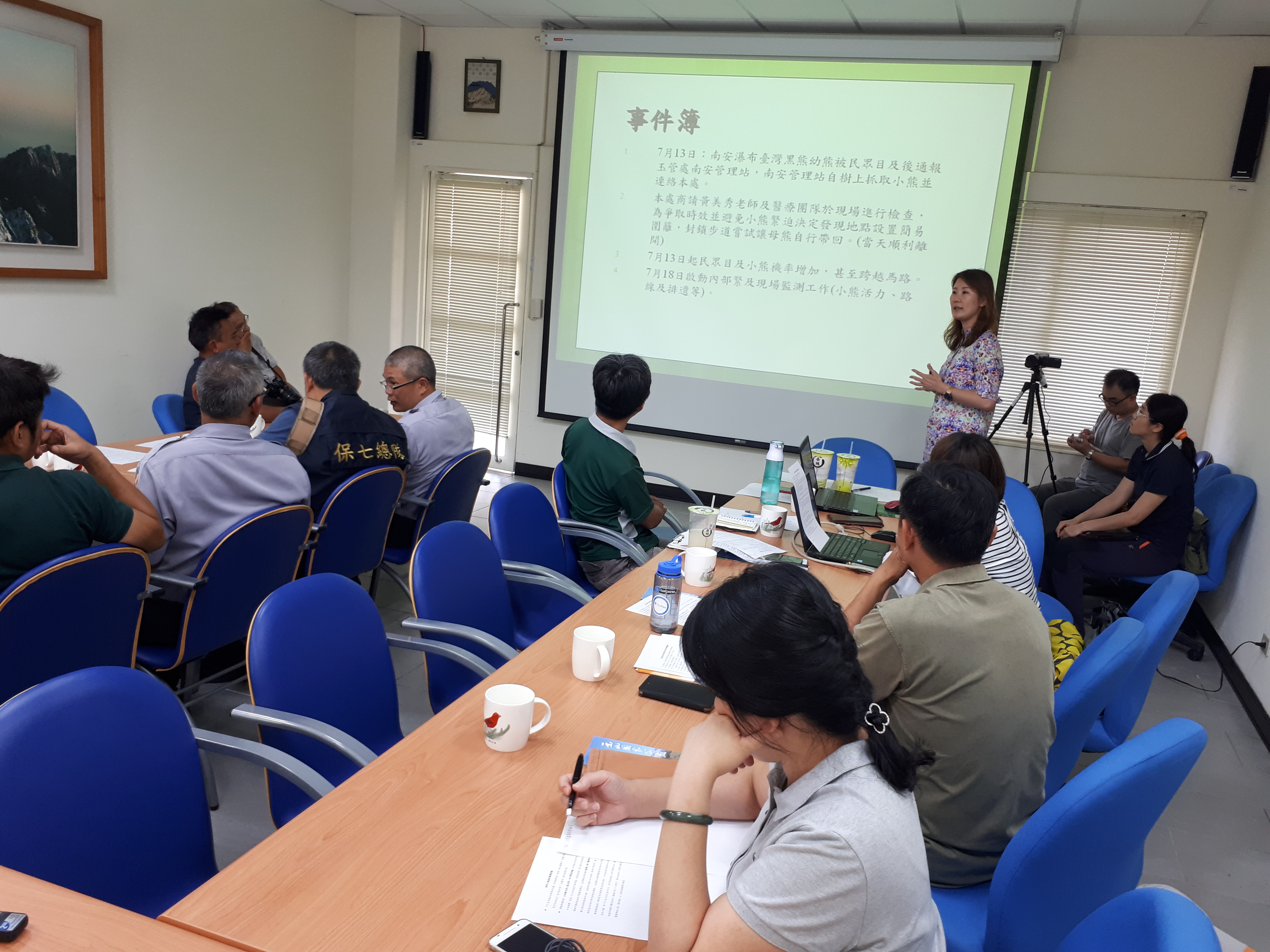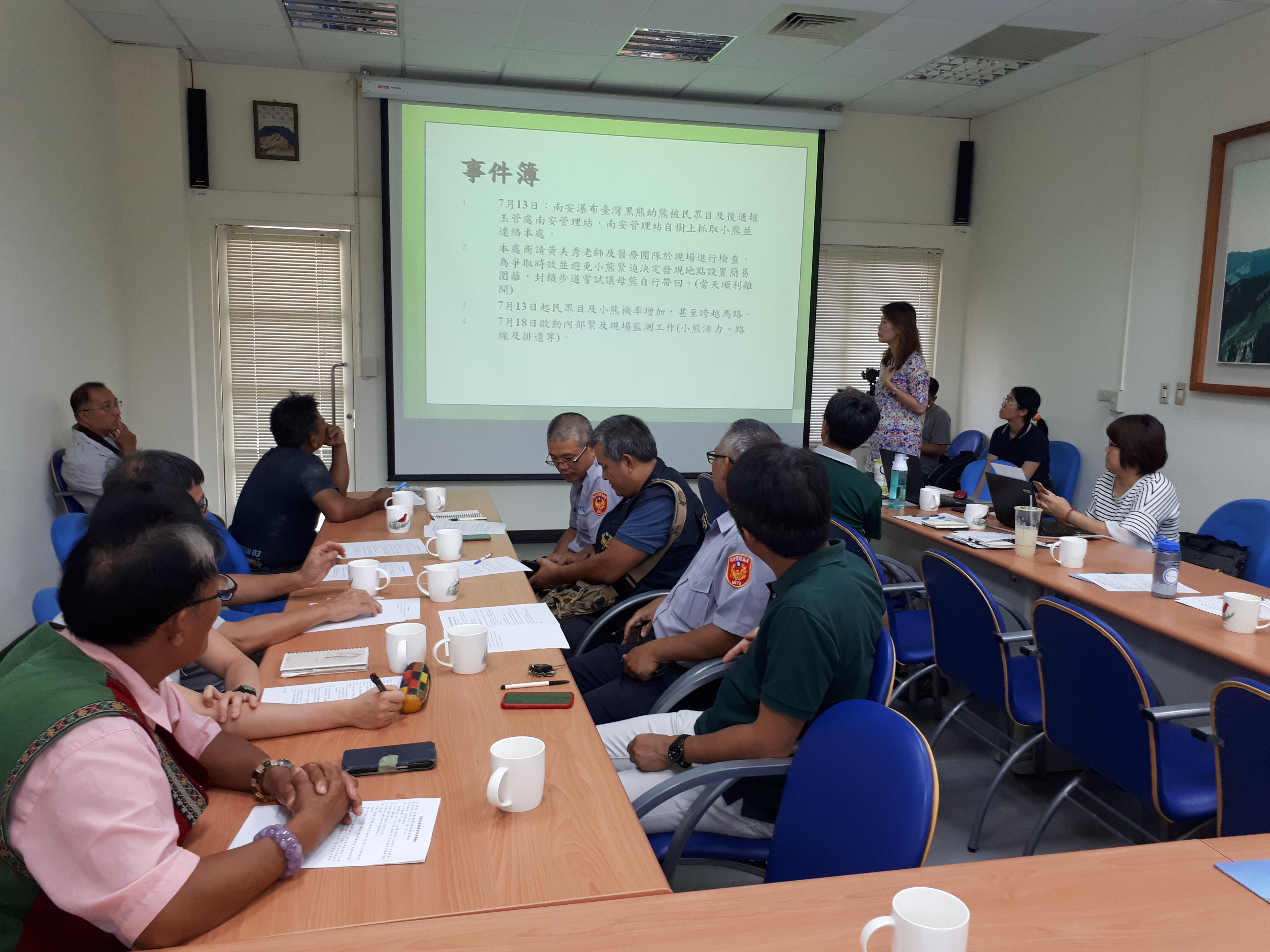 臺灣黑熊小熊進入南安瀑布步道,自7月13日起至今已第12天,花蓮林區管理處為了還給小熊自然的生存環境,讓熊寶寶不受人為干擾,除啟動現場管制,本日林區管理處邀請林務局、玉山國家公園管理處、保七總隊第六及第九大隊、公路總局玉里公務段、卓清村長何成忠、南安部落青年林泳宏召開緊急研商會議,讓母熊帶回小熊是與會單位共同努力的目標。 獸醫師朱何宗提到「森林熊共同特徵非常膽小,母熊活動範圍非常廣大約30~60平方公里,5~6kg小熊己經能吃雜食,奶水已非主食,惟需要母熊帶領小熊學習野外求生能力」,另部落青年林泳宏表示「布農族在南安瀑布上方遠處每年都遇見黑熊活動,本來就是他的家,依布農族的思考就是很簡單,協助小熊在現地長大,自行回家」。 23日相關單位於會中達成「讓母熊帶小熊回家」的共識,做出三點決議「一、為將人為干擾降至最低,玉山國家公園管理處自7月24日6時起,進行瓦拉米步道管制二週;函請花蓮及南投縣警局配合暫緩受理步道二端的入山申請,並視狀況調整;公路總局玉里公務段協助在不影響公務及部落人員進出下,於台30線5.5K處進行管制。二、二週觀察期間,林管處持續監測與紀錄外,為確保小熊身體狀況良好,將在專家的指導下,適度提供多樣化的營養支持,包括野果。三、林區管理處將邀學者專家組成顧問團,為協助小熊回到母熊身邊所需的下階段工作提供專業意見」。林區管理處表示,在地部落居民都支持現場進行必要的管制,也請所有關心小熊的民眾也能支持,讓小熊能盡快與母熊相聚,有圓滿的結果。