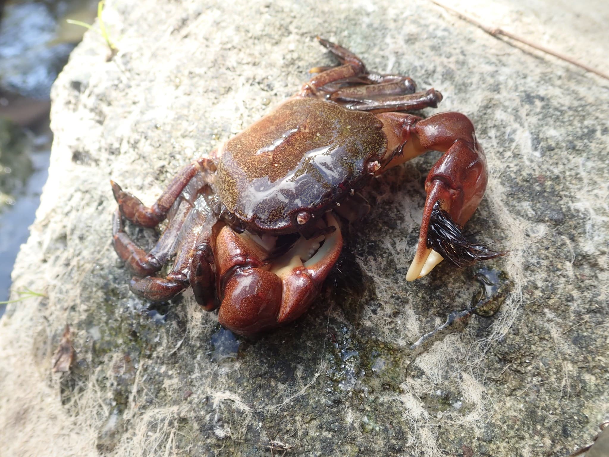 林務局花蓮林區管理處107年起於花蓮縣豐濱鄉新社村的加塱溪流域進行二年期的溪流資源調查,紀錄到許多洄游性魚蝦蟹種類以及溪流棲息環境。 新社村加塱溪資源豐富,上游原始森林與海岸山脈所帶來的礦物與食物,提供河海洄游甲殼類良好生存環境,並進而成為部落食用資源,與林務局里山倡議的精神相同,讓森林、河川、部落、海洋共存共榮永續利用。花蓮林區管理處楊瑞芬處長表示,林務局推動生態保育,從過去的保護動物到現在提倡國土生態綠色網絡,東部的森川里海串接動物棲地連結,其中加塱溪溪流生態調查的成果非常豐碩,近期在調查中發現新社部落稱做郝柏村蟹的剛毛假方蟹! 豐濱鄉民代表潘禎祥表示:這種螃蟹因為形似國防部參謀總長郝柏村的招牌眉毛,而被部落的族人叫做郝柏村蟹,十分好辨認。洄瀾風生態有限公司研究員吳政澔表示:弓蟹科的剛毛假方蟹的螯足上長滿了黑色硬毛,型態特殊容易辨識,而剛毛假方蟹主要棲息在東海岸乾淨的河川中下游至河口的石塊下,為雜食性生物,以腐葉、動物屍體、螺貝類、水生昆蟲等為食,主要為夜間活動,屬於降海型的洄游性生物,在生殖季時會遷移至河口繁殖後代,在其生活史與海洋的關係十分密切,也是一種適合部落參與了解溪流健康的生態指標物種。