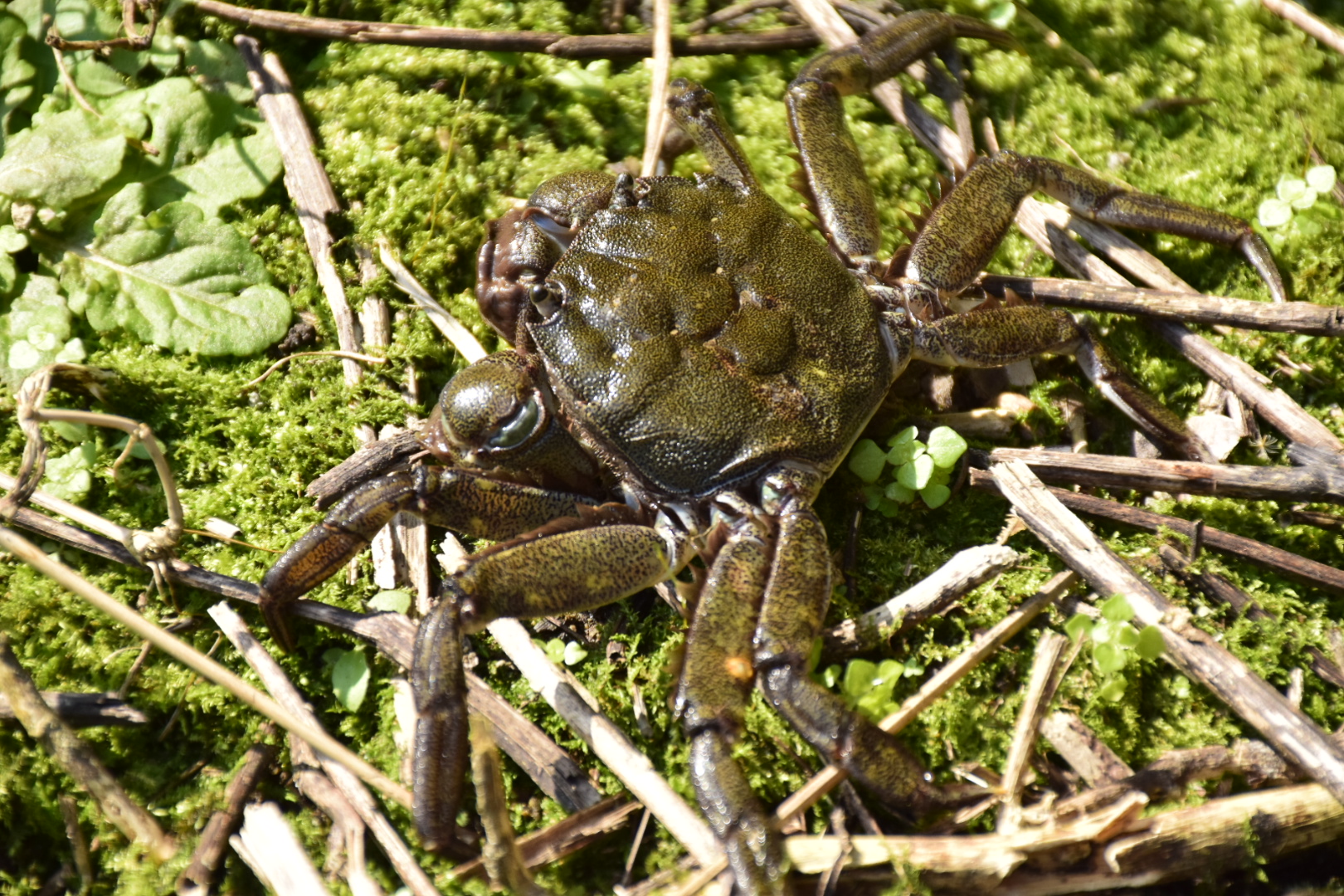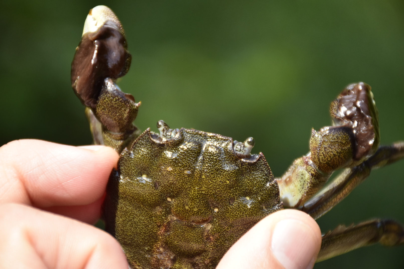 林務局花蓮林區管理處自107年起開始於花蓮縣豐濱鄉新社村的加塱溪流域進行二年期的溪流資源調查,紀錄到許多洄游性的魚蝦蟹類。調查執行團隊於近期進行冬季溪流調查時,意外發現東部溪流的代表物種—青毛蟹也現身其中。青毛蟹早期在東海岸溪流隨處可見,近年在人為捕捉及棲地改變的壓力下,僅有專業捕蟹人依靠經驗才有機會找到較多的數量。 青毛蟹學名為台灣絨螯蟹,因體色像極了墨綠色的青苔而得其名,身體較一般螃蟹扁,屬台灣特有種,只有台灣東半部流入太平洋的河川可見其蹤跡,分布範圍北起宜蘭縣頭城鎮大溪地區,南迄屏東縣滿州鄉。從小便住在加塱溪畔的復興部落耆老王明源阿公回憶,以前青毛蟹十分常見,但近年來卻變得稀少,他推測可能和河川環境改變有關係。林管處委託調查團隊洄瀾風生態有限公司吳政澔研究員分享:青毛蟹喜歡棲息在多元的溪流環境中,陽光、森林、草叢、苔癬、蕨類等生存條件缺一不可。森林中腐爛的枯枝落葉可成為魚、蝦、蟹和水棲昆蟲的食物,充足的陽光照射也為溪流石塊藻類提供養分來源,而這些都是青毛蟹喜愛的美食;這樣多元的環境同時也為其他共棲生物所利用,成為一個完整的溪流生態系。 花蓮林區管理處楊瑞芬處長表示,林務局近來提倡國土生態綠色網絡,花蓮林區管理處在海岸山脈獨流入海溪流進行溪流調查,未來將朝向完整生態網絡的跨域整合邁進。成熟青毛蟹可抱卵8萬至17萬粒不等,繁殖需從河川往海洋移動以釋放幼體;海中幼體之後慢慢脫殼變態後,從河口上溯至乾淨的原始溪流支流中,屬於降海洄游的種類。近年來因水泥工程整治使幼蟹上溯回支流棲息困難,加上物以稀為貴的經濟需求造就極大的採捕壓力,青毛蟹數量銳減,本次調查發現青毛蟹恰證明推行溪流生態環境復育的重要性。河口整治工程時需同時顧及周邊生物棲地的維護,加上有限度的資源利用,才能有效發展支流生態經濟。