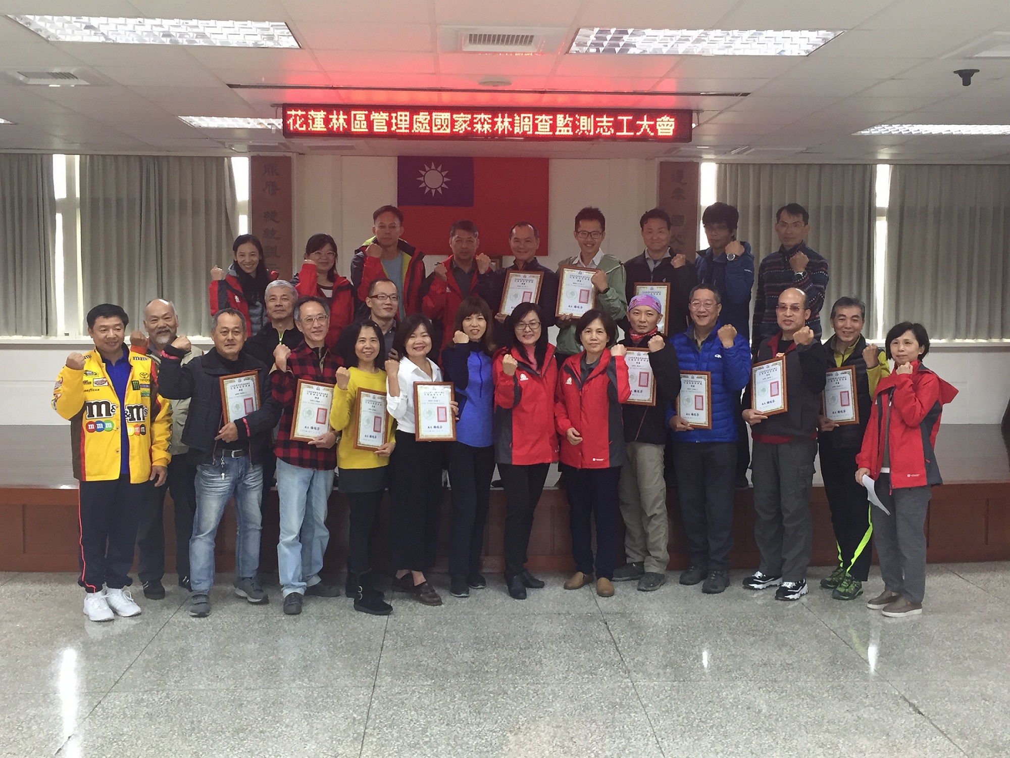為擴大公民參與森林保護工作,強化林地巡護並遏止盜伐案件發生,花蓮林區管理處12月27日辦理國家森林調查監測志工大會,宣告第二期志工正式成軍,24位志工在領取聘書後,將與第一期的8位志工整合,共同加入公私協力完成森林巡護、濫墾及盜伐等不法林政案件的通報工作行列。 林管處轄下國有林業用地森林面積廣達32萬公頃,行政區域幾乎涵蓋花蓮縣境各地,還有為國土保安、水源涵養及景觀維護所劃設2,049公頃的區外保安林,單倚賴林管處88位森林護管員巡視,實在難以完全遏止所有的不法行為,因此,林管處除了與周邊社區及部落合作巡守之外,也從107年起招募國家森林調查監測志工,共同來保護國家森林,齊心協力打擊不法。 林管處表示,第二期國家森林調查監測志工,共有30多人報名,最後錄取24名並全數完成基礎、專業與實地參與林地巡護及盜伐通報等訓練課程,正式加入森林巡護任務行列。 林管處長楊瑞芬在頒發志工聘書時表示,感謝志工的付出,不論是深山特遣、偏遠巡視志工們都認真積極協助本處執行,這是一份需要體力和耐力的工作,尤其犧牲個人時間完成社會參與更令人佩服。志工,是社會資源共享的具體展現,公私協力攜手維護寶貴的國家森林資源。