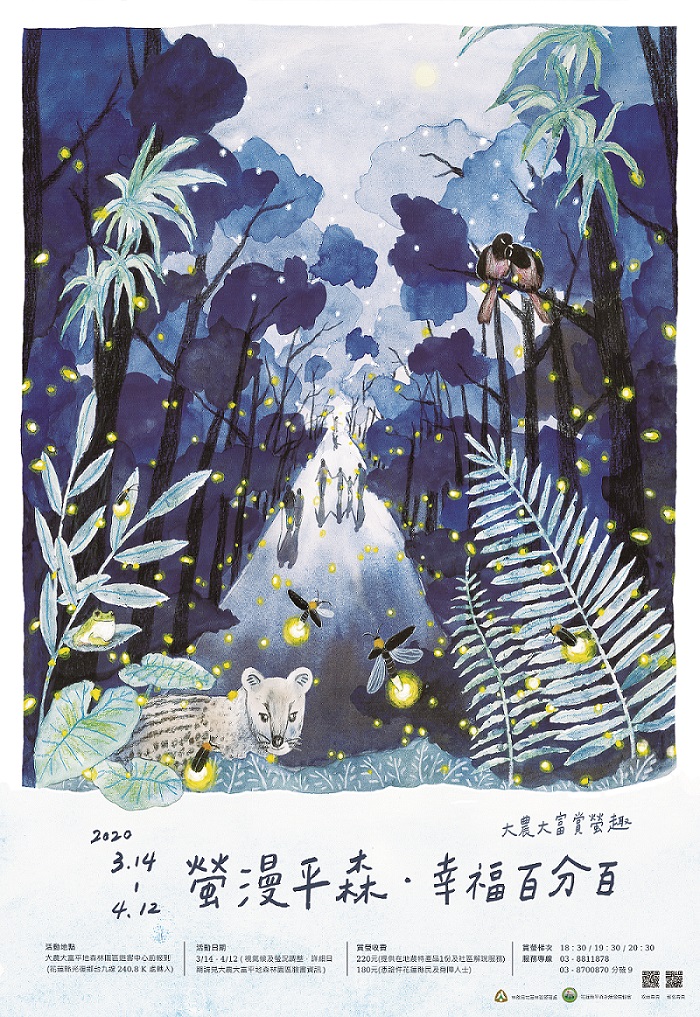 一年一度大農大富平地森林園區螢光盛會,於2月28日下午2時浪漫啟動,將持續至4月6日!堪稱全台最早、面積最大,最容易到達的賞螢聖地,花蓮林管處與在地社區用心規劃系列活動,搭配生態小旅行,從早玩到晚上幸福百分百。 開幕活動邀請富源國中鼓隊,為盛會「敲響幸福」,同時邀請優質音樂歌手,包含在地原民歌手莫言、客家創作歌手黃瑋傑、具多元文化特色Nina&John那就醬樂團,及超人氣湯姆與哈克樂團;此外還有暖胃美食小吃、螢火蟲DIY手作體驗、親子同樂「黑熊說鼓」、大農大富市集,多元活動誠摯邀請共度美好的假期首日。 林管處長楊瑞芬表示,今年貼心規劃賞螢季期間逢周五與周六加開『螢光巴士賞螢專車』,預計於美崙飯店、翰品酒店、福容飯店、東大門夜市及花蓮火車站等接送,每日一班車,另在光復車站有計程車來回接送,共乘每台車來回500元,提供友善大眾運輸,滿足交通與賞螢一票玩到底;觀光旅遊協會推出1人1,100元、雄獅旅行社1人1,350起等,多元賞螢專案任君選擇,有興趣的民眾可上「大農大富平地森林園區」臉書粉絲專頁點選購票訊息,欲搭乘「賞螢專車」的民眾請事先上網購票,或來電洽詢03-8811878。 報名網頁 螢光巴士報名網頁 臉書粉絲專頁