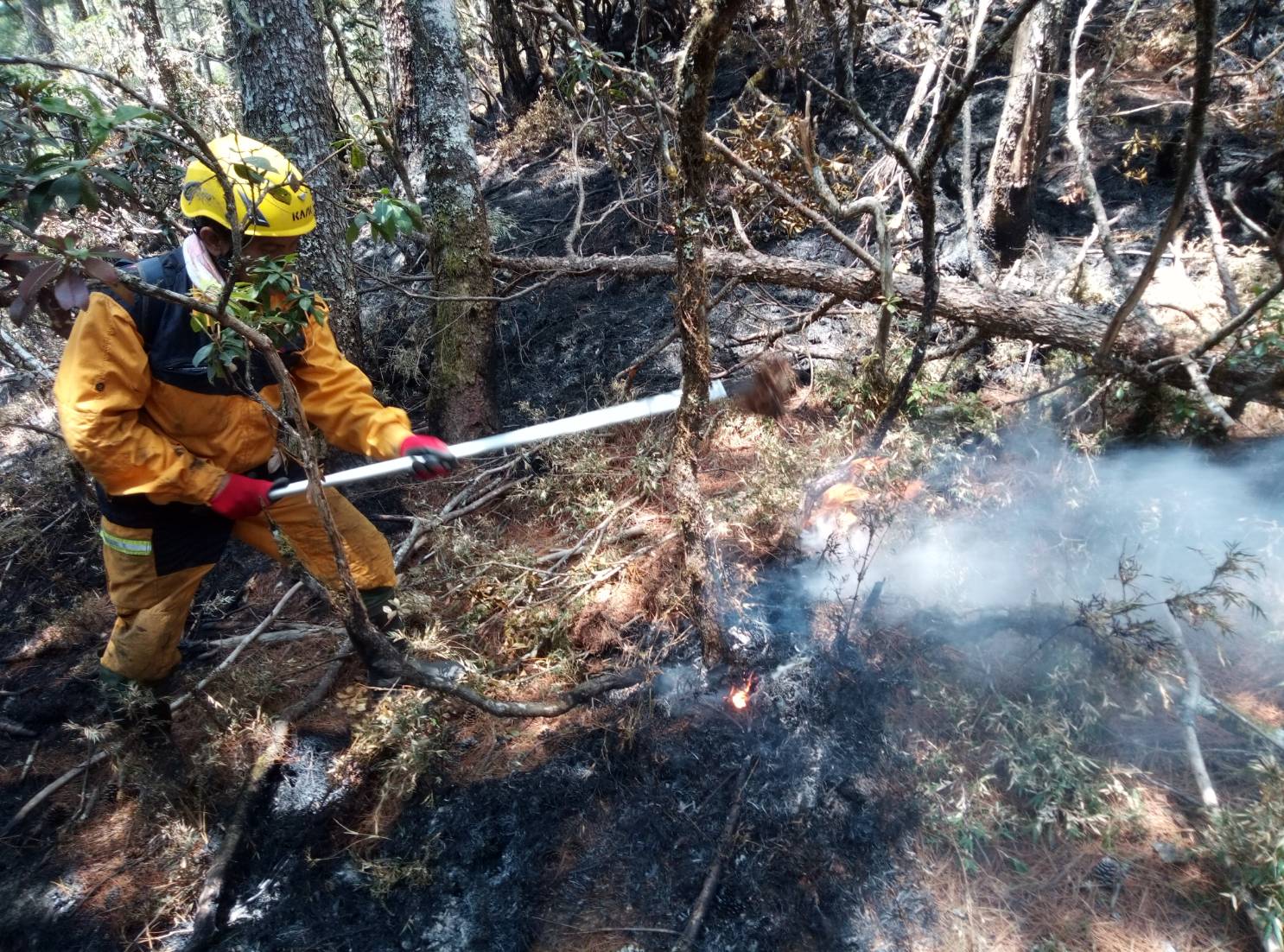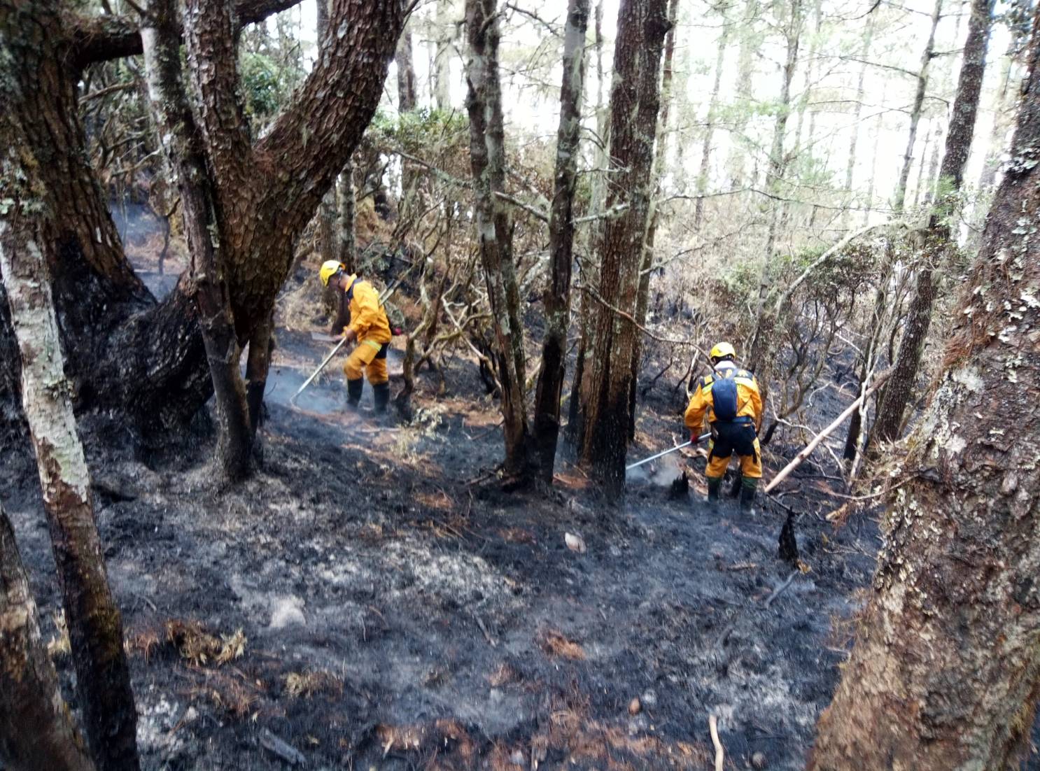 花蓮林區管理處玉里事業區第32林班地森林火災3月30日發生後,因天公不做美,雲層過厚,阻撓搶救作業,空勤運補及空勘極度艱辛,從地面挺進的森林護管員則面臨高山、峭壁險阻,索性在空中及地面二路合作克服困難後,森林護管員終於在昨(3)日順利挺進火場,並在今日下午3時15分將延燒了6天的林火完全撲滅,搶救任務正式告一段落。後續將計算3.48公頃燃燒面積內林木被害材積數量與損失價值。 林管處表示,空勤總隊4月1日在沙武巒山附近空投物資成功後,昨天亦順利完成2架次物資空投及空勘作業,為已體力透支的運補人員及前線滅火森林護管員注入一股強心劑。為加速滅火,空勤總隊黑鷹直升機今日上午10時再從德興棒球場起飛,於火場附近上方投放火耙、工具鏟、水及防火口罩等約80公斤滅火物資,從空中支援在火場裡不畏高溫危險執行滅火任務的森林護管員。 「地面部隊」森林護管員則兵分三路,從火場西、中、東側分頭進擊撲滅殘火。因火場今早已無明顯樹冠火竄出,但地面火仍持續悶燒,森林護管員採用地毯式殘火處理方式,確保不放過任何零星火苗;也利用阻隔燃料的方式,徹底消滅餘燼。加上今日山區濕度高、風速低,滅火十分順利,火場終於在上午11時已全面控制,無延燒之虞;下午3時15分完成餘燼清理工作,森林護管員將繼續監測火場,確保無任何殘火復燃後撤離火場,人員撤離也是一場硬仗,需要2至3日才能回到林管處各處所完成撤離計劃。 林管處統計,自3月30日起累計動員包含森林護管員、ICS(災害應變指揮體系)精英小組、空勤總隊、保七總隊第九大隊、花蓮縣消防局、花蓮縣後備指揮部、陸軍花東防衛指揮部、陸軍航空特戰指揮部飛訊部、第二作戰區指揮部、各工作站及運補人員超過百人,出動空勤黑鷹直升機13架次,完成5次、10噸水量的空中灌灑作業,人力、物力及財力成本極高,林管處在滅火任務結束後將請保七總隊查緝火首,一旦查有不法,必定依森林法第51條及民法相關規定究責,另瑞穗林道10K也結束管制,林管處呼籲民眾入山要小心用火,以免因小疏忽釀成森林火災嚴重破壞生態。