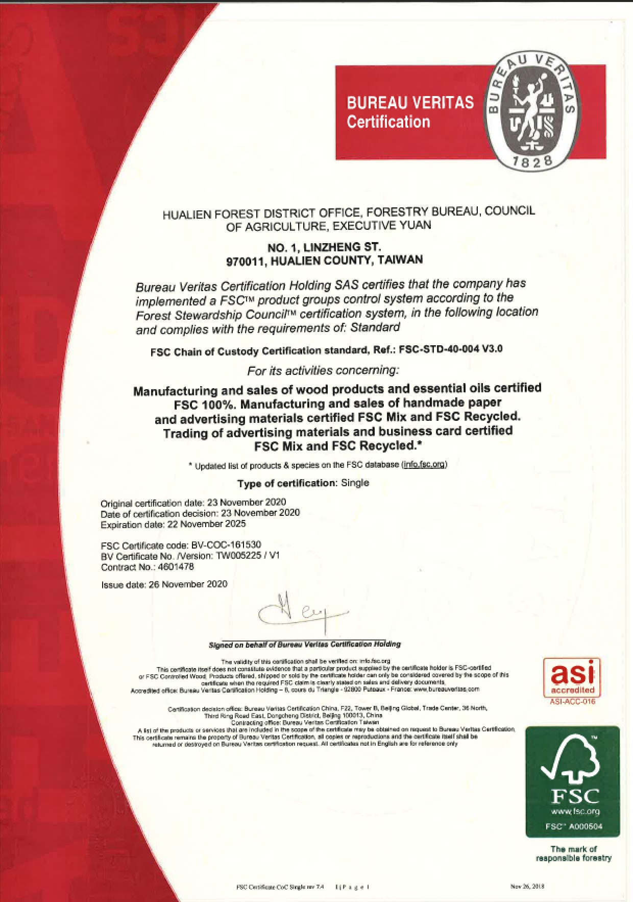林務局花蓮林區管理處於今(109)年11月26日通過Forest Stewardship CouncilTM(FSCTM,森林管理委員會)監管鏈(Chain of custody, COC)驗證,為全台8個林管處中最先通過認證者。未來將以花蓮南華林業園區木工教室為基地,生產符合FSC COC標準的國產材木製品,希望由公部門領頭生產及使用FSC認證木產品,帶動民間購買合法木材的風氣。 FSC COC驗證是指木產品從森林伐採,經過生產、轉移及分銷等流程到消費者手上的所有供應環節,皆使用經過FSC驗證之木材,不會混入非驗證之木頭。故可保證消費者購買旳林產品,是來自真正良好負責任管理之森林、受管控的木材或回收材料。 為使花蓮林管處同仁瞭解與認同FSC COC驗證,在正式稽核前,特聘請專業輔導公司進行一系列COC輔導課程,包含FSC驗證系統、COC各式標準等。經充分準備後,稽核員在本次驗證過程中未發現有主要不符合事項,順利通過檢核,取得COC合格證書。未來花蓮林管處在林木製品生產過程中,從進料、生產到產品銷售的產銷鏈,已具有符合國際FSC產銷監管鏈COC標準之能力。 花蓮林管處之後自產自製之國產材產品,將能符合國際森林經營要求,木材原料來自負責任且友善管理之森林。而林管處所產製的木產品種類、證書內容、認證範圍及效期,已放置國際FSC官方網站,透過產品驗證編號,便可追溯木產品來源。為永續經營森林,杜絕非法砍伐木材,花蓮林管處希望民眾能購買符合FSC COC驗證之木產品,以符合國際環保潮流,為地球生態盡一份心力(FSCTM C161530)。
