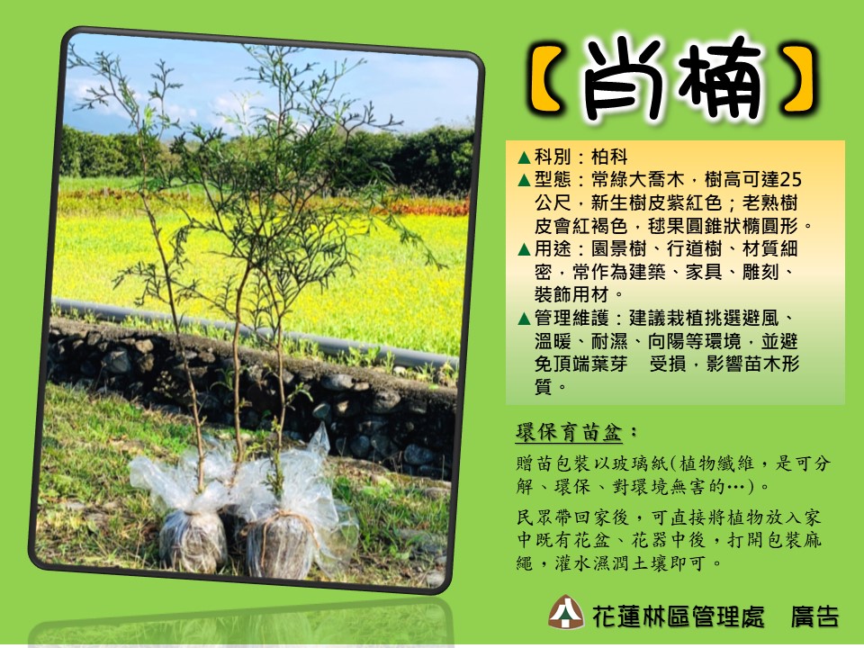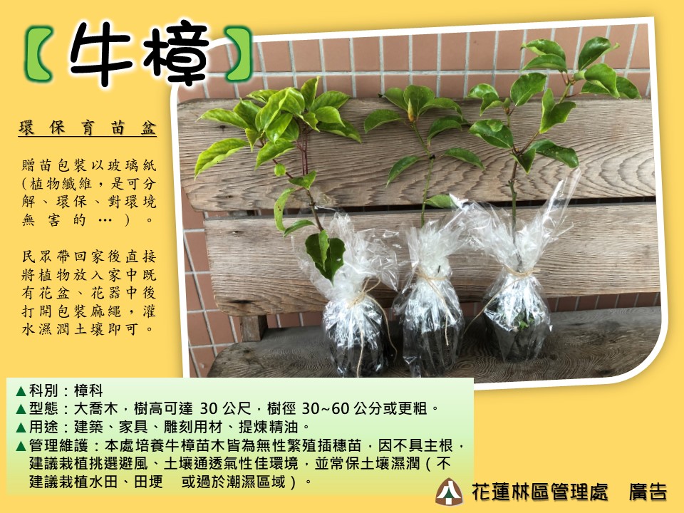 一年一度的植樹月即將來臨,花蓮林區管理處從3月5日(五)起一連11場贈苗活動陸續登場,宣告110年植樹月活動正式啟動,民眾準備3張發票即可換1株樹苗,總共8,900株台灣原生種樹苗-肖楠及牛樟等您來兌領,所得發票將全數捐贈花蓮地區慈善及福利團體,用發票做愛心、植樹護樹愛地球,歡迎鄉親共襄盛舉、一起來探詢「森存之道」。 今年植樹月主題「森存之道」,主張適地適木,營造良好的棲地,讓原生物種都能夠好好生存,延續生命的獨特樣貌,將高山森林保育繼續向淺山平原地帶延展,建構維護國土綠色生態保育網絡,讓生物們都適得其所。此外,林管處今年以符合環保減塑及民眾移植的便利性為考量,首度使用以纖維素製成、可分解且對環境無害的透明玻璃紙來包裝苗木,民眾領回苗木後可直接放入花盆或花器中,灌水濕潤土壤即可,無須脫盆,大量減少塑膠容器所造成的環境二次傷害。 林管處表示,為響應3月21日國際森林日「森林恢復:通往復甦和福祉之路 」主題,贈苗活動發放肖楠及牛樟等2種台灣原生樹種,原生種具抗病蟲害、適應力強等特性,比外來種植栽更能適應本土環境,民眾不需多花時間管理,又可保護台灣原始生態系的成長、穩定與價值。各場次贈苗資訊,可上林管處官網及臉書粉絲頁查詢。