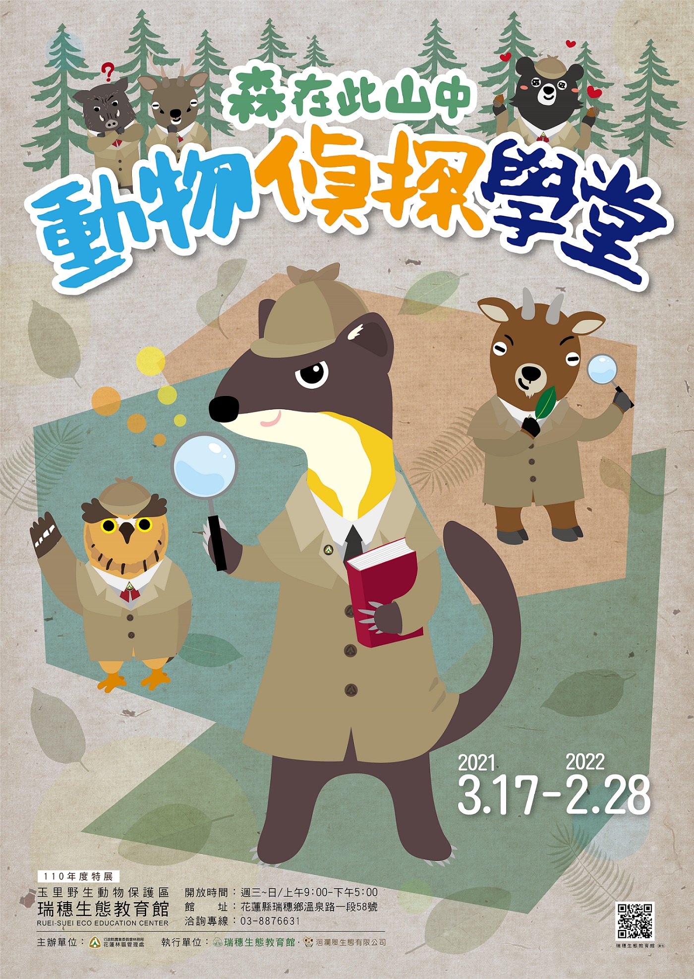 花蓮林區管理處瑞穗生態教育館3月17日起至111年2月28日推出年度特展【森在此山中-動物偵探學堂】!這次玉保村動物們搖身一變為膽大心細的偵探,各自施展所長,運用各種科學觀察技巧推理,帶領民眾一窺森林裡不為人知的動物趣聞、生態知識以及學習公民科學家的精神。 森林裡隱藏好多自然謎題等著我們去找尋真相!想知道動物覓食、在山林裡活動會留下什麼痕跡嗎?想了解動物偵探們與公民科學家如何攜手合作共同維護生態環境嗎?玉保村的愛櫟熊、芭吉鹿、好鼻豬、春飛羊、鴞灑哥和頑皮貂將帶領我們在森林中搜尋線索、發現森林裡動物們的秘密,一起化身為動物偵探! 特展主展區將玉里野生動物保護區裡的深山動物行蹤現跡之外,也規劃了遊戲互動區,讓參展民眾可以依據任務自行配對觀察工具,不僅能體驗自行動手操作的樂趣,更能引領大小朋友學習在自然中觀察記錄的訣竅,成為動物追蹤高手。此次主題特展也提供可合影打卡的「玉保村偵探明星動物立牌和拍照版」,歡迎大小朋友們蒞臨瑞穗生態教育館一起來看特展,期待與大家相見唷!詳細資訊歡迎至瑞穗生態教育館臉書粉絲專頁(https://www.facebook.com/rsecology)瀏覽或洽詢專線:03-8876631(開館時間:週三至週日、上午9點至下午5點)。