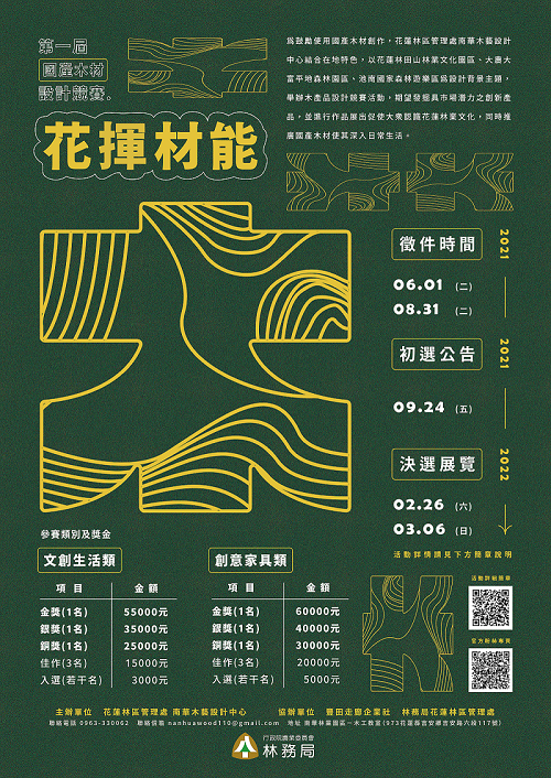 為提升國產材價值,花蓮林區管理處6月1日起開始受理第一屆「花揮材能-國產木材設計競賽」報名,創作主題以林田山林業文化園區、大農大富平地森林園區及池南國家森林遊樂區為意象背景,設計創作具有特色的國產材木作品,最高獎金6萬元,歡迎喜愛木工設計的大專院校在學生踴躍報名! 林管處表示,參賽者資格為大專院校木工、設計、森林相關學系在學學生,藉此提高學生參與國產材創作的行列。報名自6月1日起至8月31日止,共分「文創生活類」及「創意家具類」等2組;9月份進行設計圖及模型初選,每組選出15件參賽作品進入決選,主辦單位將提供初選入選者國產材木料,用以製成作品。各類組決選將評選出金獎、銀獎、銅獎、佳作及入選等名次,「文創生活類」金獎獎金為5萬5仟元,「創意家具類」金獎獎金6萬元。 林務局近年積極推動愛用國產材政策,使用國產材不僅可減少進口木材的碳足跡,也可促進臺灣林業發展。林管處第1次辧理全國性的國產材木作品設計比賽,希望藉此增進台灣國產材的多樣性利用,提高木材附加價值,推動多元文化創意產業發展。本次競賽主題強調以花蓮地區3個知名林業景點-林田山林業文化園區、大農大富平地森林園區、池南國家森林遊樂區為發想來源,期待透過年輕學子腦力激盪,創作具花蓮林業特色的國產材作品,並推廣各園區的自然環境及人文歷史風光。 詳細訊息、報名網址及簡章,請至南華木藝設計中心臉書粉絲專頁查詢,或電洽0963-330-062李小姐。