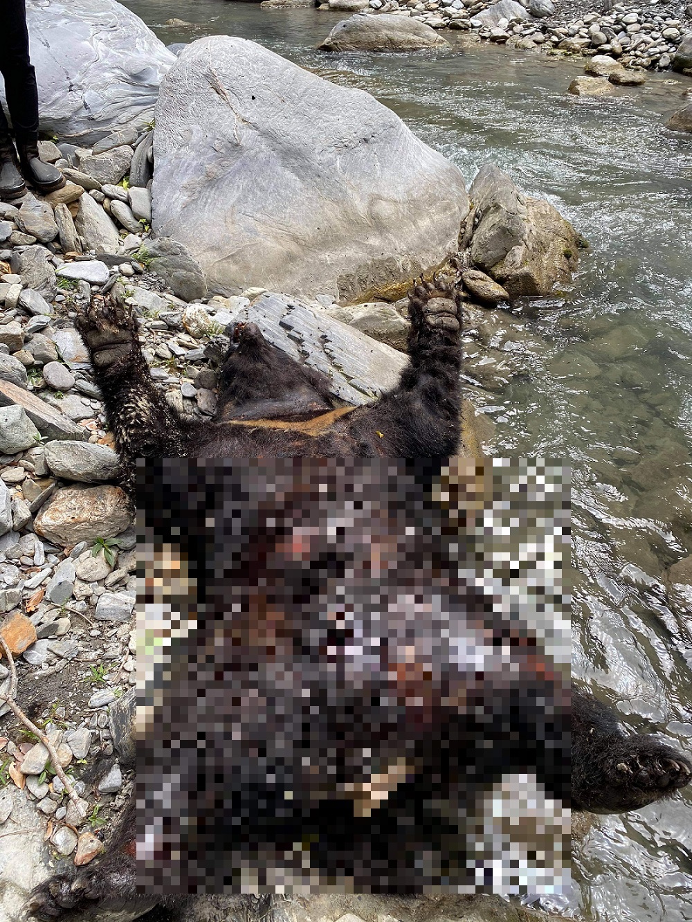花蓮林區管理處本(5)月11日接獲民眾通報,在卓溪鄉拉庫拉庫溪上游溪谷發現1頭黑熊仰臥溪邊已死亡多日,屍體已發臭,立即指派獸醫師協同保七總隊第九大隊、卓溪高山協作及玉山國家公園人員等一行9人前往現勘,歷經4天跋山涉水,昨(15日)以衛星電話與無線電回報,死亡黑熊為成年公熊,屍體已嚴重腐爛,推估死亡超過2週,應屬自然死亡。 林管處表示,從大分山屋出發至發現熊跡沿路上沒有近期狩獵痕跡,亦無獵寮、獵具或生火的跡象。黑熊死亡地點屬秀姑巒事業區第14、17林班交界溪流,四周皆峭壁,鄰近只有一條稍微明顯的獸徑,據此推測陳屍地點為第一現場,屬自然死亡且超過2週。 現勘過程由保七總隊第九大隊全程錄影,經獸醫朱何宗採檢,推估死亡黑熊年紀大於3歲小於10歲,量測體長132cm、頭圍30cm、上犬齒5cm、下犬齒3cm,掃描後,沒有發現晶片,簡易採檢肌肉及毛髮樣本後,大體現場就地掩埋完成。 林管處呼籲,民眾若於山區發現台灣黑熊切勿驚慌,應安靜謹慎退回、不打擾黑熊並保障自身安全;若在野外發現死亡黑熊,建議立即通知相關單位,可撥打林務局24小時免費通報電話(0800-000-930)、花蓮林區管理處(03-8325141#275)、玉里工作站(03-8885450)、玉山國家公園管理處(049-2773121)。