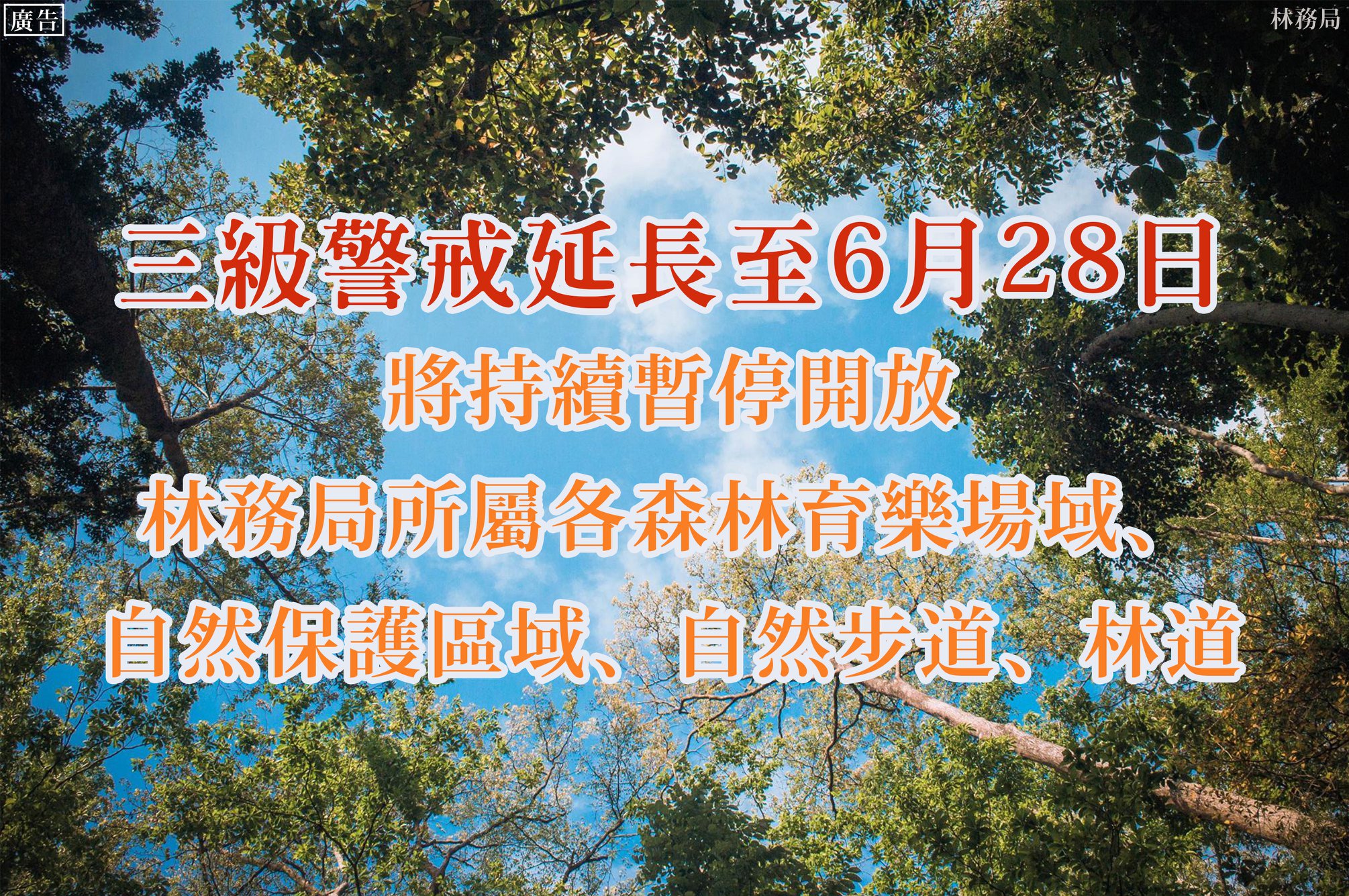 因行政院表示延長新冠肺炎全國三級警戒至6月28日及林務局依照第三級疫情警戒區域指引,為減少非必要之跨區及遊憩接觸,花蓮林區管理處轄管的池南國家森林遊樂區、富源國家森林遊樂區、瑞穗生態教育館、池南自然教育中心、佐倉步道館、林田山林業文化園區、大農大富平地森林園區、田浦生態池及轄內11條步道(佐倉步道、撒固兒步道、月眉山步道、能高越嶺東段、鯉魚山步道群、森版步道、安通越嶺道西段、富源國家森林遊樂區步道群、八通關越道-鹿鳴吊橋段步道、富興步道、虎頭山步道),持續至6月28日止暫停開放。 各園區持續暫停售票服務,各場域原訂活動則延期辦理,富源國家森林遊樂區預訂住宿之遊客取消訂房並全額退費。提醒遊客,暫勿前往戶外或山區,全民一同做好防疫措施,相關場域休園期間,亦請勿擅入,以維護自身安全,後續防疫措施將視中央流行疫情指揮中心發布最新資訊調整後公告。 更多相關訊息,請上「池南國家森林遊樂區」、「大農大富平地森林園區」、「林田山林業文化園區」、「瑞穗生態教育館」、「花蓮林區管理處」臉書粉絲專頁查詢。 山林悠遊網網址: https://recreation.forest.gov.tw/ 花蓮林區管理處臉書粉絲專頁: https://www.facebook.com/hualien.forest.gov.tw/ 池南國家森林遊樂區臉書粉絲專頁:https://www.facebook.com/ChihnanNationalForestRecreationArea/ 大農大富平地森林園區臉書粉絲專頁: https://www.facebook.com/MASADIFOREST/ 林田山林業文化園區臉書: https://www.facebook.com/ilovemorisaka/ 瑞穗生態教育館臉書粉絲專頁: https://www.facebook.com/rsecology