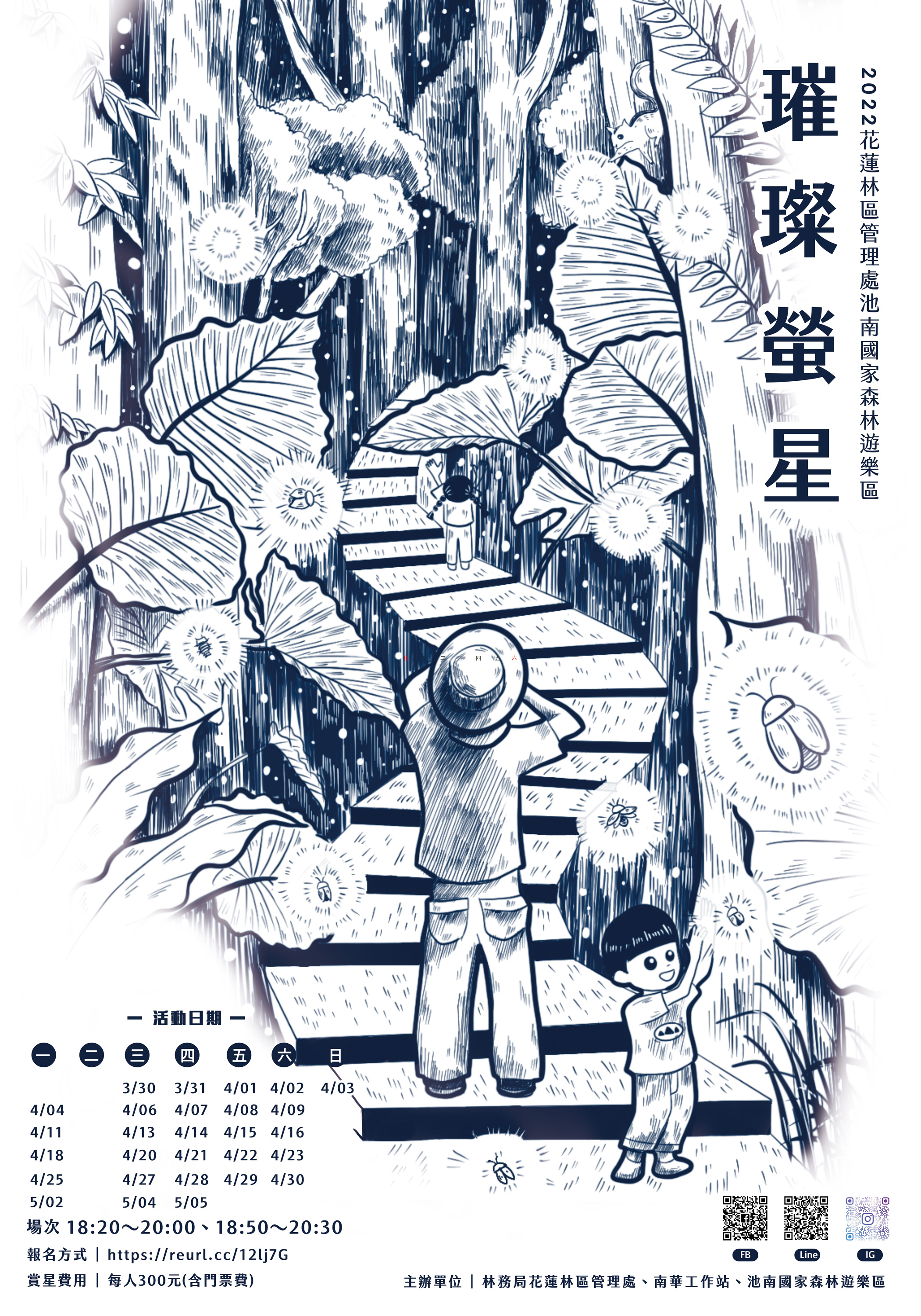 花蓮林區管理處池南國家森林遊樂區將於3月30日(三)至5月5日(四)辦理「璀璨螢星」賞螢活動,推出高品質、低干擾的生態遊程,邀請民眾在感受螢河環抱的浪漫景緻及聆聽森林交響樂之中,認識螢火蟲,探索一閃一閃飛舞的發光原理,欣賞靜夜中璀璨的螢光精靈。 林管處致力於生態復育、棲地營造及環境教育推廣,以維護森林資源、豐富生態系統、深植永續議題;螢火蟲的棲地需要乾淨、無污染的環境,是最典型的環境指標之一,在池南能看見大量螢火蟲在此繁殖,等於為池南的好環境做了最佳的背書。國家森林志工及環境教育教師在現場提供專業導覽,教導賞螢技巧、解說棲地環境,期盼參與者進而關懷並支持友善環境。 活動自3月15日(二)上午8時起開放線上報名,每日2梯次,每梯30人(分二隊),適合3歲以上孩童及一般民眾參與,費用為每人300元,策略聯盟住宿客每人優惠280元,皆包含門票、保險費、課程費用等,並提供遊樂區賞螢活動限定國產材禮品乙份! 相關活動資訊可參閱池南國家森林遊樂區臉書粉絲專頁,或電洽池南國家森林遊樂區(03)864-1594#13。 報名網址:https://reurl.cc/12lj7G