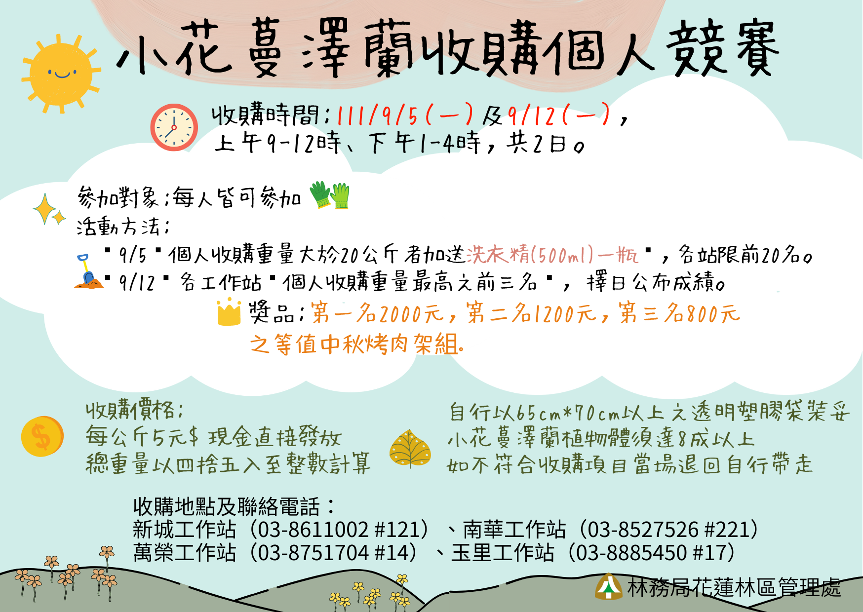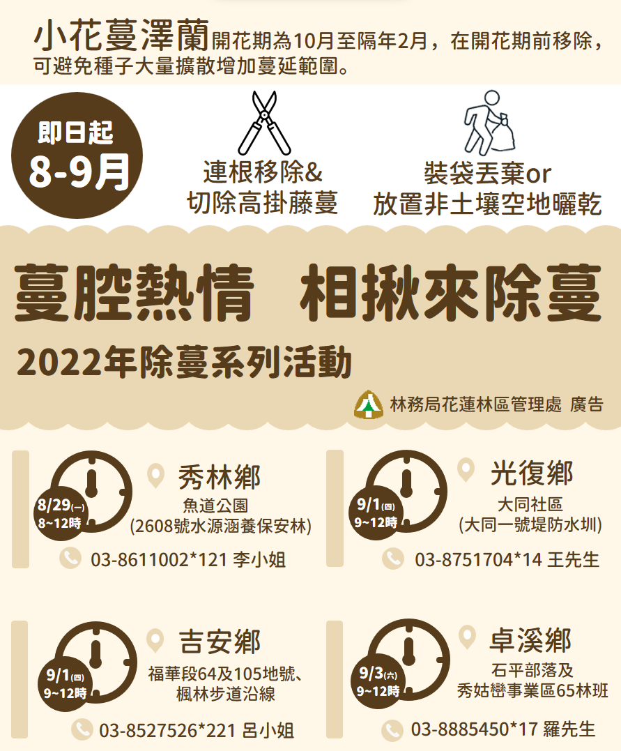 為加強宣導小花蔓澤蘭防治,花蓮林區管理處9月起辦理「工作站除蔓競賽」及「防治月除蔓個人競賽」宣導活動,鼓勵社區及民眾相揪動手除蔓,除可維護生態外,還能拿好禮! 工作站除蔓競賽4場活動由林管處4個工作站號召當地社區參加,除蔓總公斤數最多的社區及工作站,可獲得木酢達人研發小花蔓澤蘭洗衣精,有興趣的民眾請以社區為單位向工作站報名參加。 工作站除蔓競賽第一場活動由新城工作站與水源社區發展協會合作,已於8月29日辦理完成,清除2608水源涵養保安林內小花蔓澤蘭共計75公斤。 9月1日北中二場除蔓接棒,北區由南華工作站結合太魯閣族協會在吉安鄉楓林步道除蔓,中區由萬榮工作站結合大同社區發展協會在光復鄉大同堤防清除銀膠菊及小花蔓澤蘭。 9月3日最後一場活動由玉里工作站在卓溪鄉石平社區舉辦,宣導小花蔓澤蘭、銀膠菊、銀合歡三大外來入侵植物防治,並現場示範銀合歡移除作業。 除上述4場活動外,民眾動手除蔓還能賺外快!9月5、12日林管處所轄4個工作站,以每公斤新台幣5元收購小花蔓澤蘭,還可加碼參加防治月除蔓個人競賽。林管處表示,9月5日至工作站收購小花蔓澤蘭,各站前20名收購重量大於20公斤者即送小花蔓澤蘭洗衣精1瓶(送完為止);9月12日收購重量最高前三名提供2,000元、1,200元及800元之等值獎品。 林管處呼籲,小花蔓澤蘭為強勢外來入侵種,現已大面積分布在花蓮低海拔山坡地及休耕農地,造成生態嚴重危害,民眾可從住家周遭開始著手拔除,除蔓記得以人工將根部挖(拔)除,攀附在樹體上的藤蔓則需拔除根系後,懸掛起來任其枯萎,每年10月開花前除蔓效果最佳。