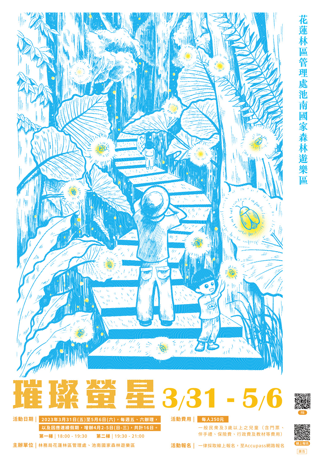 花蓮林區管理處池南國家森林遊樂區將於112年3月31日(五)至5月6日(六)每週五、六、連續假日辦理「璀璨螢星」賞螢活動,推出高品質、低干擾的生態遊程,邀請民眾在感受螢光浪漫景緻及聆聽森林交響樂之中,認識螢火蟲,探索一閃一閃飛舞的發光原理,欣賞靜夜中璀璨的螢光精靈。 林管處致力於生態復育、棲地營造及環境教育推廣,以維護森林資源、豐富生態系統、深植永續議題;螢火蟲的棲地需要乾淨、無污染的環境,是最典型的環境指標之一,在池南能看見大量螢火蟲在此繁殖,無形中為池南的友善環境做了最佳的背書。國家森林志工將會於現場提供專業導覽,教導賞螢技巧、解說棲地環境,期盼參與者進而關懷並支持友善環境。 活動自3月17日(五)上午10時起開放線上報名,每日2梯次,每梯30人(分二隊),適合3歲以上孩童及一般民眾參與,費用為每人250元,皆包含伴手禮(限定螢光禮)、導覽課程費用、保險費、夜間門票、行政費等,旅行社、民宿飯店等如有包團需求,請逕洽專線由專人服務。 相關活動資訊可參閱池南國家森林遊樂區臉書粉絲專頁,或電洽池南國家森林遊樂區(03)864-1594分機13。 報名網址:https://www.accupass.com/go/2023chihnanfirefly 服務諮詢專線:03-864-1594分機13(黃小姐)、03-8527526分機223(鄭小姐)或03-8325141分機271(阮小姐)。