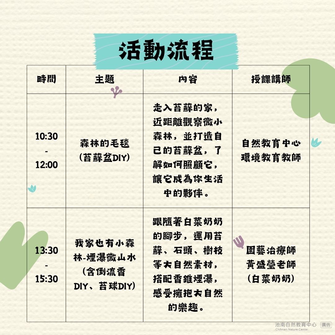 花蓮林區管理處池南自然教育中心5月13日(六)於池南國家森林遊樂區舉辦「話蘚為誼」療癒活動,歡迎幼稚園大班以上親子報名,親手DIY苔蘚盆、苔球與倒流香,把大自然打包帶回家,打造居家綠美學生活。 林管處積極推動森林療癒,鼓勵民眾親近山林,感受森林惠益,傳遞森林生態系多元服務價值。由自然教育中心環境教育教師及台灣園藝輔助治療協會秘書長黃盛瑩,帶領大小朋友運用苔蘚、石頭、樹枝等素材,DIY小巧可愛的苔蘚盆或苔球、捏製香錐煙瀑(倒流香)等,感受擁抱大自然的樂趣。 4月28日9點起開放線上報名,名額40人,額滿為止,費用為699元,含講師費、材料費、餐費與課程費用,交通須自理,活動另有多元價格方案,詳見報名網頁。 請上台灣山林悠遊網池南自然教育中心頁面線上報名,首次使用報名系統者,須先註冊為會員。相關活動資訊可掃QR碼,或查詢池南自然教育中心臉書粉絲團,亦可電詢中心教育推廣組(03)864-1594#15。 台灣山林悠遊網池南自然教育中心活動網址:https://tinyurl.com/nhjt6rct