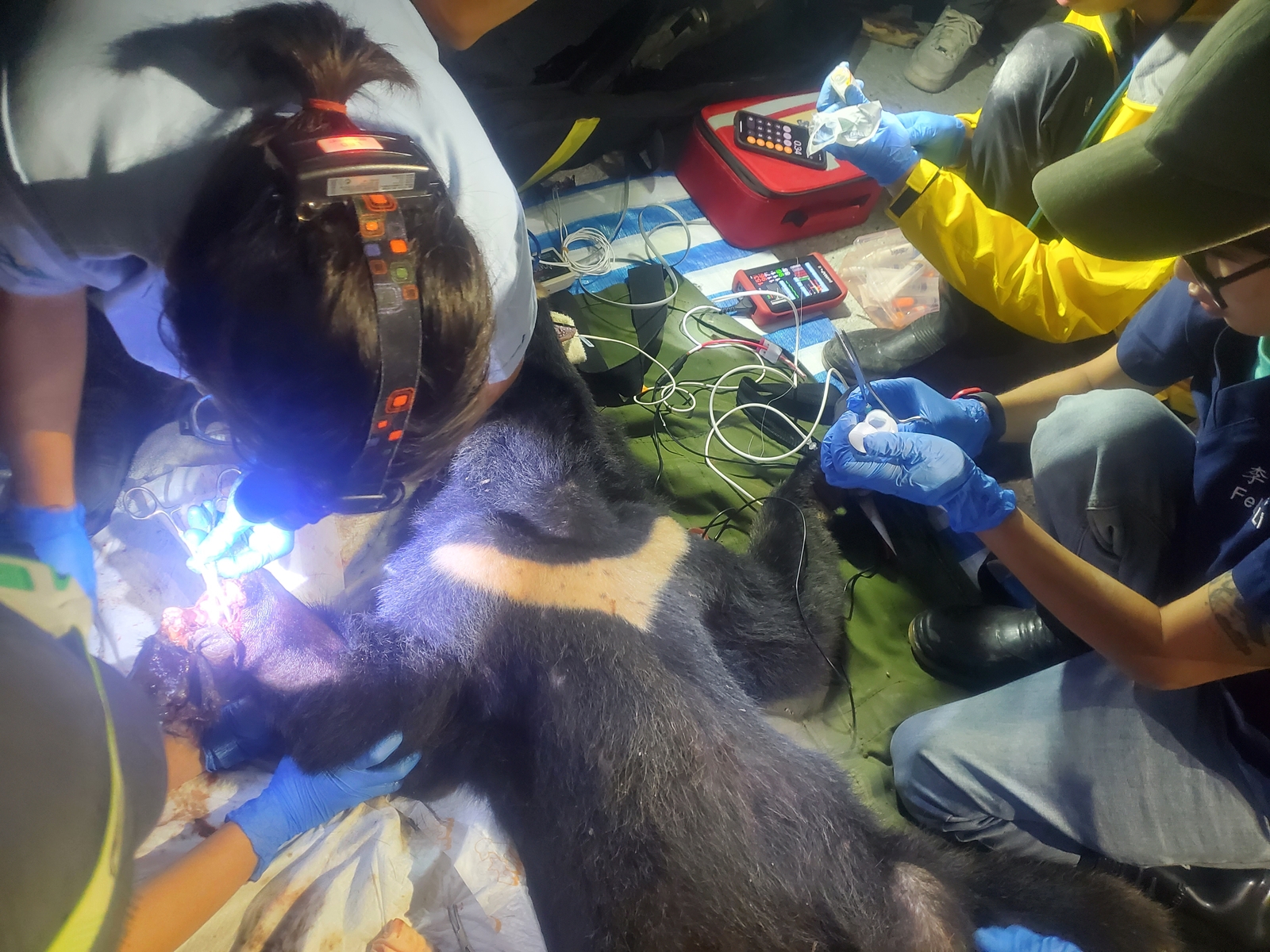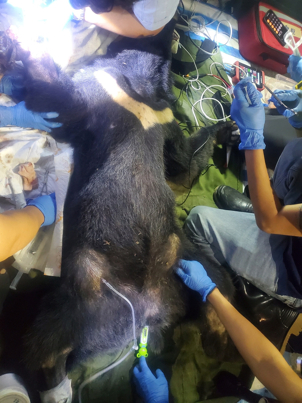 經檢視,受困黑熊為亞成母熊,體重34公斤,體態瘦弱,右前肢受困套索推估已至少2日。因其右掌腕關節以下明顯壞死,野灣團隊於現場立即進行清創及截掌手術,於近21時將黑熊送東部野生動物救傷中心暫留觀察,待傷勢復原後評估野放。