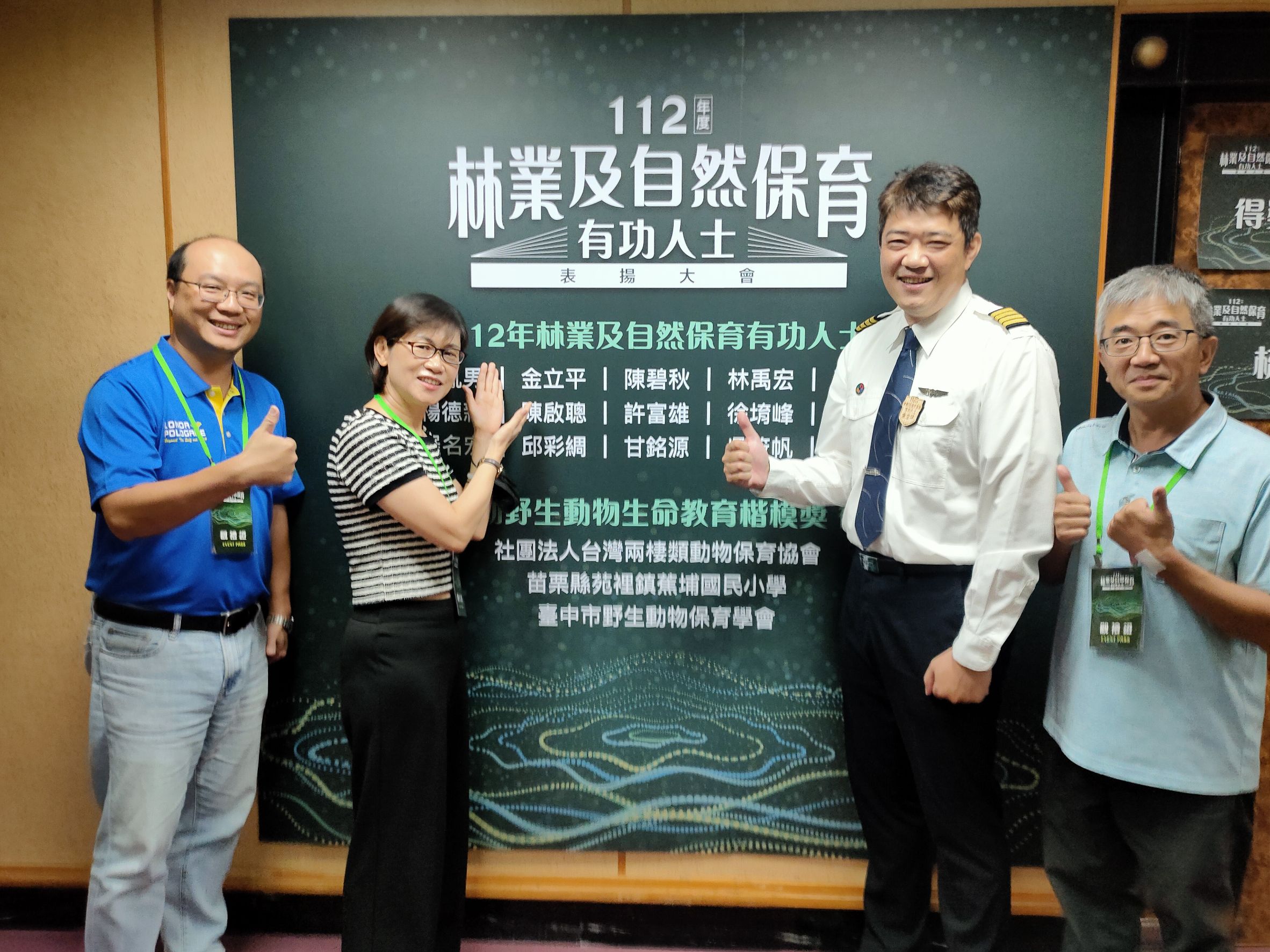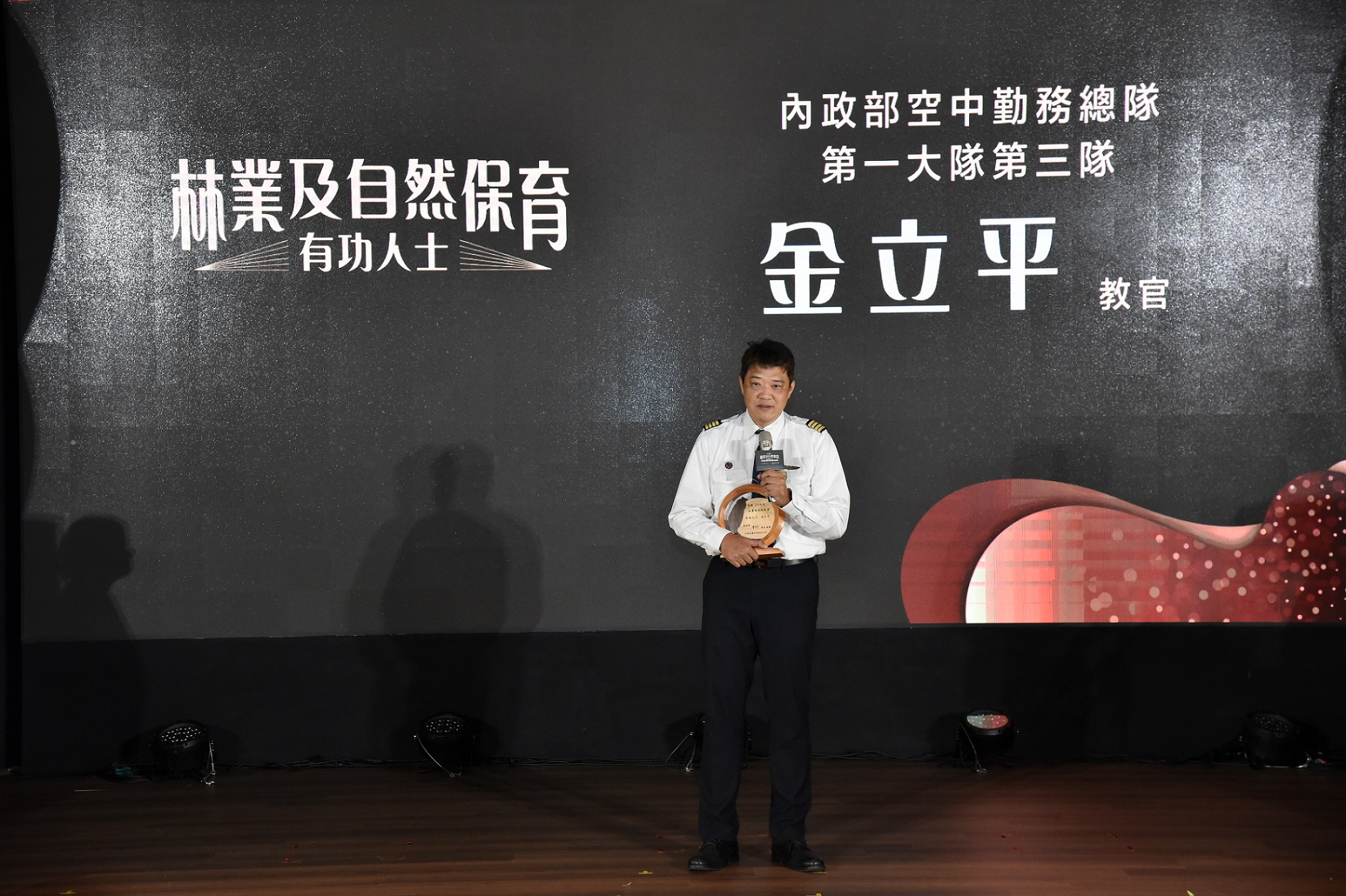 一年一度的臺灣綠色奧斯卡獎-林業及自然保育有功表揚大會,16日在台北盛大頒獎,內政部空中勤務總隊第一大隊第三隊飛行員金立平教官,以其專業協助林業及自然保育署花蓮分署執行直升機空中滅火、救火隊人員吊掛訓練及南安黑熊運輸任務,辛勤奉獻,獲大會公開表揚殊榮。