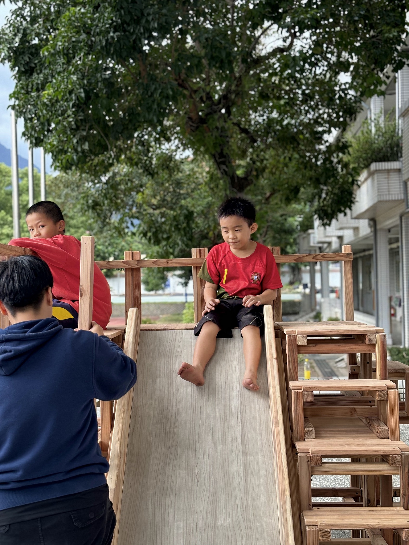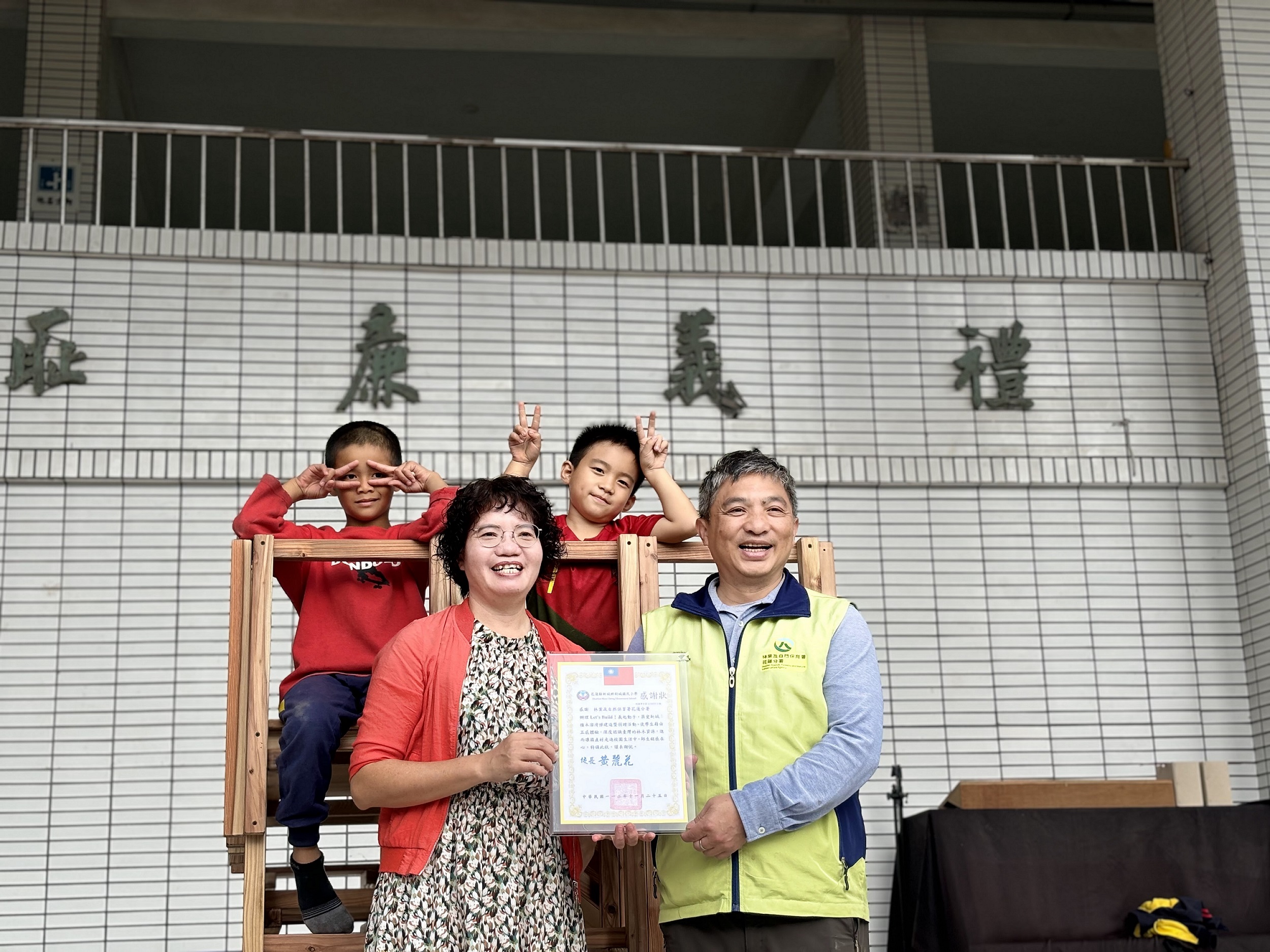 由林業及自然保育署花蓮分署輔導、以國產材為建材,扎根花蓮新城及秀林地區多年的台灣練習曲文教協會,今(25)日攜手台灣義築協會,合辦「Let’s Build!義起動手,築愛新城」義築行動,與志工一同打造一座富有環境教育意義的積木溜滑梯。在分署長黃群策見證下,將積木溜滑梯捐贈給新城國小,讓木育教育理念深植學童心中,與地方共創優質生活品質。