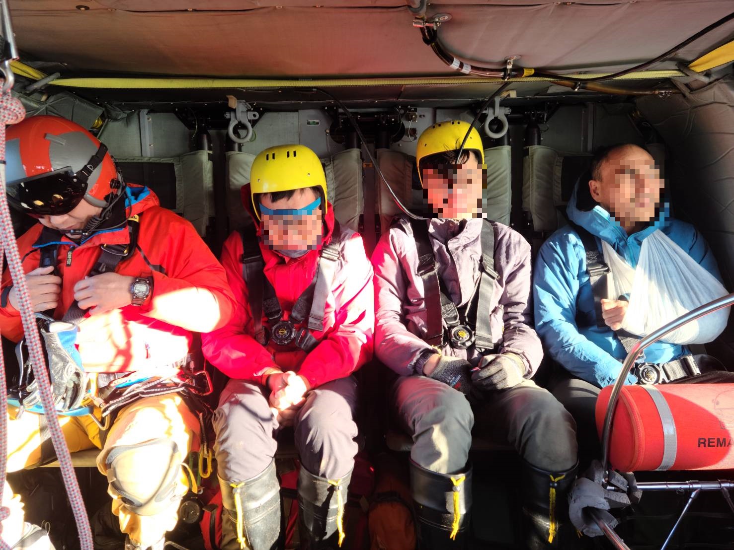 吊掛任務連續2日因山區雲霧覆蓋,多次嘗試均無法順利執行,幸運的是8日終於放晴,空勤直昇機得以順利起飛,成功將傷者吊掛下山,並送往慈濟醫院接受治療,其餘隊員則步行下山。