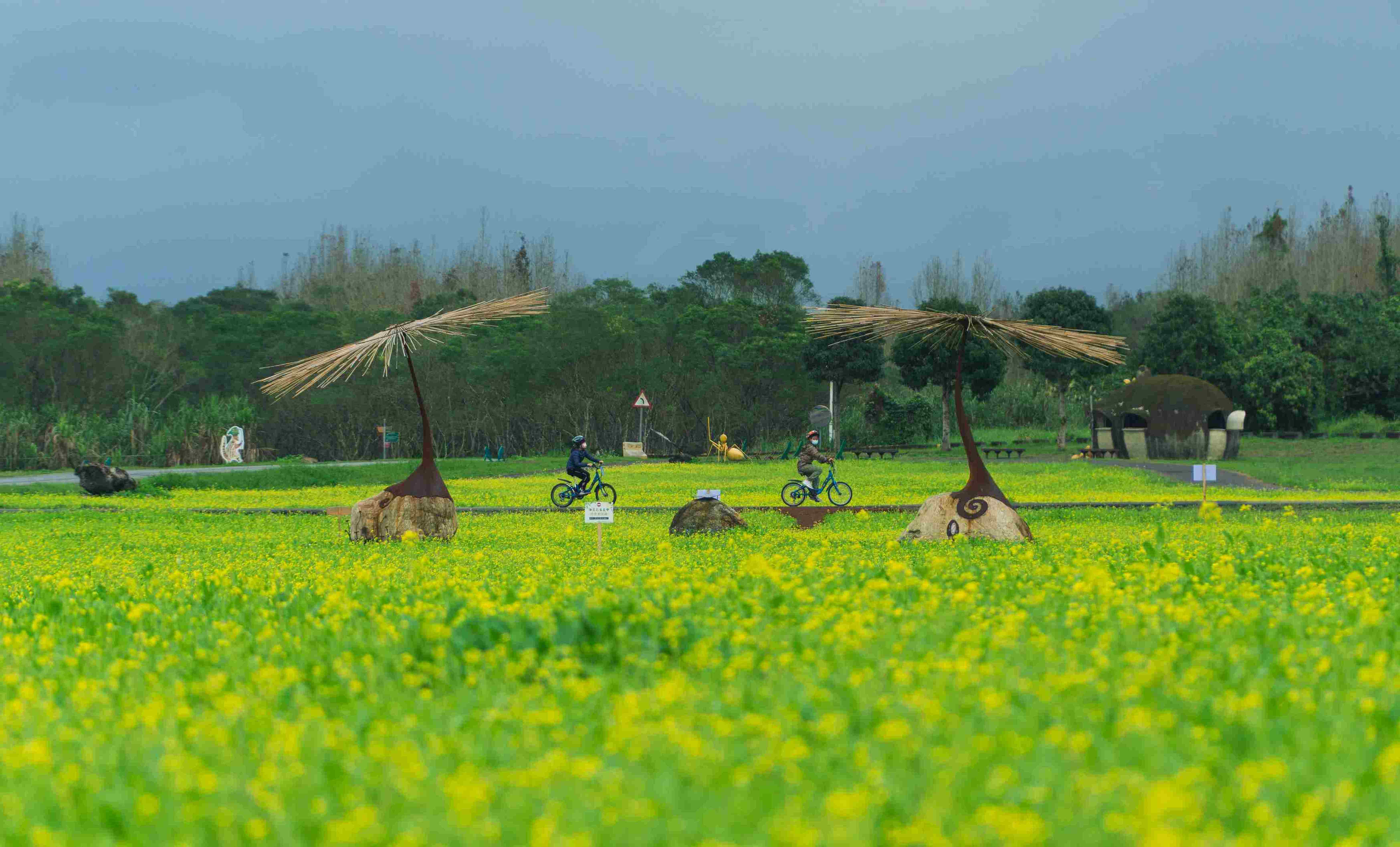 大農大富平地森林園區春節期間以大面積金黃色油菜花海襯托創作家「達鳳‧旮赫地」為故鄉太巴塱創作的「永恆的忻星」藝術品,還有迷人的森林自行車道及可愛的波波球景觀,歡迎騎乘單車暢遊園區林間自行車道及景觀花海區。2月10至14日(初一至五) 與園區花海合照打卡上傳FB/IG粉專,可憑畫面至遊客中心玩抽抽樂1次,試試手氣帶走各式精美小禮及松錳租車折價券!按讚或追蹤FB/IG粉絲專頁,可至遊客中心兌換明信片1張。