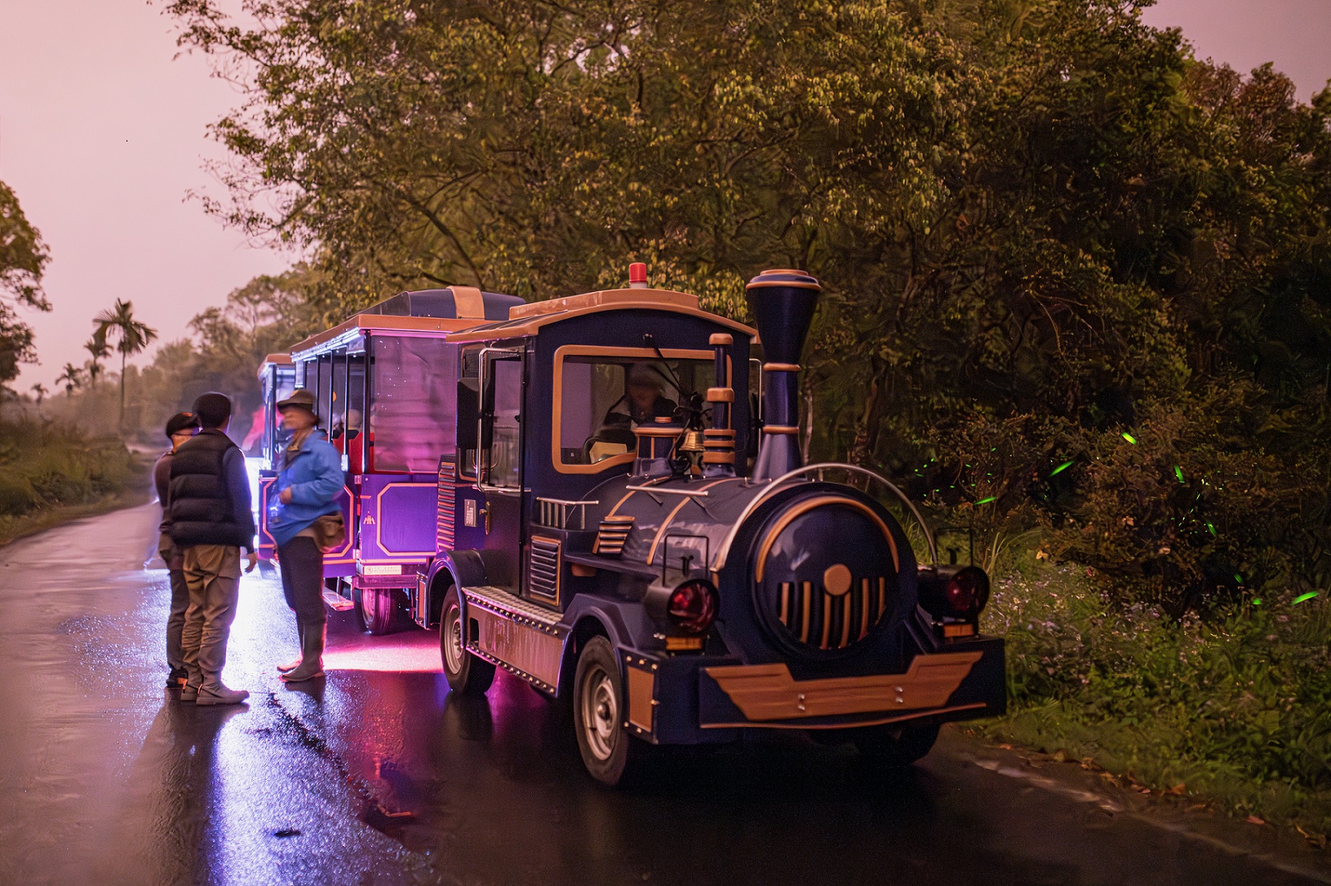 大農大富平地森林園區早期為製糖所需的種蔗農場,糖業鐵路五分車載著滿滿甘蔗的地景,也隨著製糖產業結束而消失。賞螢季推出期間限定「森林遊園小火車」,大農大富生態解說員隨車導覽解說,藉由豐富有趣的故事,讓民眾了解從甜蜜蔗香到清新森林香氣的更迭變化,對園區豐富生態有更多元認識。電動小火車每日班次與座位有限,請提早線上購票報名,體驗白天搭乘小火車享受森林浴,晚上接續參加螢火蟲的婚禮,放鬆身心享受平地森林精采萬變的美麗風貌。