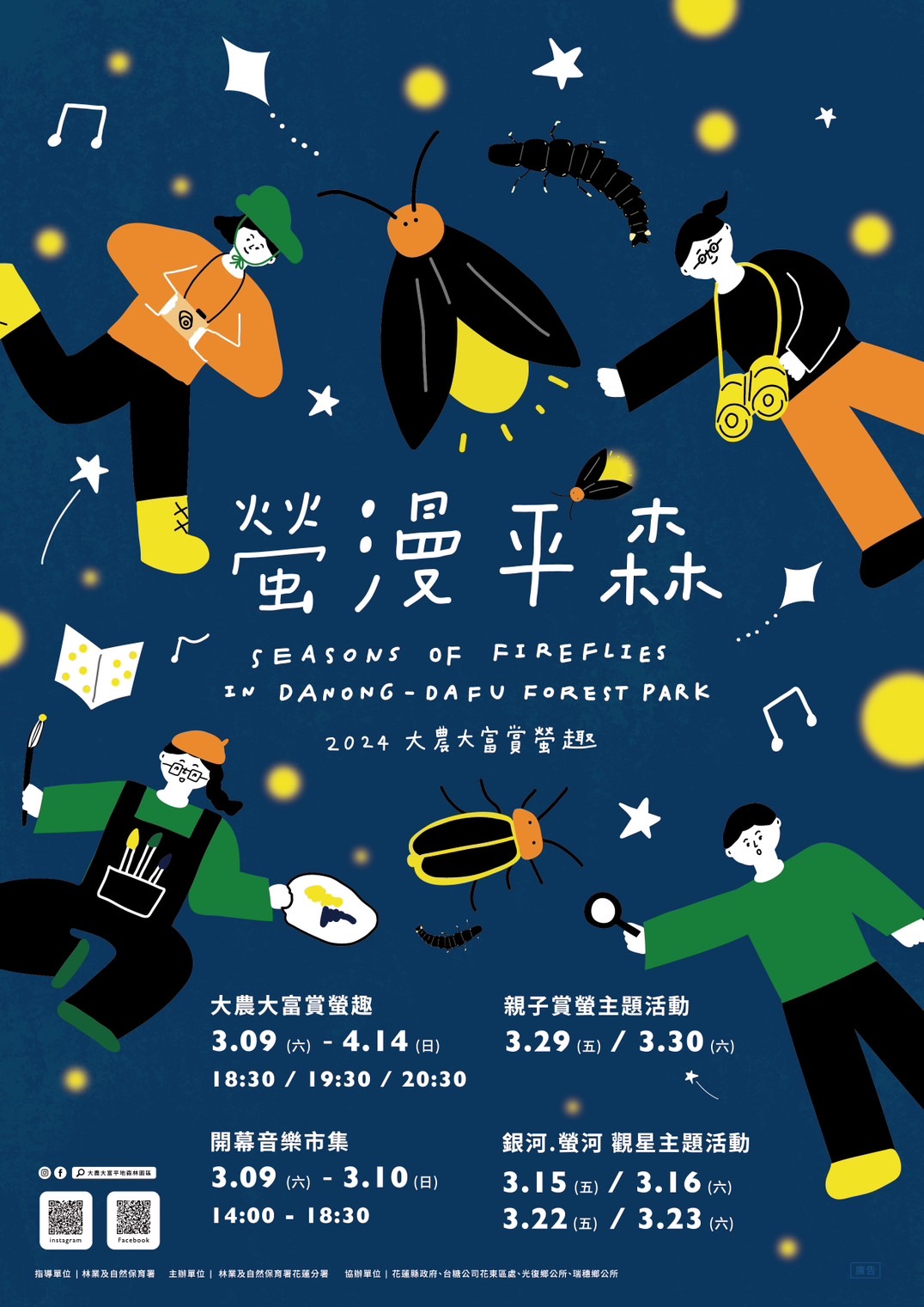2024「螢漫平森-大農大富賞螢趣」自3月9日至4月14日,於花蓮光復大農大富平地森林園區舉辦,林業及自然保育署花蓮分署歡迎民眾前來森林裡感受大自然的洗禮,搭乘森林遊園小火車體驗全台最早、面積最大的賞螢盛宴。