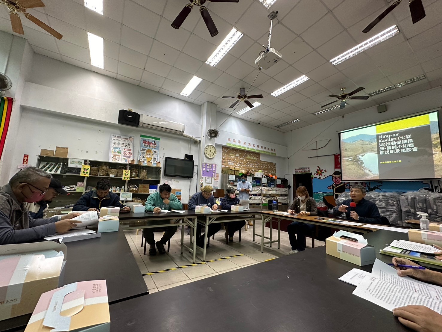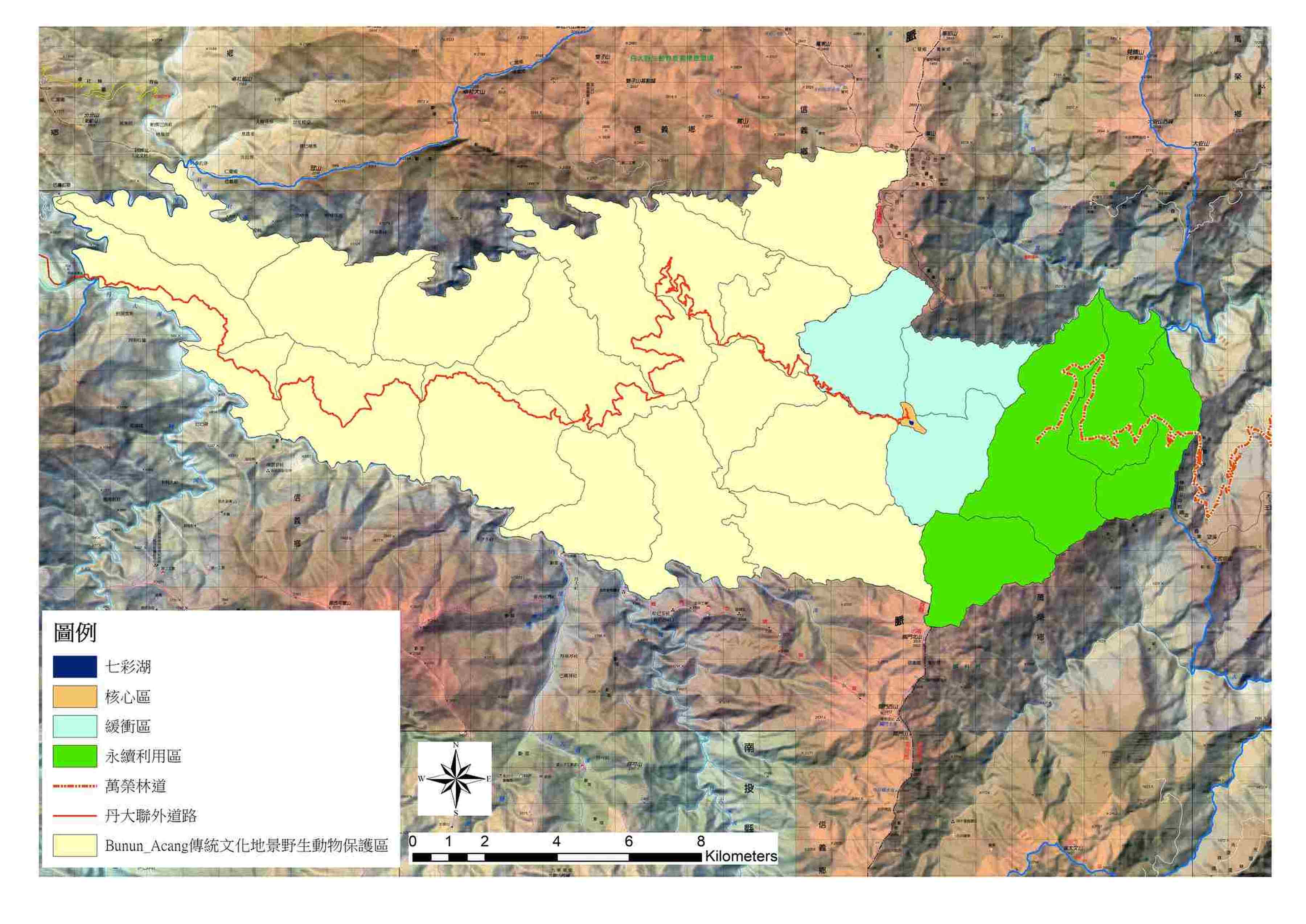 分署長黃群策表示,「Ning-av Kavilan七彩湖野生動物保護區」計畫依循聯合國2007年發布『原住民族權利宣言』精神,是全國第一處由下而上、與部落族人共同推動劃設的野生動物保護區,凝聚當地原住民族及相關單位共同努力,充分尊重其傳統文化和生活,並充分考慮其意見和建議,具劃時代重要意義。設立保護區不僅有助於保護七彩湖周邊自然環境,還能促進族人傳統文化傳承和生活發展。保育計畫書歷經多次與部落族人開會討論及研商後共同完成,規劃範圍為花蓮分署轄下林田山事業區林班地,指定七彩湖及其周邊第一條稜線為核心區域,西側將緊鄰南投分署推動劃設的『Bunun Acang傳統文化地景野生動物保護區』,並向外側擴展,依生態敏感度及保存原住民族文化地景等目標,劃設緩衝區以及永續利用區,其中原住民族相關文化傳統權益皆不受限制。目前全案已送請萬榮鄉公所協助確認踐行原基法後續程序,以確保計畫的合法性和可行性。