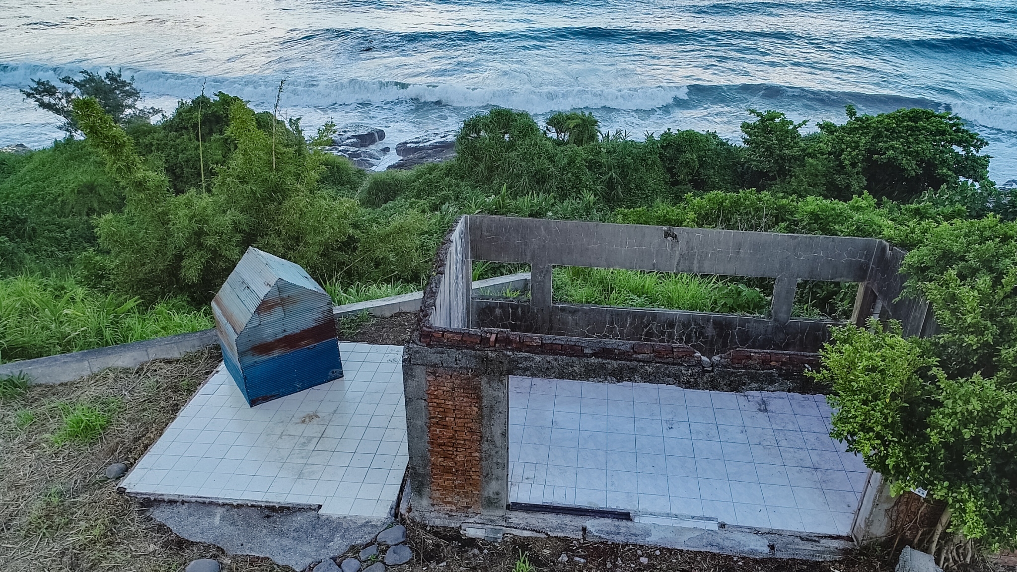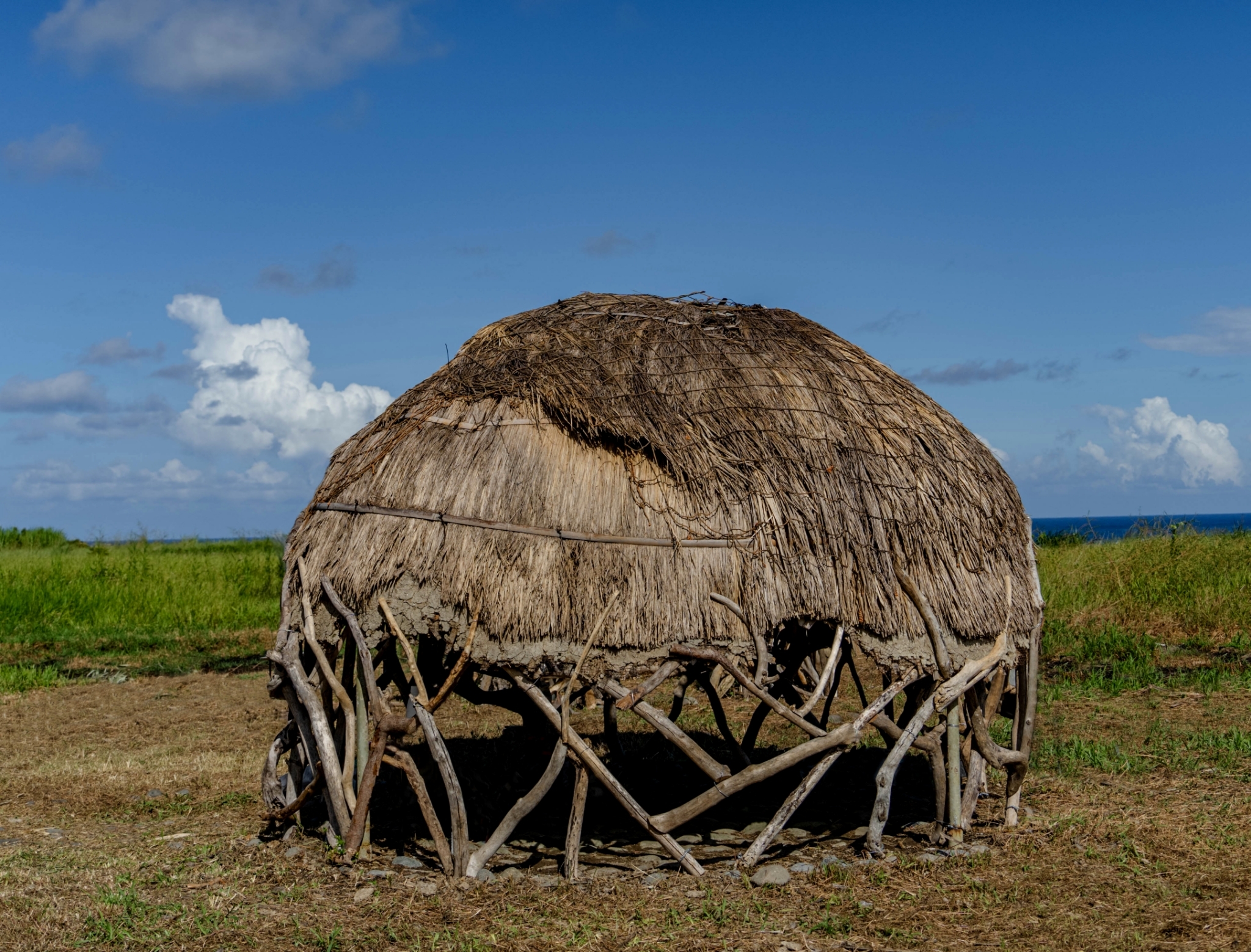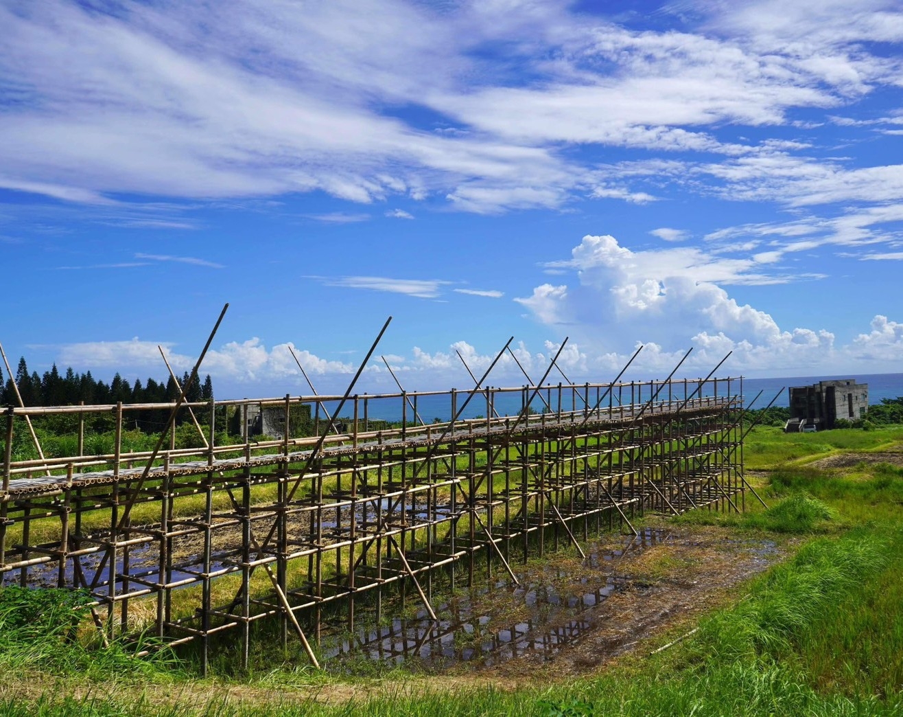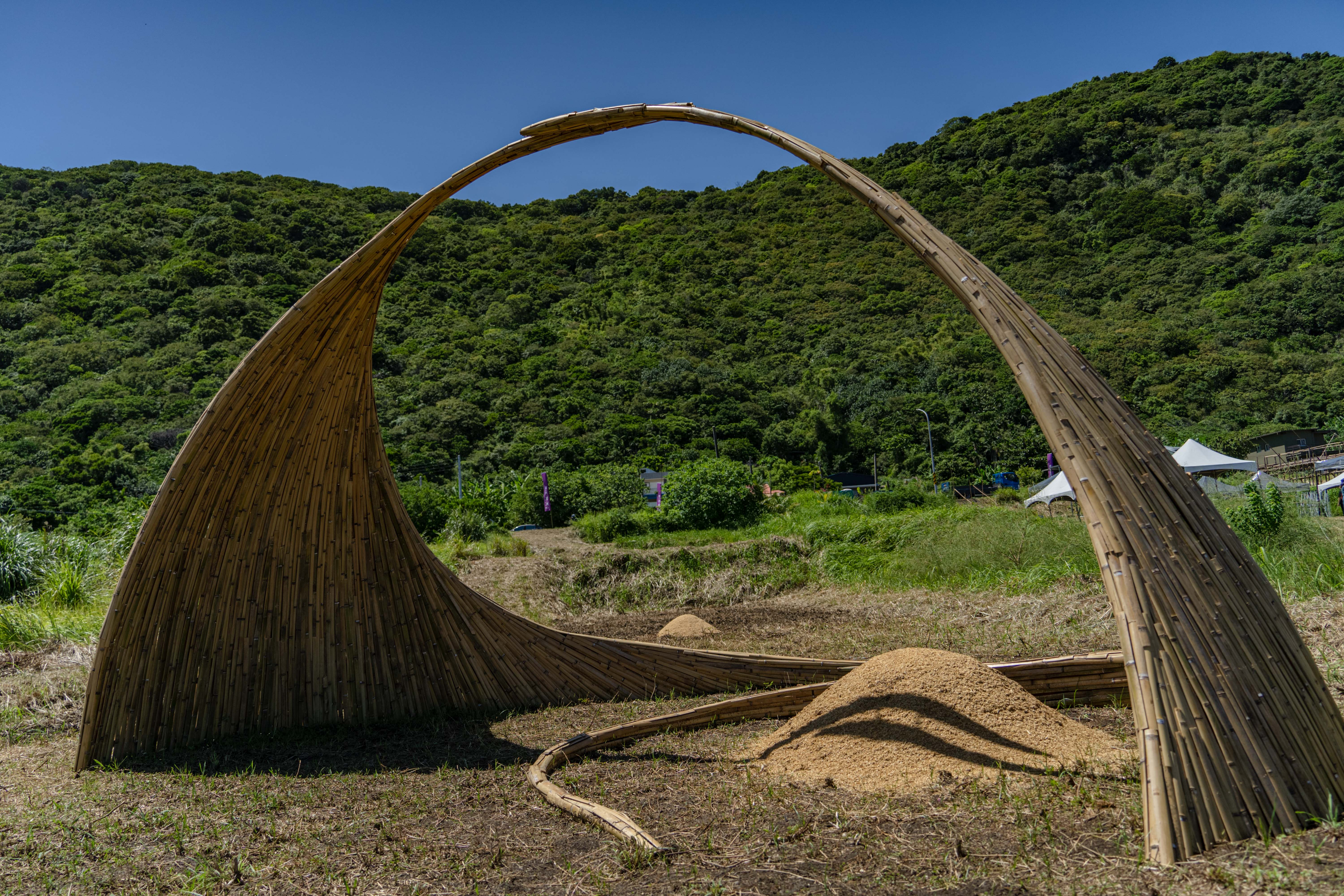 另一雙人組藝術家洪琳茹與黃建寰「看不見的風景」,以部落常見的藍鐵皮屋對應眼前的海浪,彷彿召喚遊子歸返,也牽引在此短暫交會的他方歸人。由陳冠華建築師率領的大武山工作隊,在石梯坪海梯田上創作「水平線向東」竹構橋,指向跨越族群回到最初-其實我們都是來自太平洋的某處。一樣設置在海梯田、港口部落藝術家撒部.噶照以「記憶中土地的味道」展現當代社會因為機械化而讓人與人、人與土地失去了緊密連結後,土地的味道似乎也不見了。