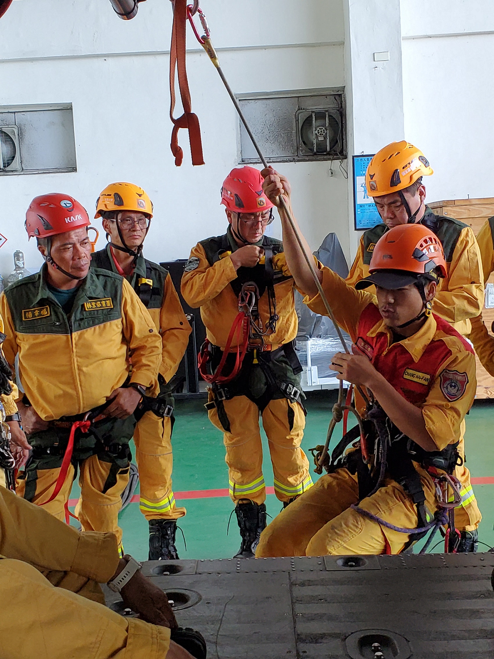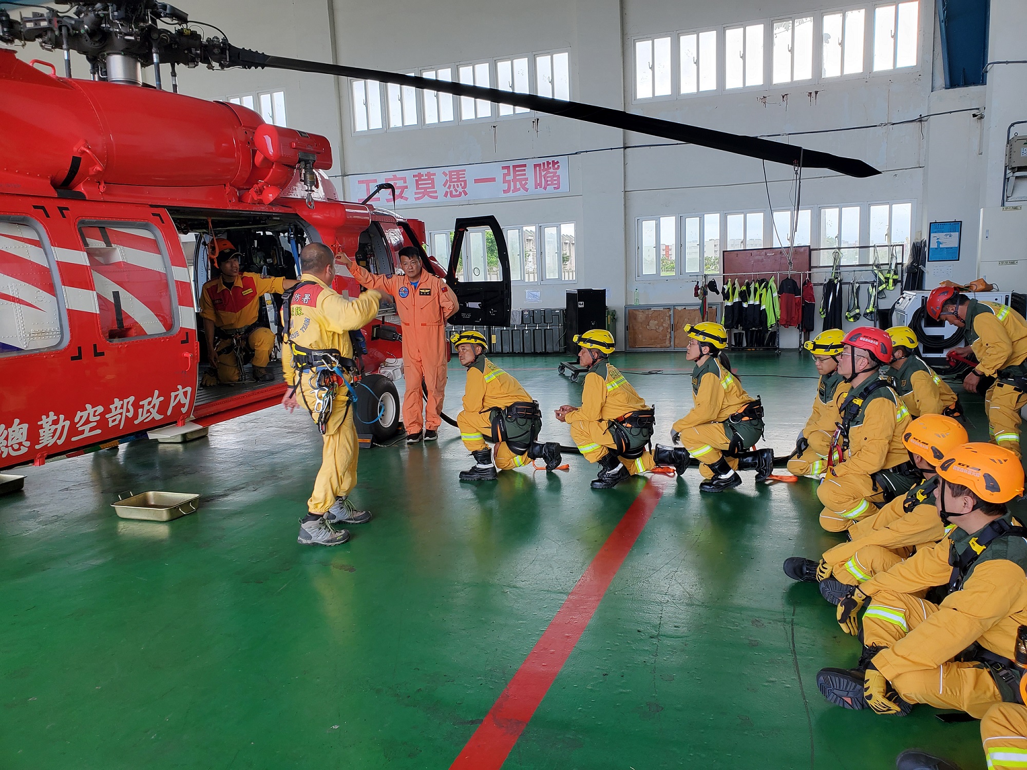 演訓動員40名救火隊員參訓,包含基本觀念的講授,直升機進出艙、救生吊掛、貨物吊掛與水袋搬運等棚廠實習與安全講解實作,以及人員與直升機的實際操作,訓練紮實。花蓮分署進一步說明,學科在室內講授有關救火隊員指揮手勢、直升機共勤應注意事項及山區臨時起降場開設等課程,讓參訓人員對陸空聯合作業有更深入了解;術科吊掛操作部分,讓參訓人員實際吊掛高空演練,增進火災救援觀念技術及效率,減少意外狀況發生。