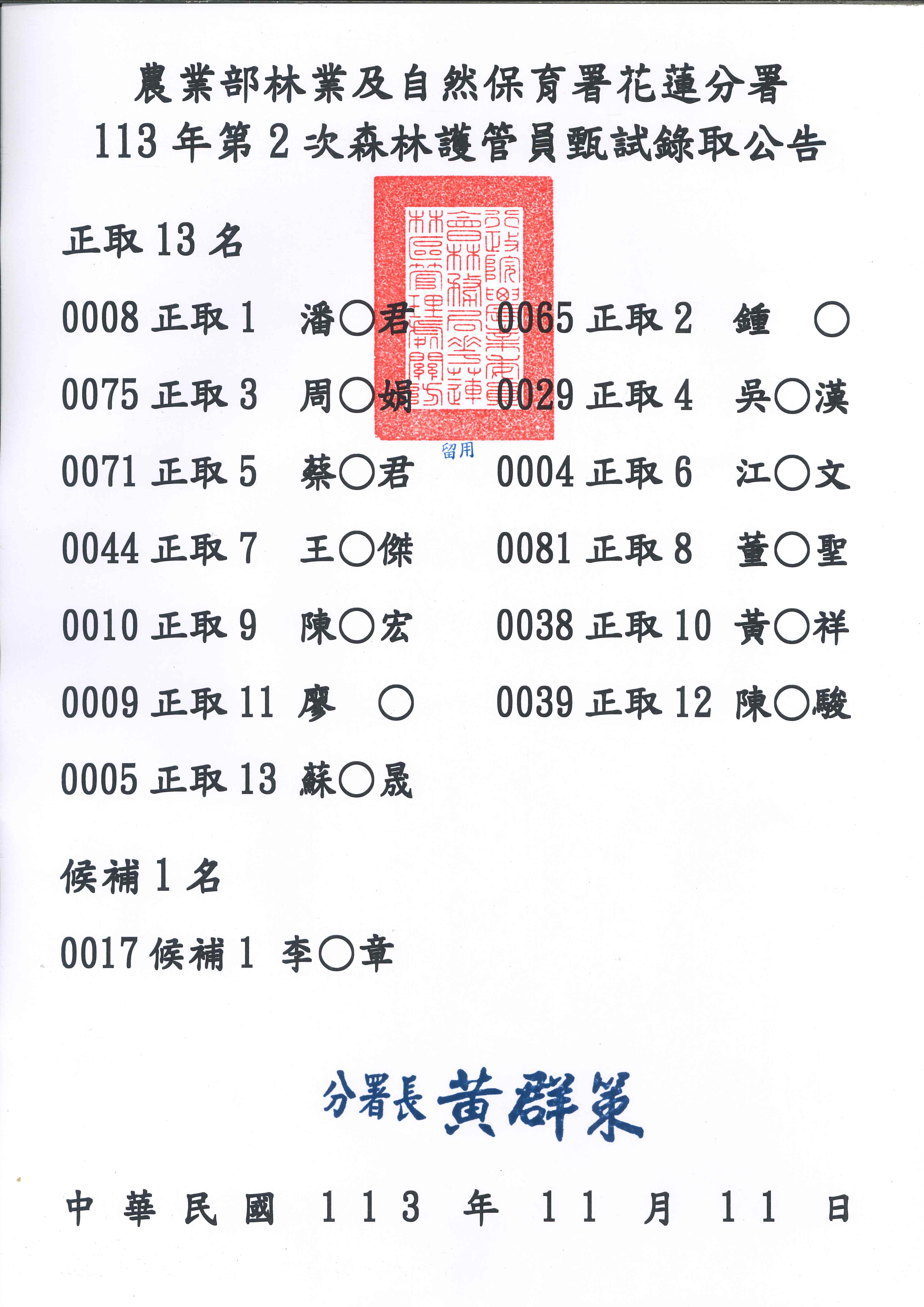 林業及保育署花蓮分署辦理113年第2次森林護管員甄試,符合報考資格83名,正取13名,經過11月9、10日一連2天緊鑼密鼓地進行術科及學科測驗後,今(11)日公告榜單於大門口布告欄、臉書專頁及官網,歡迎查詢。