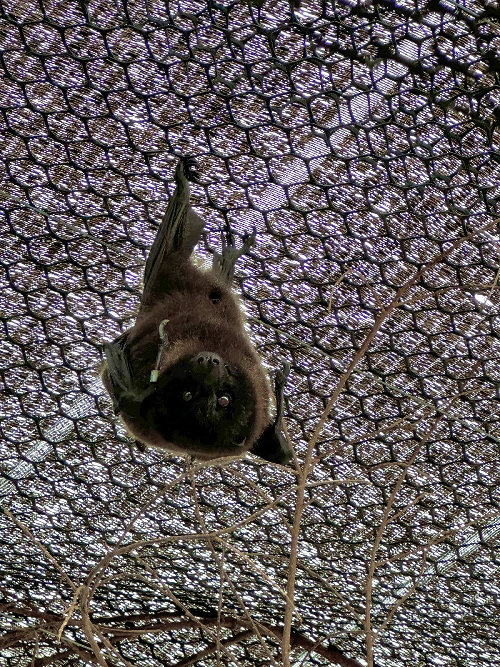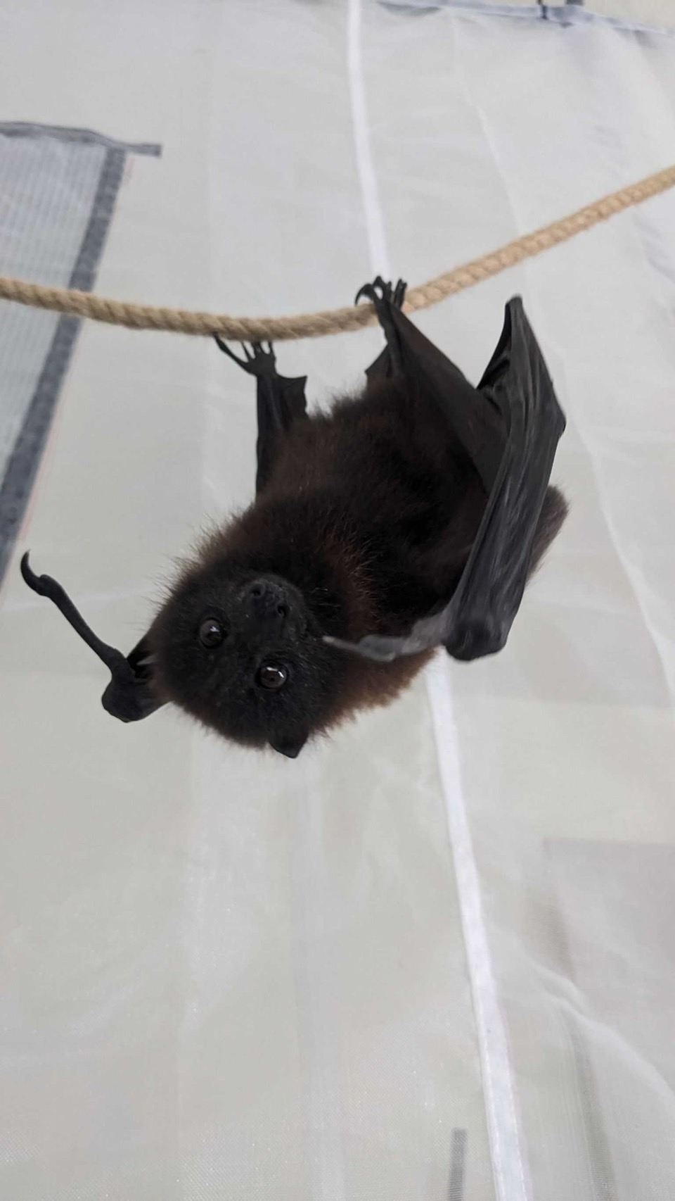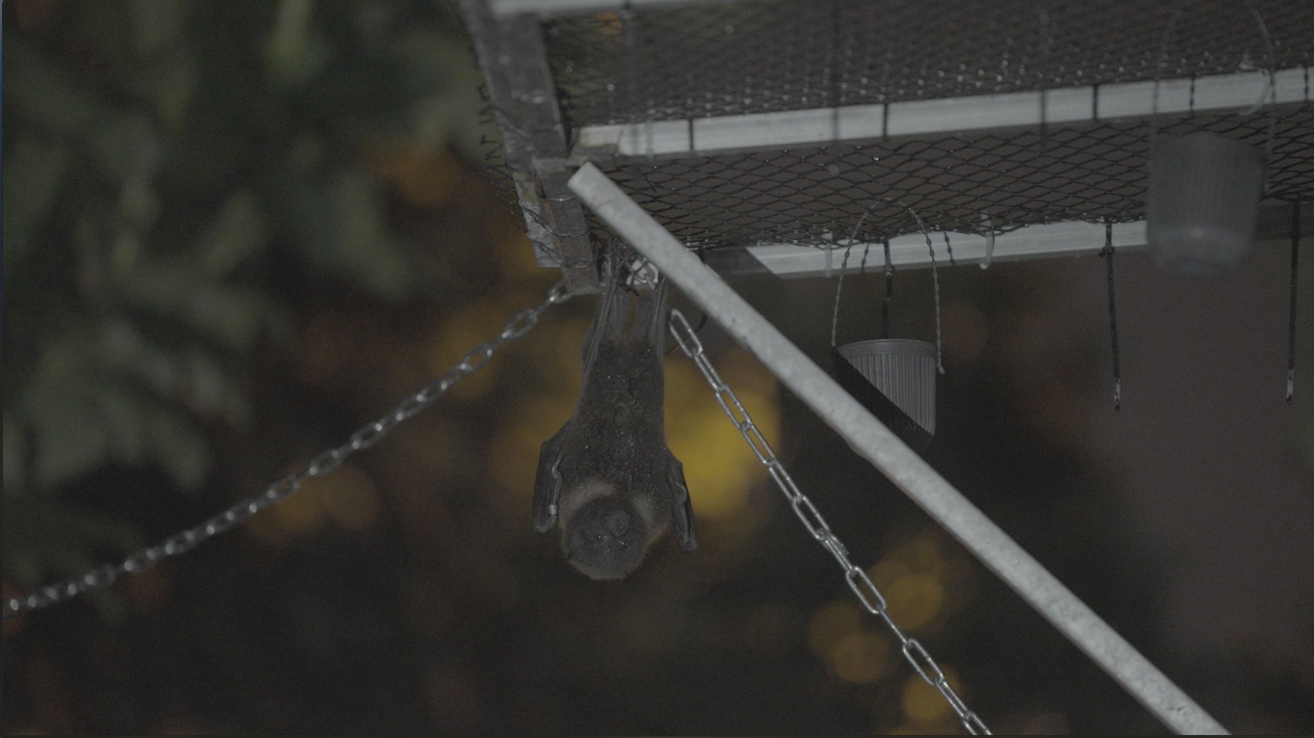 經野灣團隊半年多的照養,已是成年個體的狐蝠(體重307公克),因此先於2週前回到花蓮,入住空間較寬闊的軟野放籠舍,使其適應野外環境、晝夜變化,並可練習長距離的飛行。籠舍設計兩個活動窗,12日晚間已開啟籠舍,狐蝠在活動窗開啟後慢慢探索外界環境,終於晚間8點多飛離籠舍。