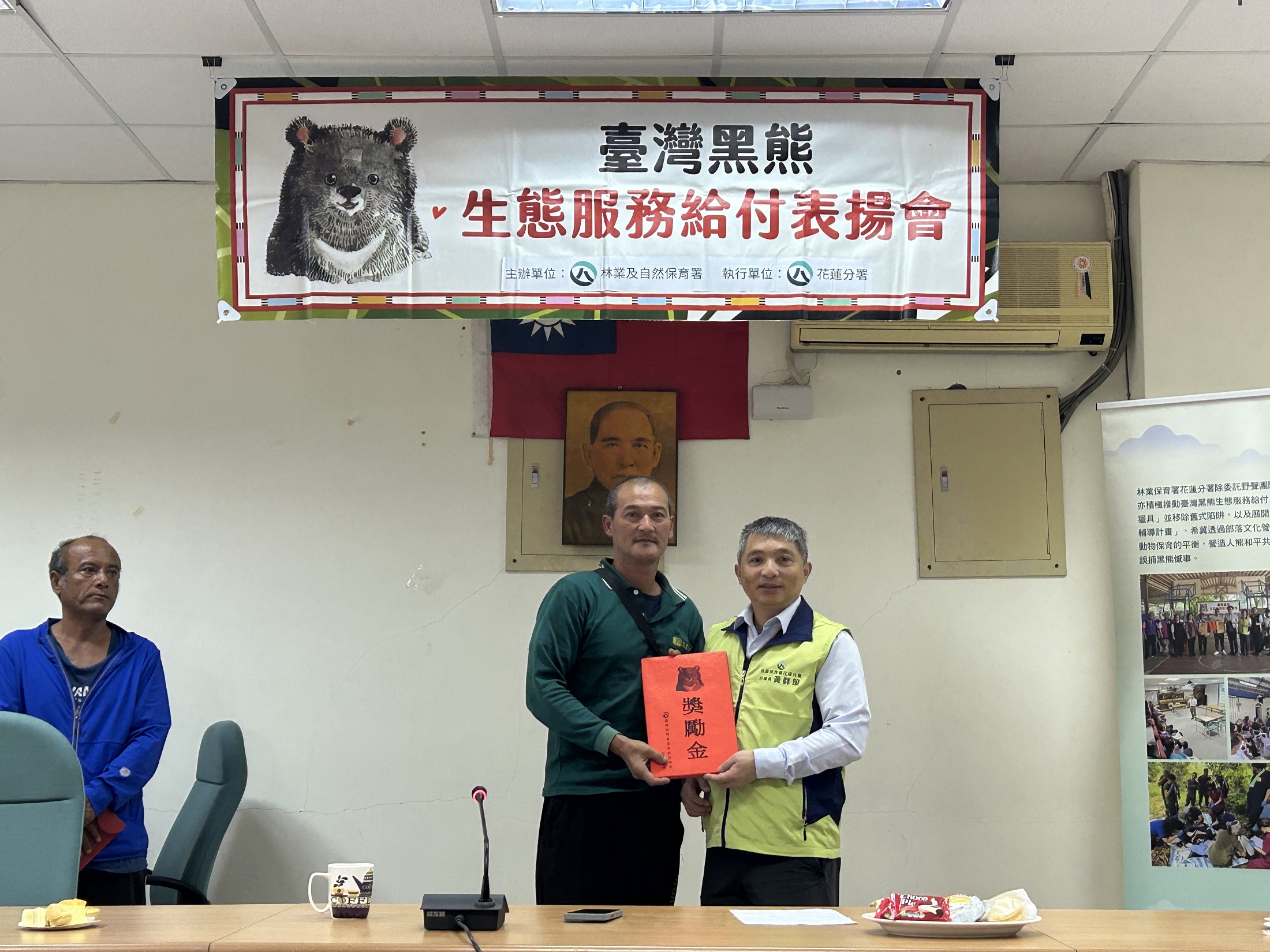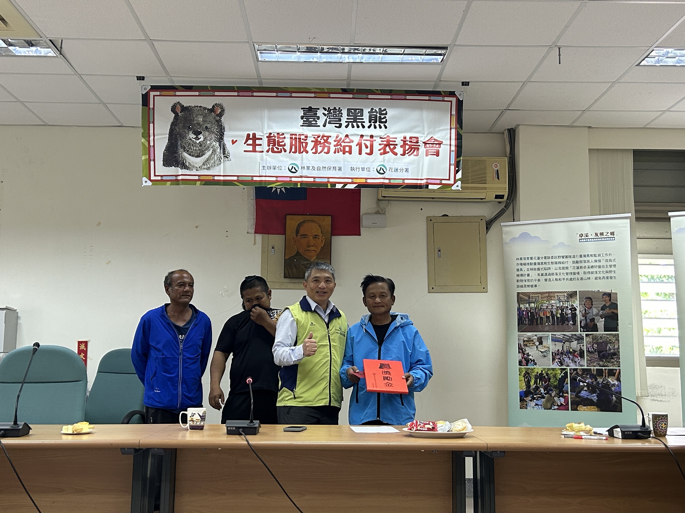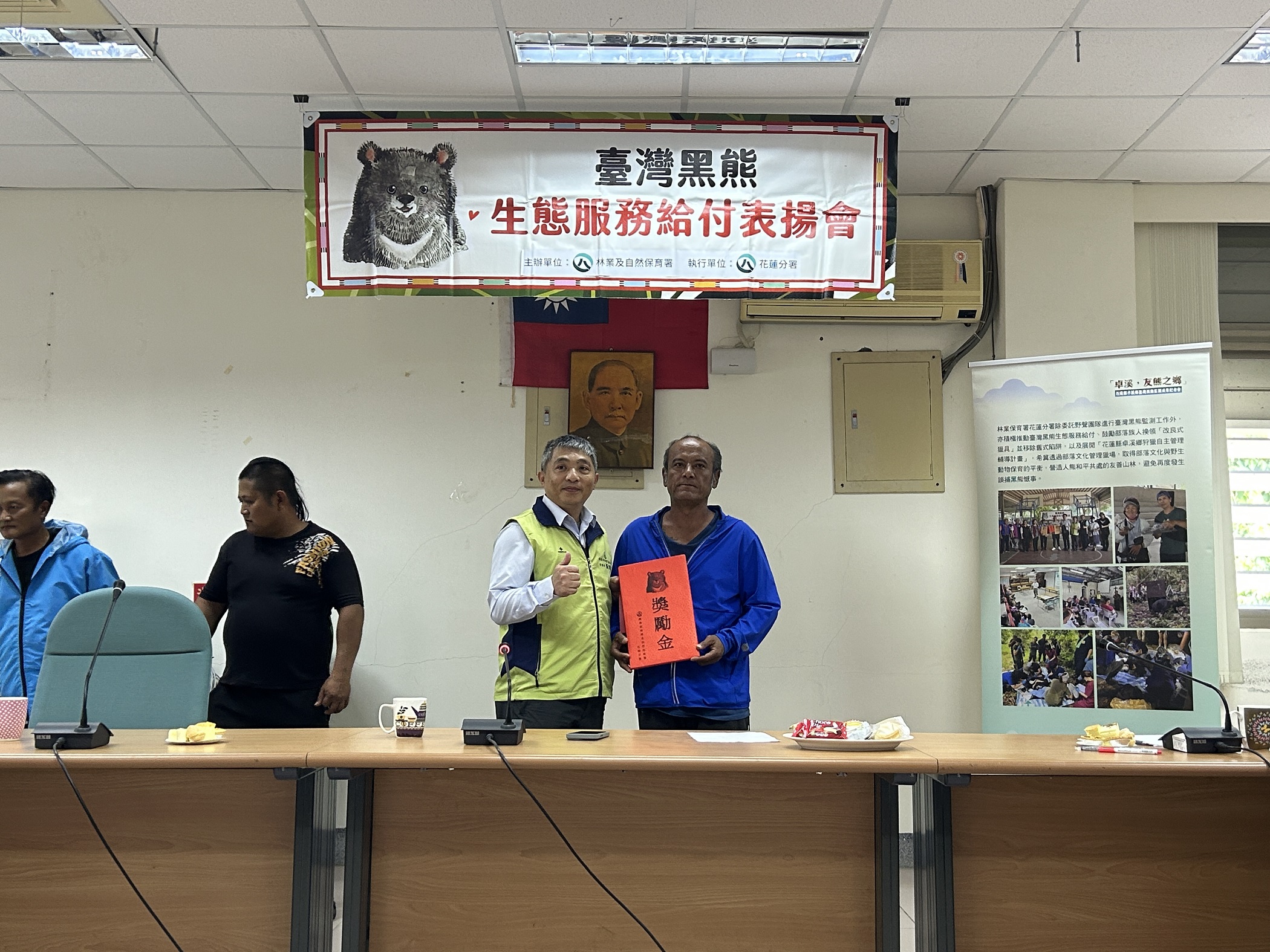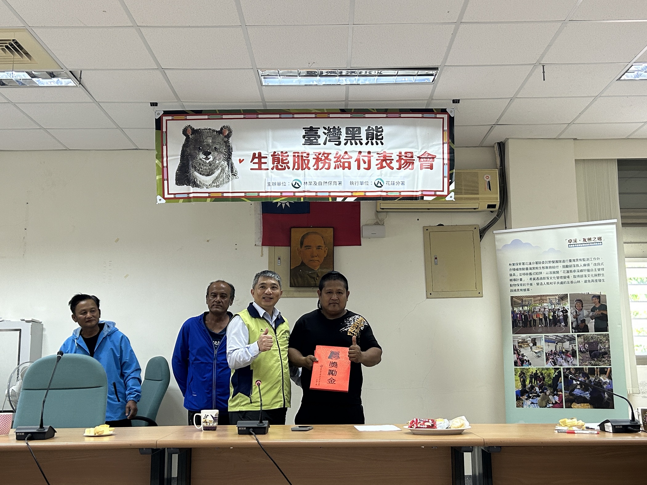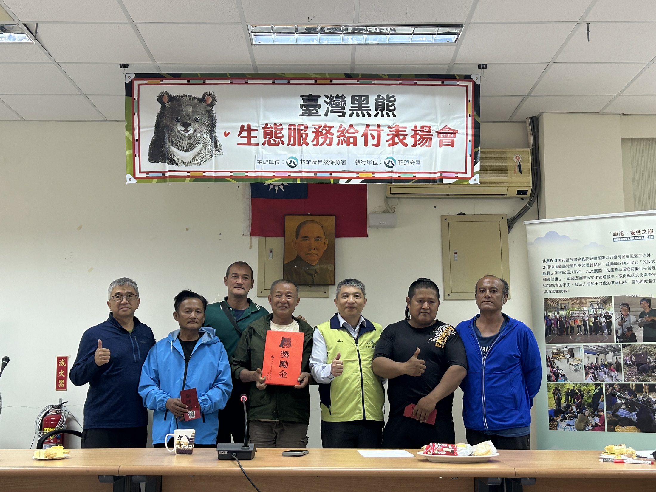 花蓮分署依據「臺灣黑熊生態服務給付方案」,於24日辦理公開表揚,感謝兩起事件通報人、梅醋工坊主人及蜂農共5位,分別頒發入侵通報獎勵金、入侵監測獎勵金,並補償蜂農蜂箱損失,感謝族人主動通報,積極配合相關防熊措施,將黑熊造成的損失降到最低,也大大避免了人熊衝突。砍草工代表林先生說,第一次看到黑熊非常開心,池姓蜂農則說,現在想起來仍餘悸猶存,雖然害怕但知道黑熊稀少很需要保育,也會積極配合相關防熊措施。今天表揚夥伴皆齊聲允諾,未來會持續參與保育臺灣黑熊的行動。