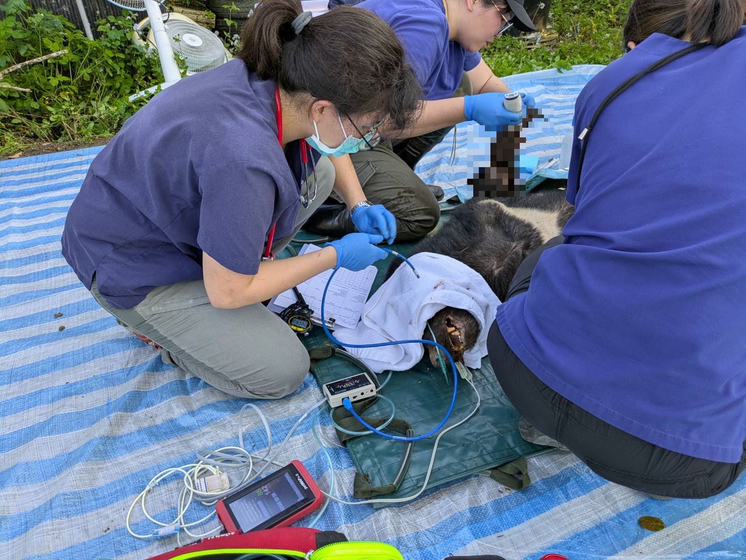 由於花蓮分署先遣人員於下午2點到達後,僅發現受困黑熊,其後救援隊伍陸續抵達,於下午4時啟動吹箭麻醉、秤重、檢傷等處置後,隨即送往池上野灣野生動物醫院,於晚間7時20分順利抵達。經初步檢查,受困黑熊為母熊,體重58公斤,左前肢因遭套索壓迫,呈中度腫脹,因此須住院治療觀察。
