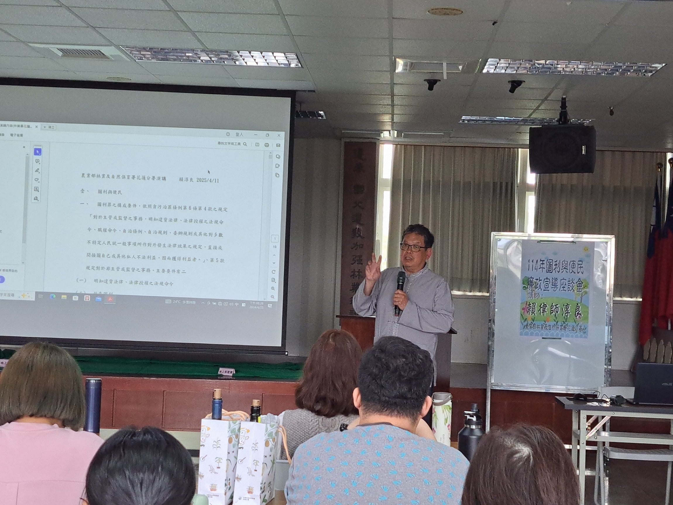 林業及自然保育署花蓮分署今(11)日下午舉辦「圖利與便民廉政宣導座談會」,邀請前花蓮高分院法官、現任華嚴法律事務所主持律師賴淳良主講。與會對象包括分署同仁、合作廠商,以及花蓮區農業改良場派員參加,透過專題演講深化法治觀念、強化行政效能,實踐為民服務的宗旨。