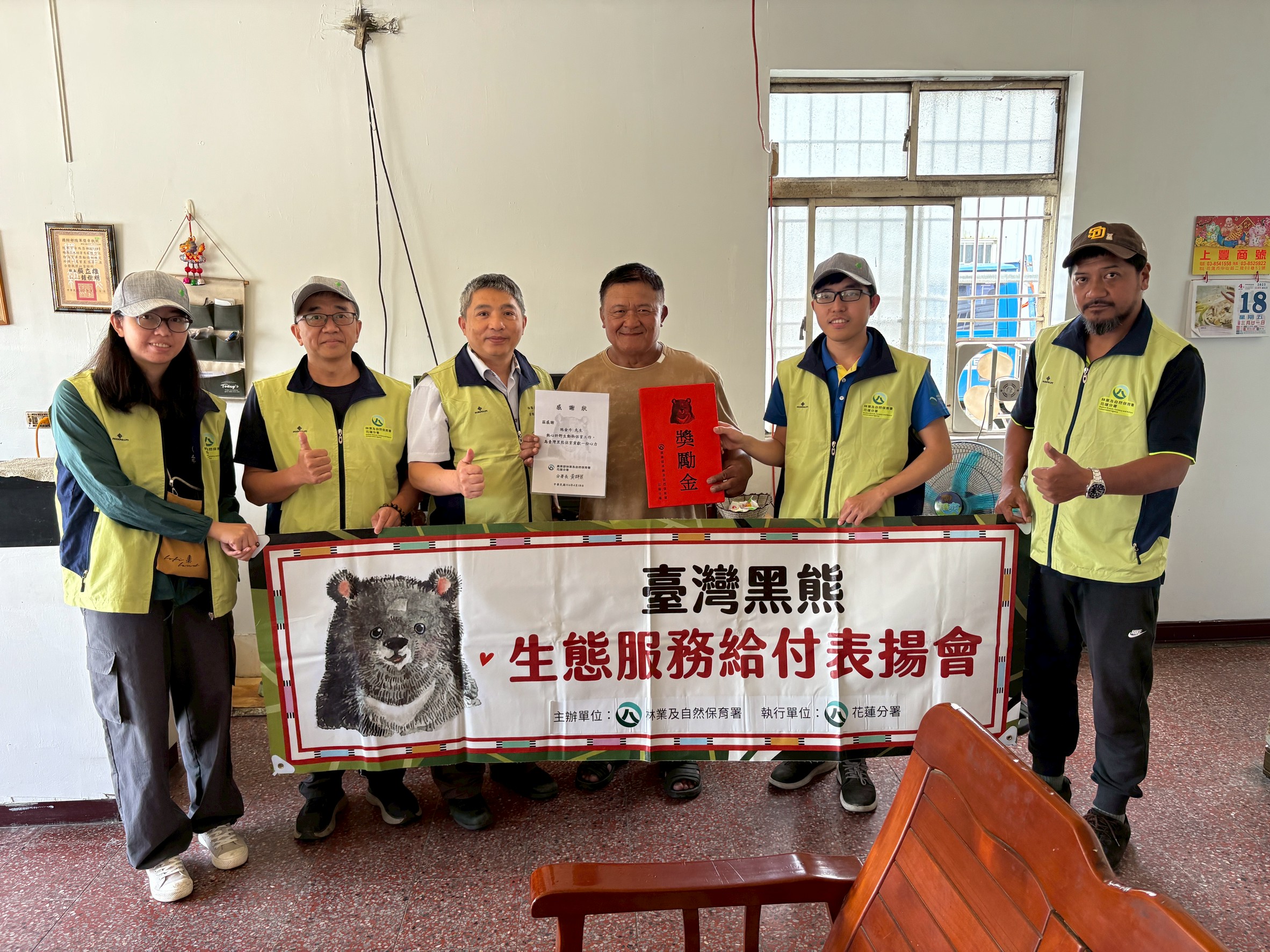花蓮分署依據「臺灣黑熊生態服務給付方案」,於18日由黃群策分署長前往表揚,感謝施姓族人即時通報,且還提供寶貴訊息,讓花蓮分署還能順利救援落單小熊,避免小熊因為無母熊照料而無法在野外生存。施姓族人表示知道卓溪地區有黑熊出沒,能解救受困陷阱的黑熊相當開心,做了好事也會帶來好的運氣。