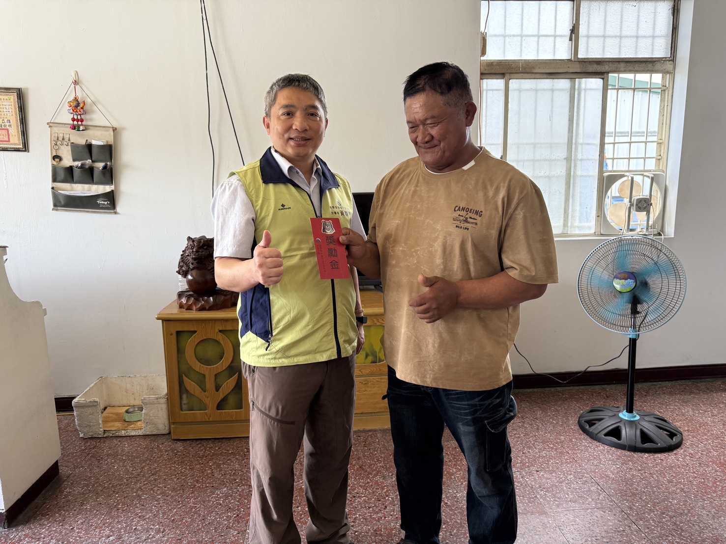 林業及自然保育署花蓮分署上(3)月27日接獲卓溪鄉卓溪村施姓族人通報,巡查苦茶園水路時發現臺灣黑熊受困陷阱,便立即透過通報系統通知林業保育署花蓮分署,順利救援該黑熊,花蓮分署黃群策分署長今(18)日前往部落頒發救傷通報獎勵金給施姓族人,感謝他立即的通報,使黑熊能即時脫困獲救。