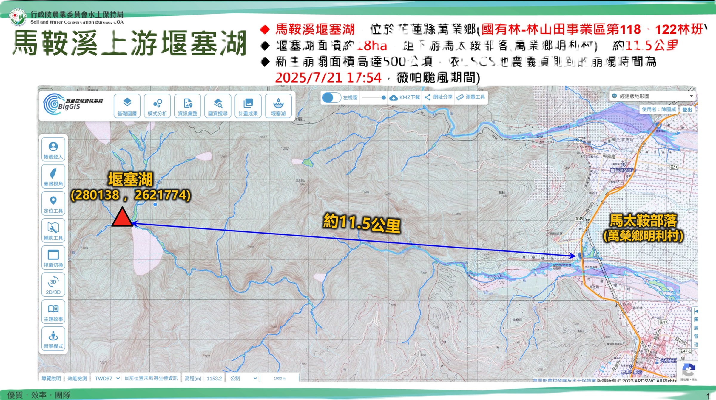 經初步評估,堰塞湖目前尚未溢流,距下游萬榮鄉明利村(馬太鞍部落)直線距離約9公里。若發生潰堤,研判下游聚落旁溪床水位約上升4公尺(抬升後仍低於右岸堤防與左岸住戶位置),馬太鞍溪橋水位約抬升2.5公尺(未超過二級警戒水位高程)。分署強調,聚落高程距離河床面尚有一段高差,目前對下游聚落無立即危險,請居民不必過度憂心。