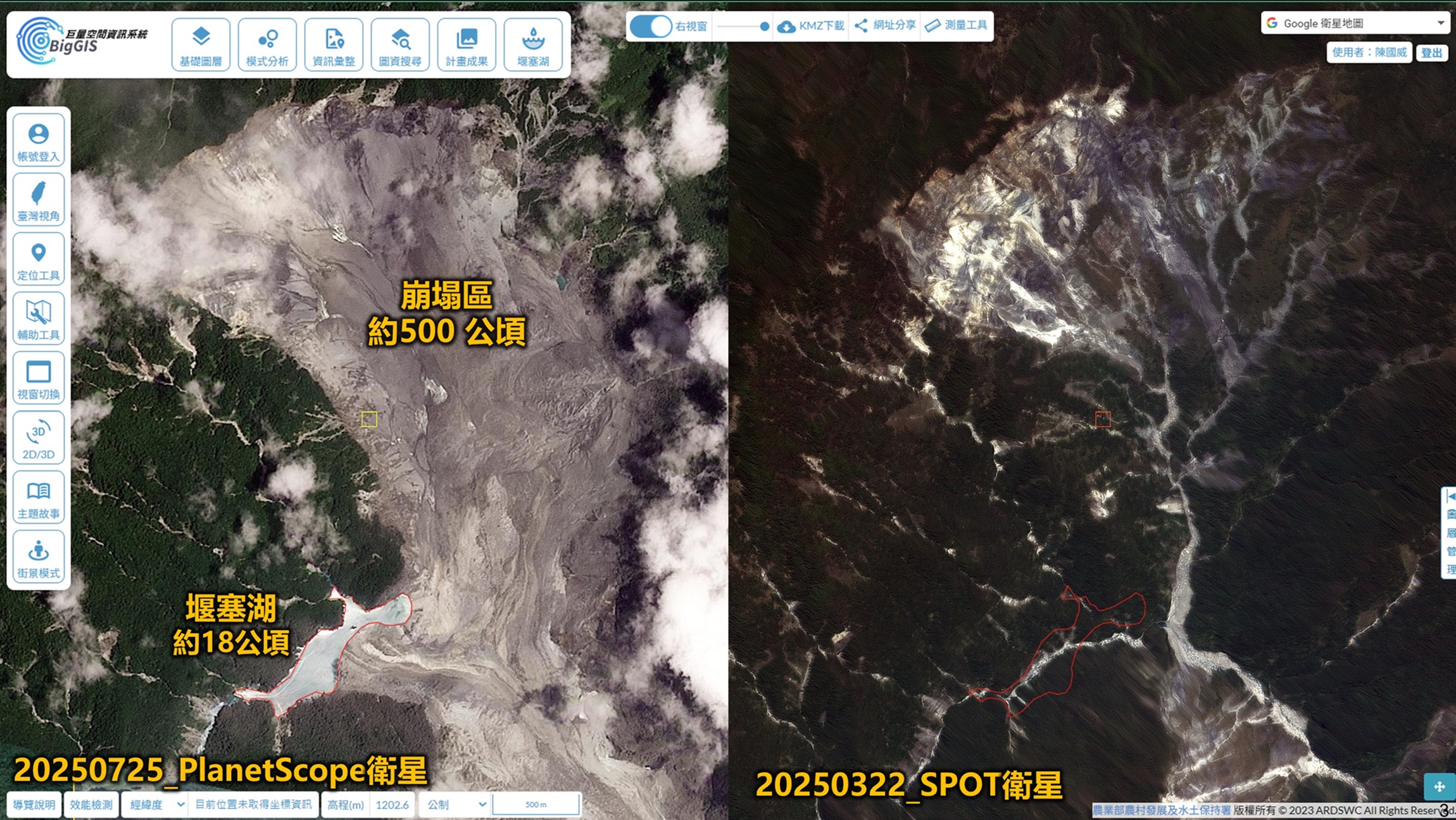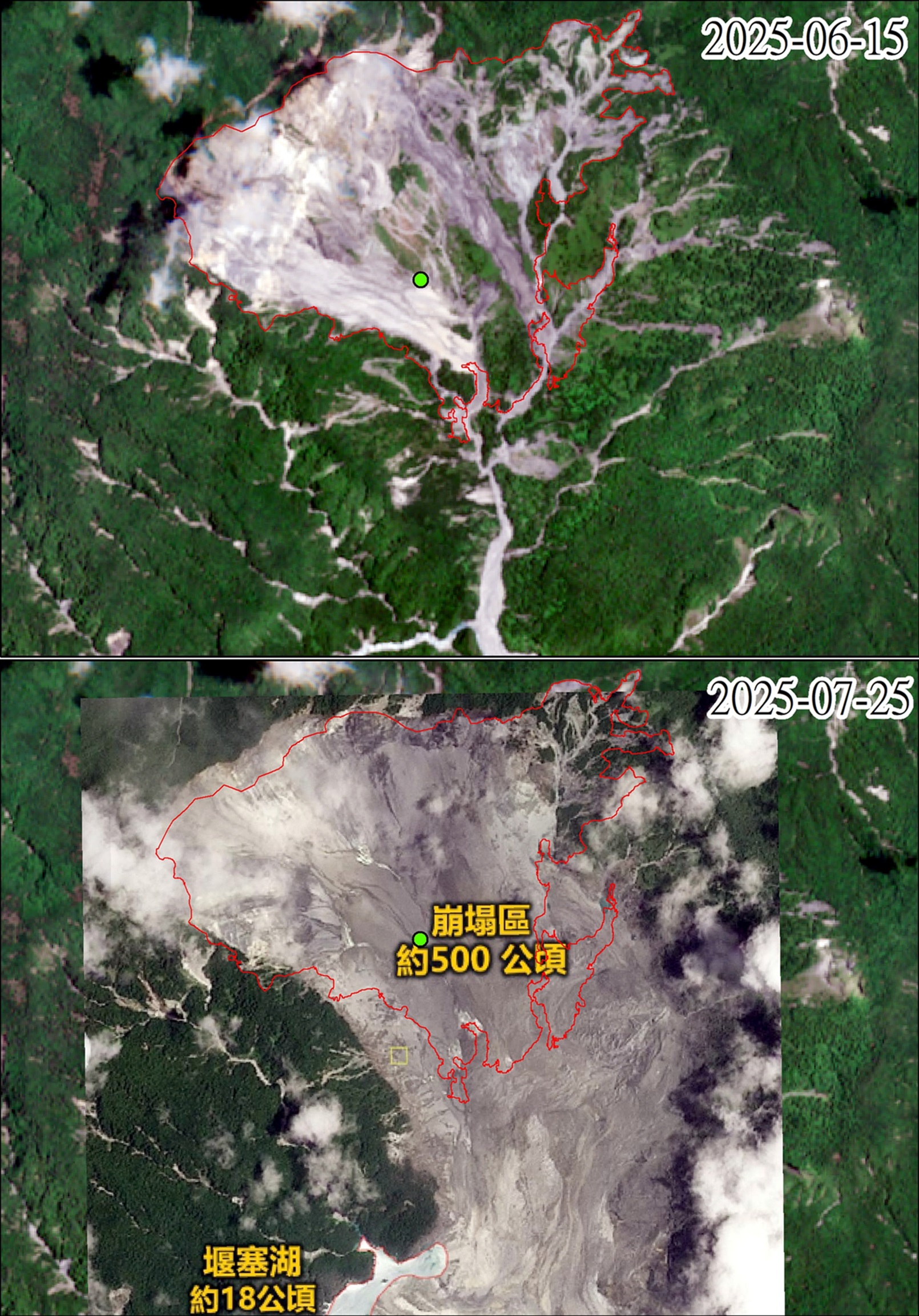 花蓮分署指出,堰塞湖湖面面積約18公頃、壩高約120公尺、迴水長度約1,000公尺,蓄水量約1,400萬立方公尺。此次事件造成之崩塌面積約500公頃,其中既有裸露地約300公頃,25日新生裸露面積約200公頃。