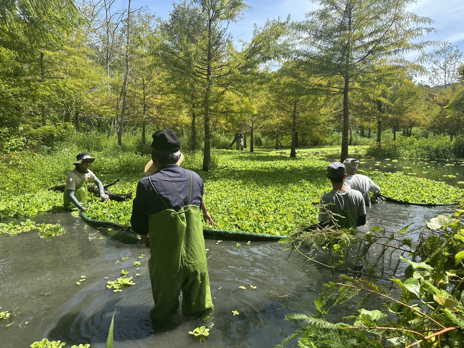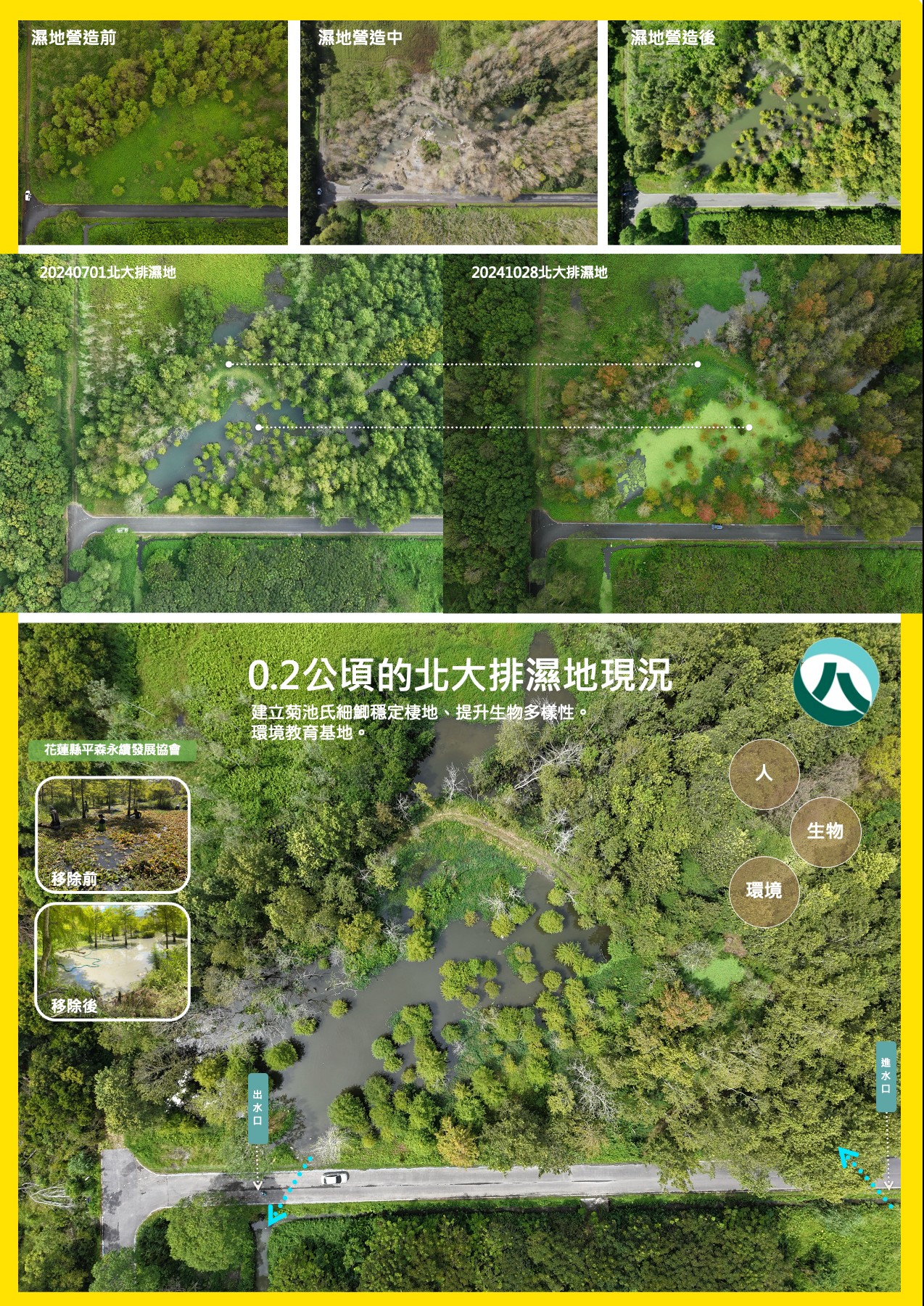本次活動由花蓮分署召集,並由觀察家生態顧問公司協辦,邀集荒野保護協會、花蓮縣平森永續發展協會、台糖公司花東區處、光復鄉大富村,以及東華大學環境學院副教授吳海音、楊懿如等代表,共同研討濕地長期保育策略。課程內容涵蓋北大排濕地營造與管理經驗分享、外來種移除技術交流,並安排現地操作,帶領學員實際投入大萍及其他入侵種的清除面積達0.2公頃,深化對棲地維護的認識。