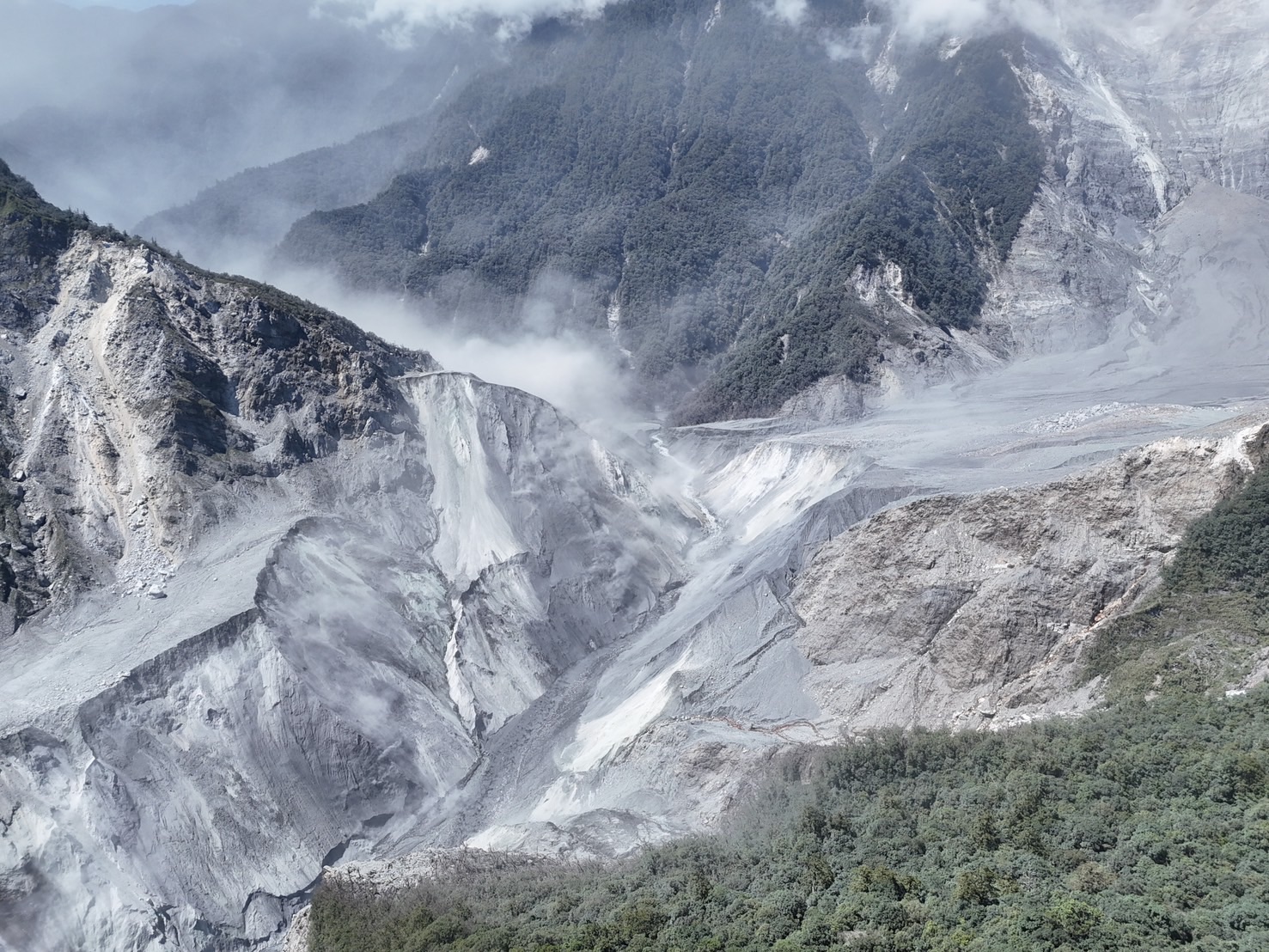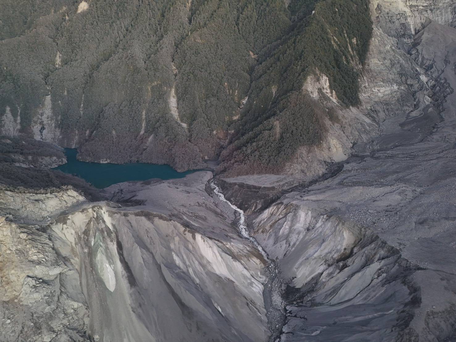 《林業保育署花蓮分署發布資訊》 一、今(10/5)日上午由無人機觀測顯示,馬太鞍溪堰塞湖水位高程1020.3公尺,湖區面積12.6公頃,蓄水量585萬噸(以上數據係以無人機觀測),潰決後至今水位高程已下降118.7公尺,蓄水量約為原來量體之6.4%。觀察從10/1~10/5期間航拍情形,堰塞湖體無明顯變化。 二、天然壩體及水流無異狀,水流穩定;考量溢流水道兩側持續下刷切割之坡面呈現不穩定、仍有水量持續匯入湖區以及下游土砂狀況尚未穩定,目前仍維持紅色警戒。 [照片說明] 114年10月5日上午空拍堰塞湖區,初判無異常變化。