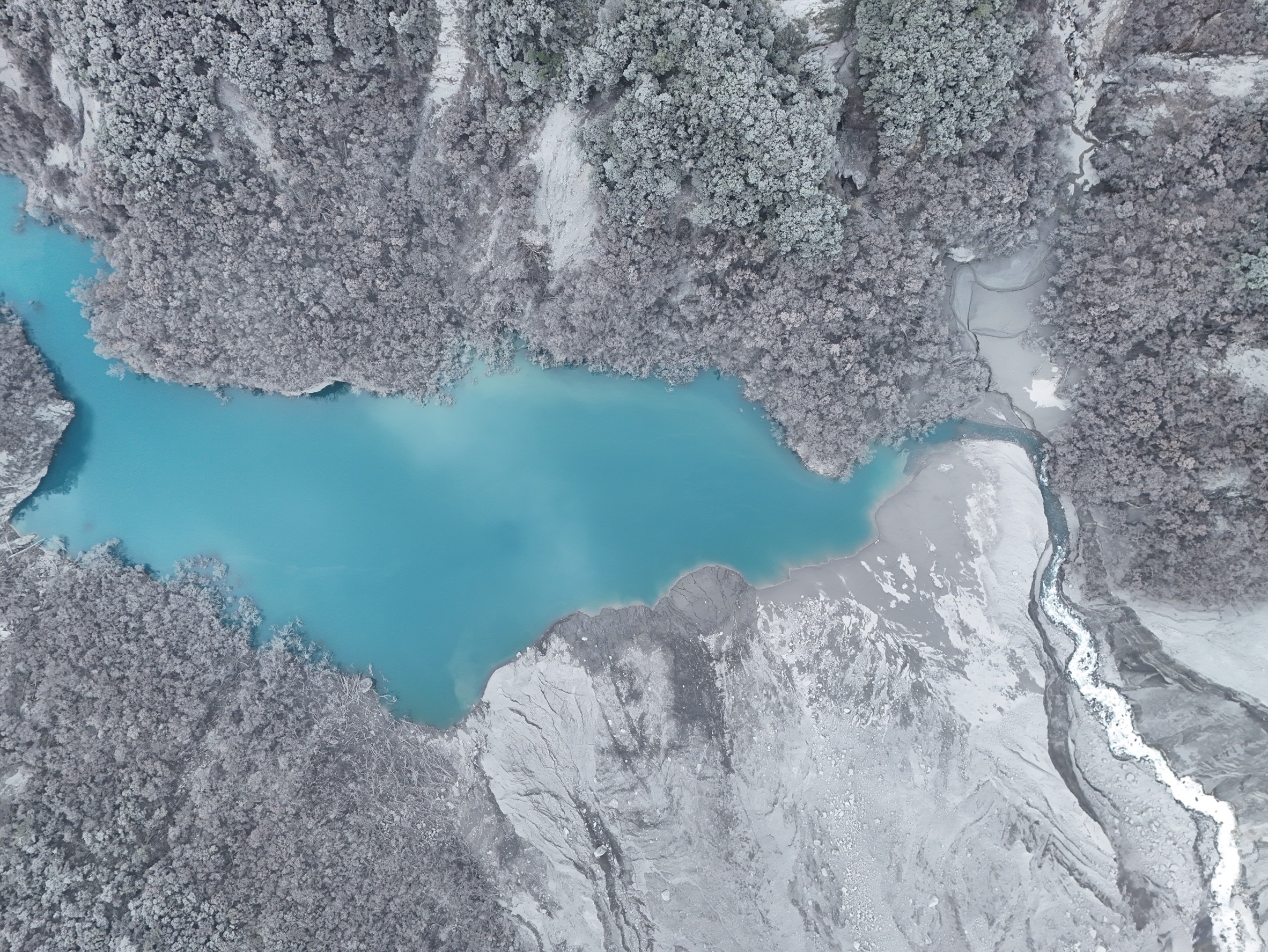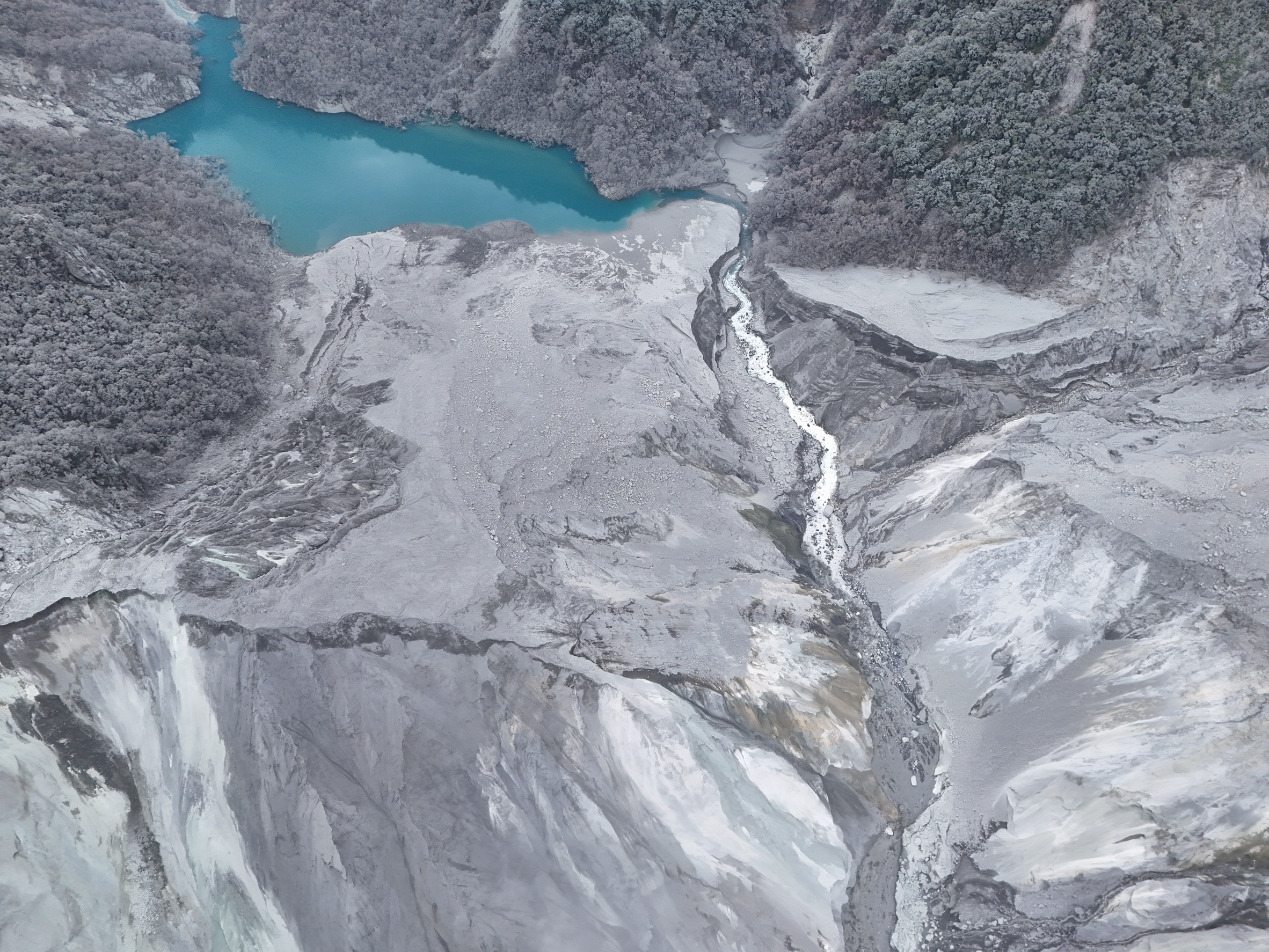 一、今(10/8)日上午由無人機觀測顯示,與昨(7)日相較幾無明顯變化,馬太鞍溪堰塞湖水位高程1020公尺,湖區面積12.6公頃,蓄水量585萬噸(以上數據係以無人機觀測),目前蓄水量約為原來量體之溢流前6.4%。 二、天然壩體及水流無異狀,湖水從溢流口穩定流出;考量溢流水道兩側持續下刷切割之坡面呈現不穩定、仍有水量持續匯入湖區以及下游土砂狀況尚未穩定,目前仍維持紅色警戒。 三、今(8)日上午7:52發生第 126 號顯著有感地震,林業保育署花蓮分署立即派員前往以無人機勘查堰塞湖結果無異常: (一) 比對地震前後網路攝影機、UAV空拍影像結果,堰塞湖僅天然壩下游兩側深槽有部分土砂崩落,惟堰塞湖無異常變化及無重新阻塞流路的情形。 (二) 微地動儀沒有偵測到大型新的崩塌,也沒有水流異常情形。 (三) 水利署下游水位站目前沒有明顯變化。 (四) 地震前後(7:40-8:10)影片已上傳https://youtu.be/s-YQlN_cByw [照片說明] 114年10月8日上午地震後空拍堰塞湖區,初判無異常變化。