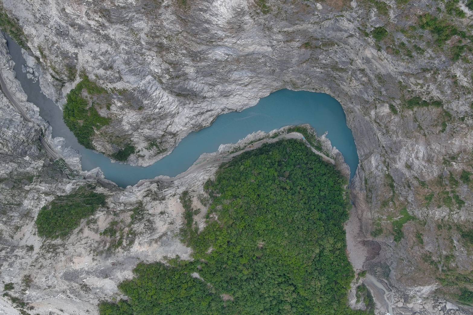 花蓮分署表示,太魯閣國家公園管理處布洛灣管理站接獲燕子口明隧道施工廠商回報,指步道約950公尺處立霧溪河段發生大規模崩塌,土石滑落後在河道形成天然壩體。該步道目前封閉,無人員傷亡,但情勢不容忽視。花蓮分署在接獲通報後立即指派人員趕赴現場,同步聯繫公路局以無人機進行空拍勘查,並掌握崩塌範圍與堰塞湖水位變化。